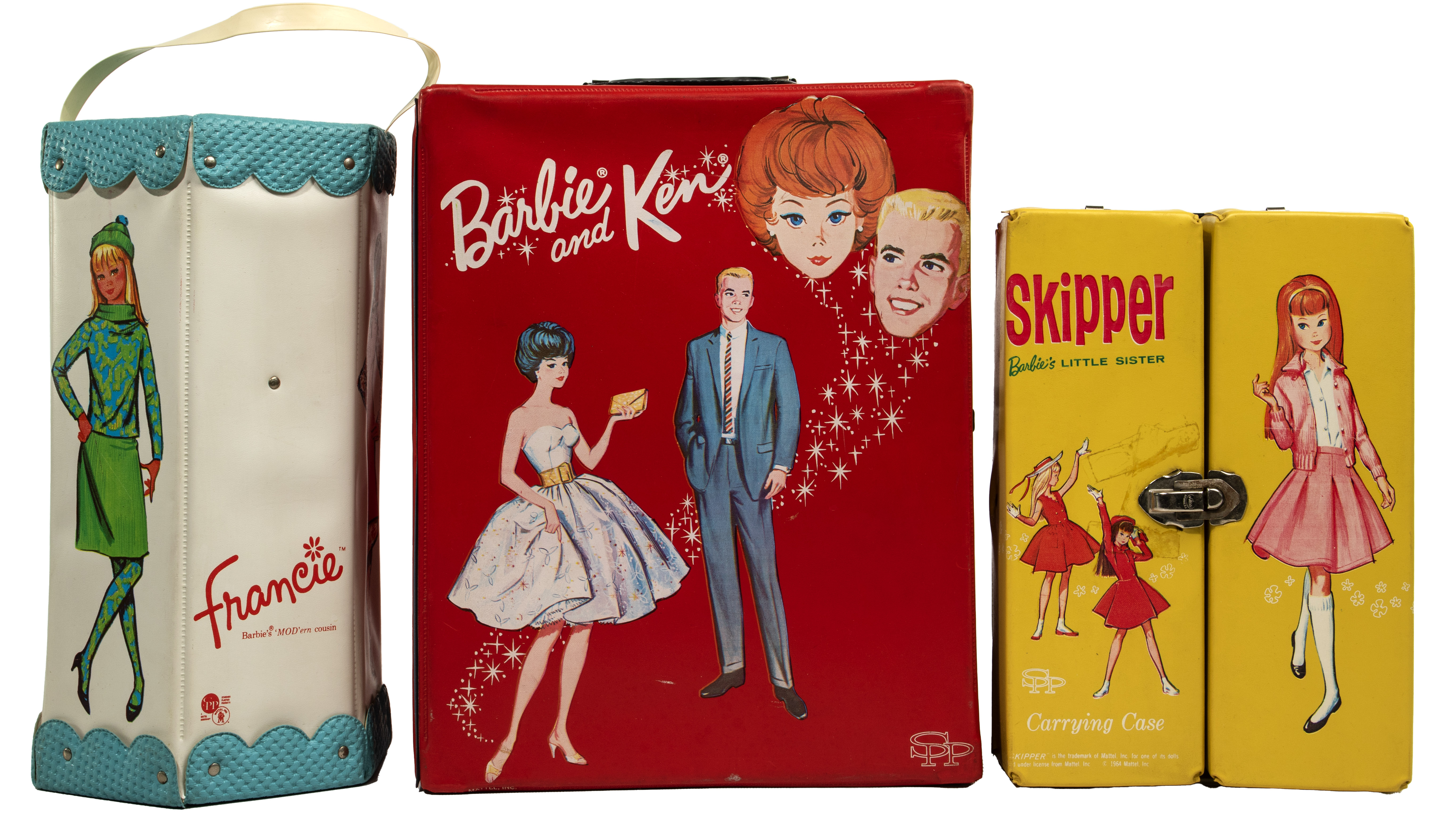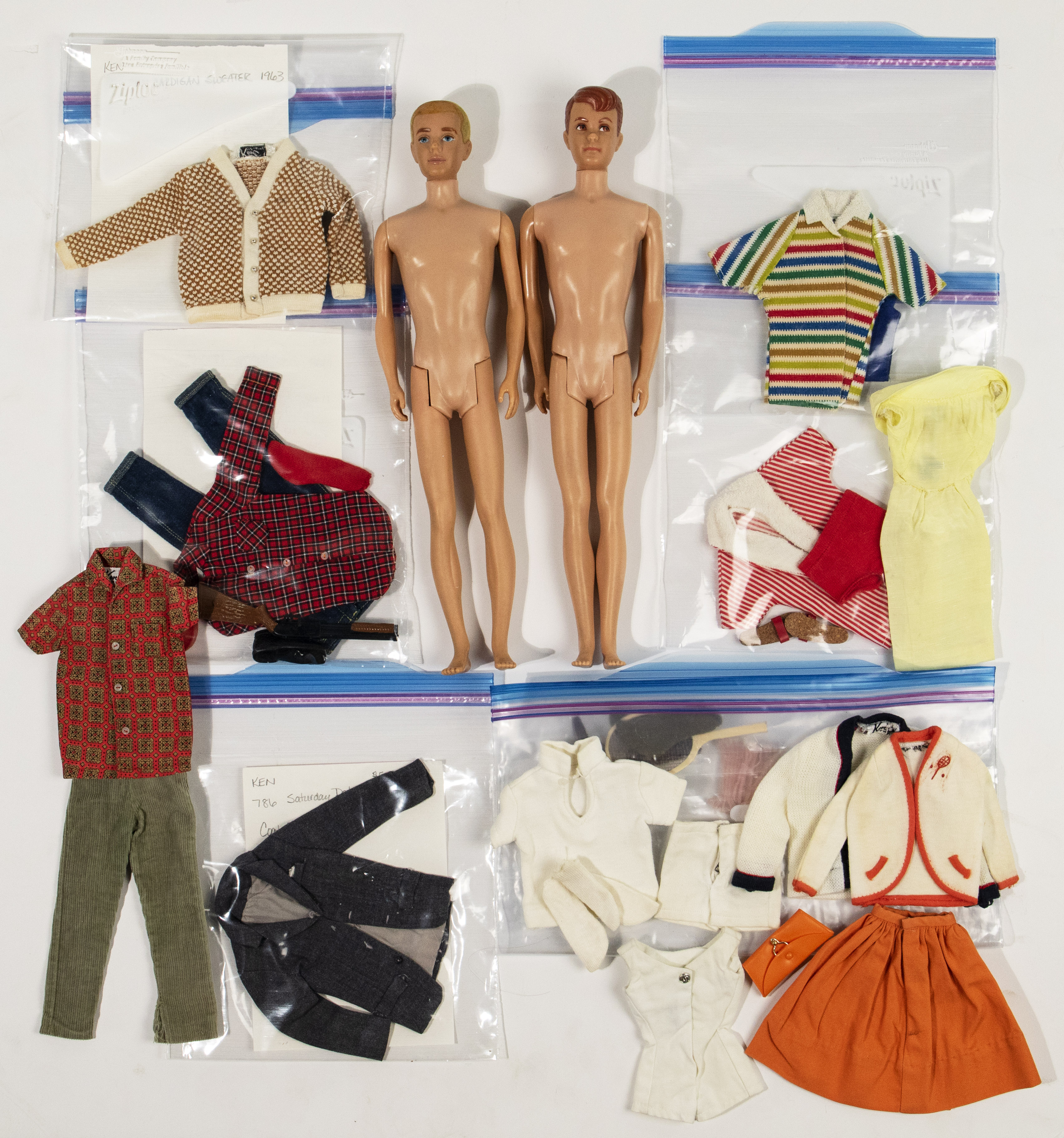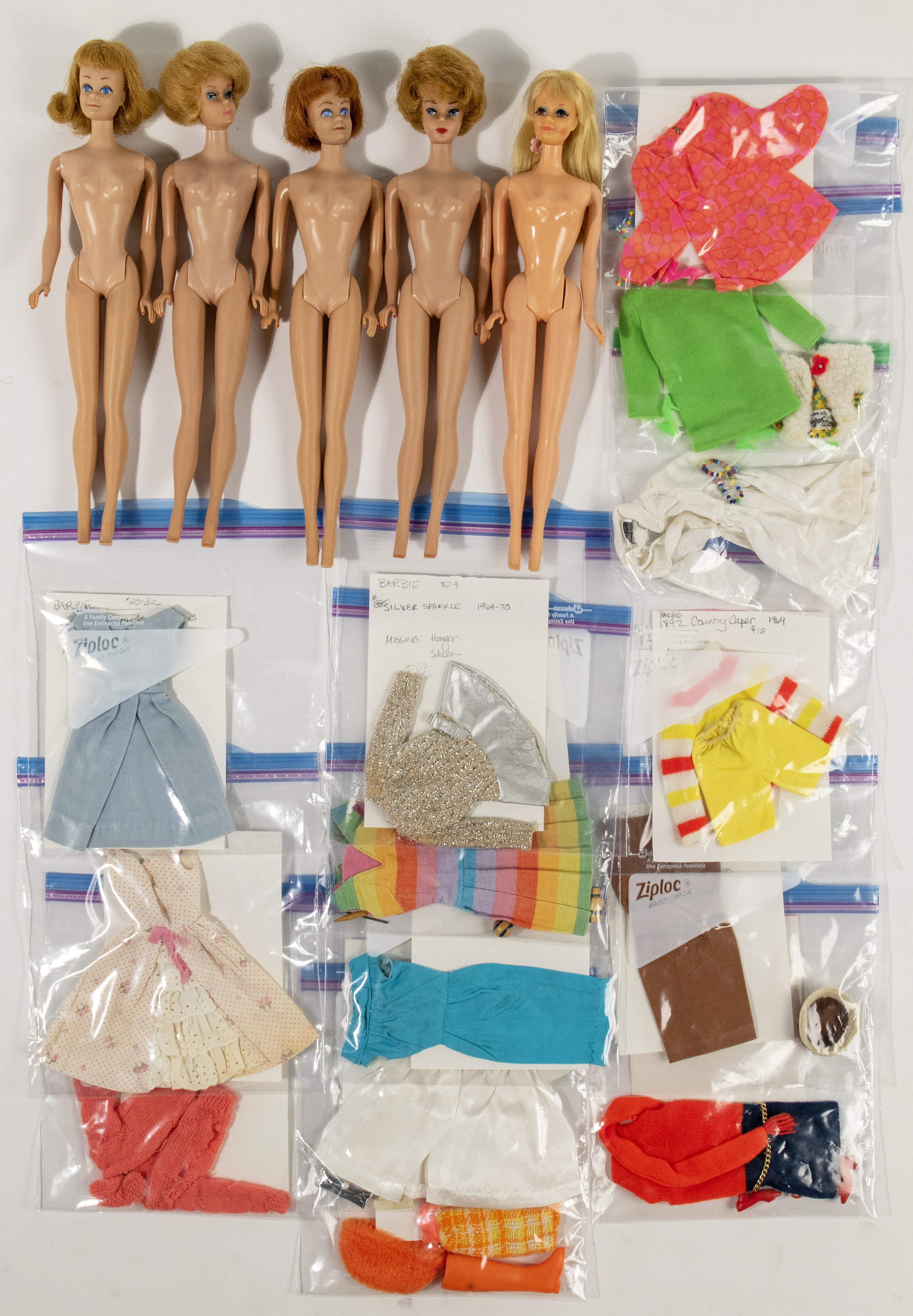 (10) dolls including (2) ‘Bubble Cut’ Barbies with (1) having original swimming suit; (2) Midges with (1) having original outfit; Skipper having original outfit, a Scooter having original outfit; a Francie having original outfit; a talking PJ having original outfit; a twist and turn Skipper having original outfit; a flocked hair Ken and an Alan, as well as (3) cases, for Barbie and Ken, Francie and Skipper; and (26) tagged outfits, some having original shoes and purses including several Francie ankle boots and including a near complete Barbie and Ken Tennis ensembles having tennis racket, and for Barbie ‘Sweater Girl’, ‘White Magic’, ‘Garden Party’; for Skipper PAK ‘Summer Slacks’, ‘Day at the Fair’, ‘Nighty Night’; for Ken ‘Going Hunting’, swim suits and coats; together with marked and unmarked clothes and accessories