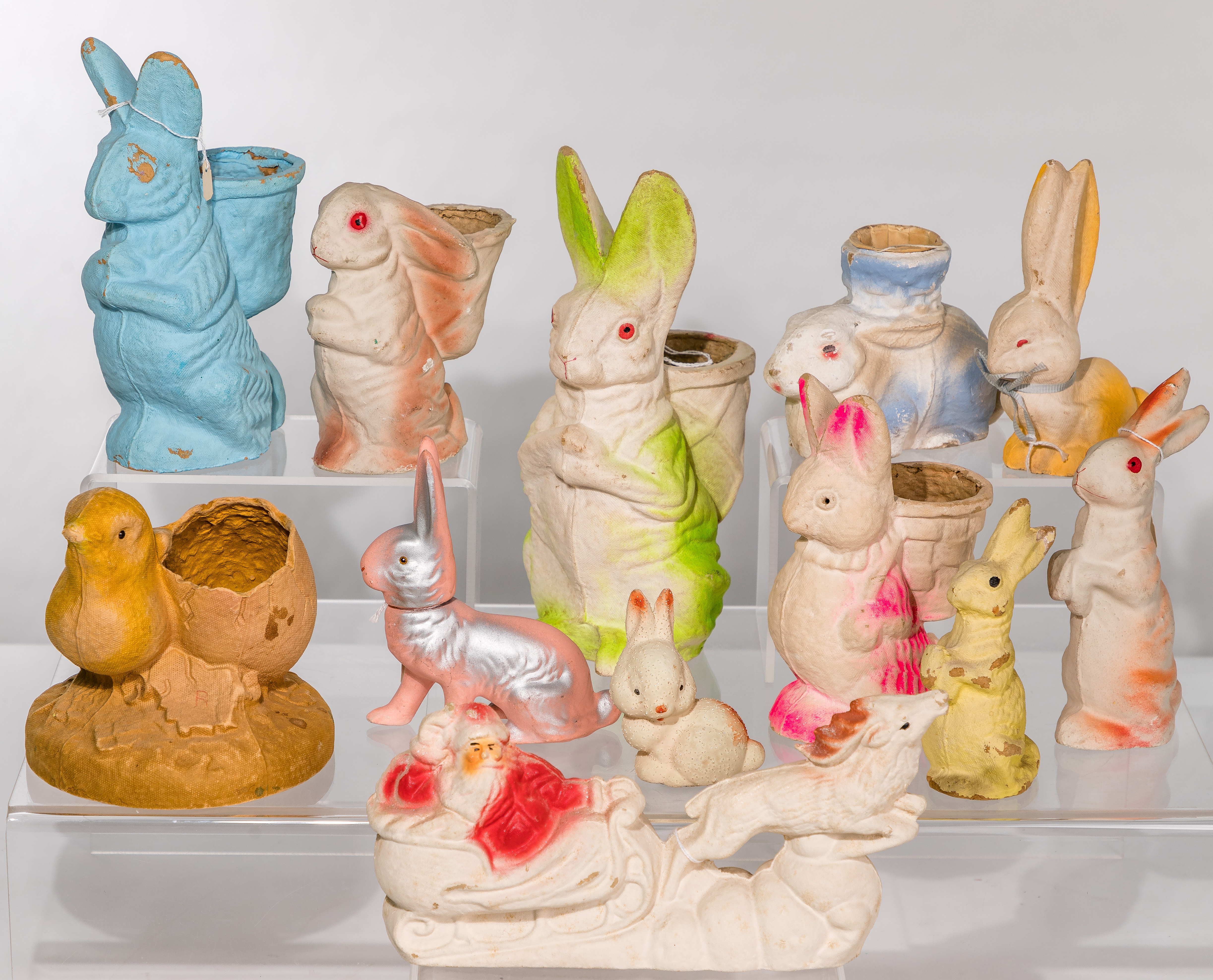 Approximately (25) items including a Disney ‘Musical Sweeper’, push and pull toys, stick horses and musical instruments; many cardboard and wood toys having painted or offset lithograph decoration, makers including Fibro, Dolly Toy Company, Gong Bell Manufacturing, J. Chen and Hill Toys; together with (12) papier-mache / egg crate holiday candy holders and figurines, primarily bunnies and a nursery scale