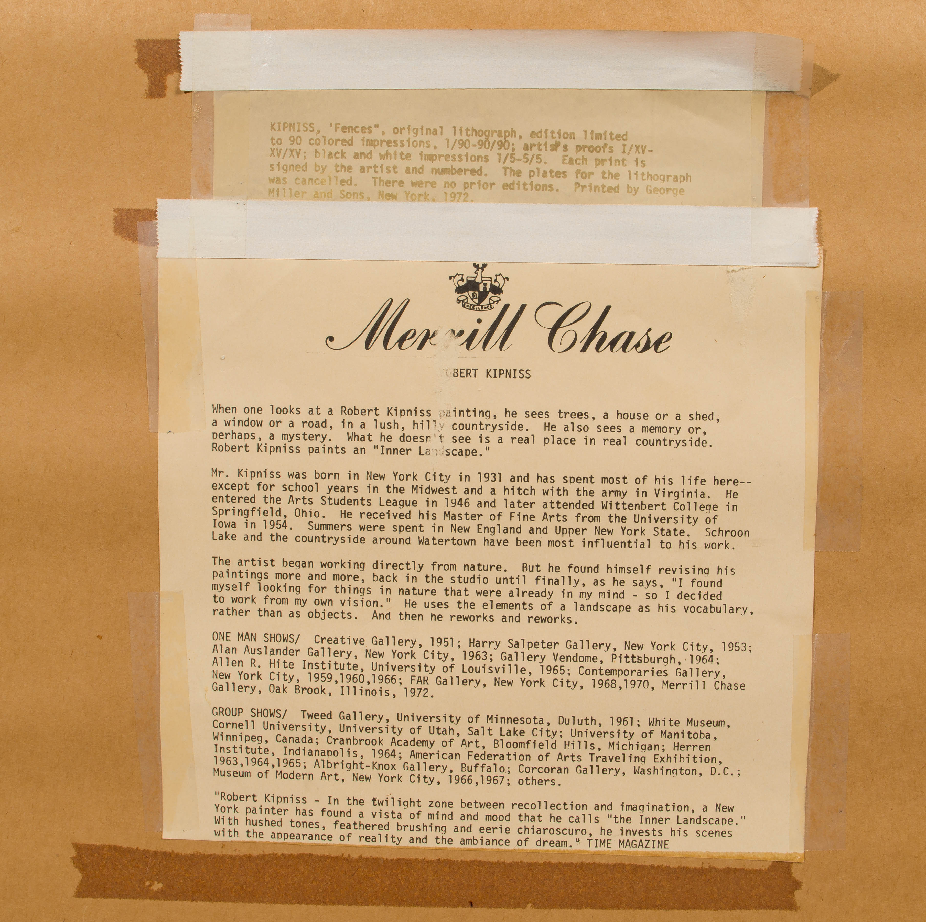 (2) items including an undated ‘Fences’, #82/90 color impression, retaining a Merrill Chase label with Merrill Chase COA and biographical page verso and an undated, untitled lithograph, #48/75 color impression, both signed lower right, both matted under glass in wood frames