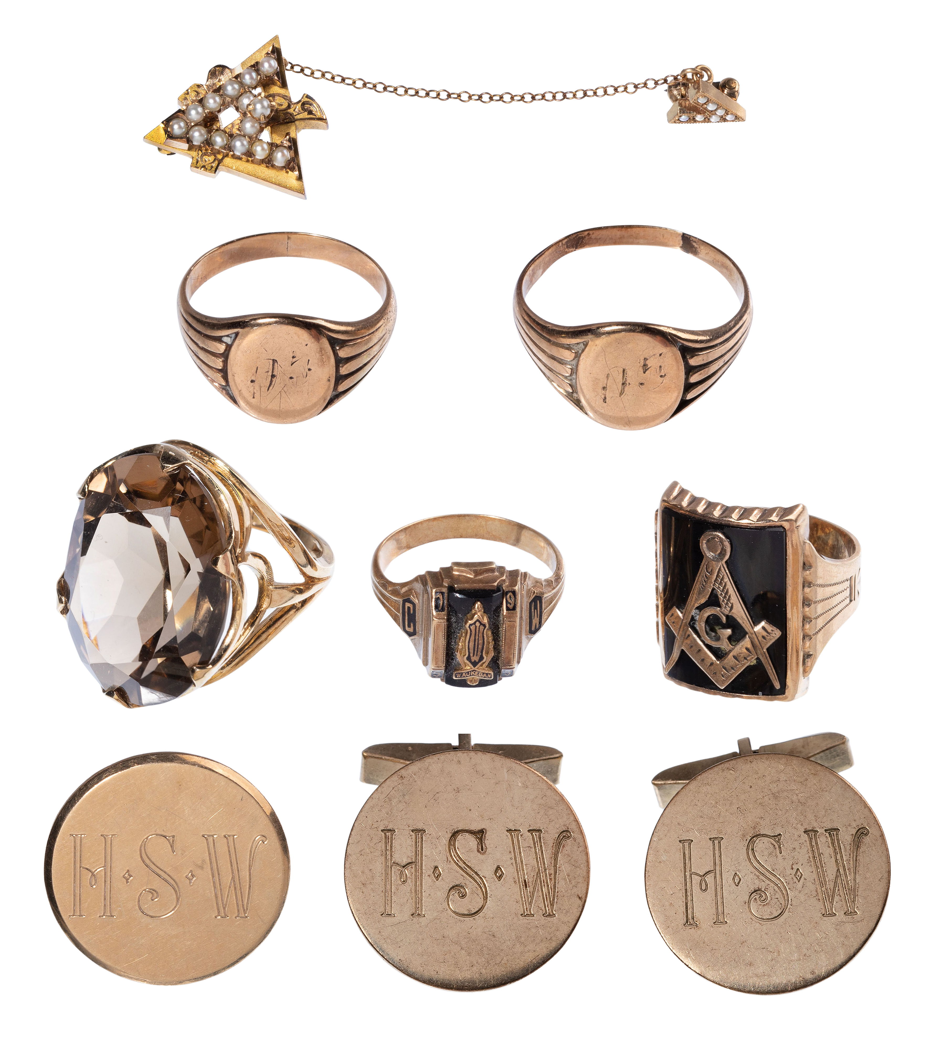 Condition: tarnish overall, scratches, cuff links and signet rings and sorority pin unmarked but XRF tested as 10k gold, Freemasons ring unmarked but XRF tested as 9k gold