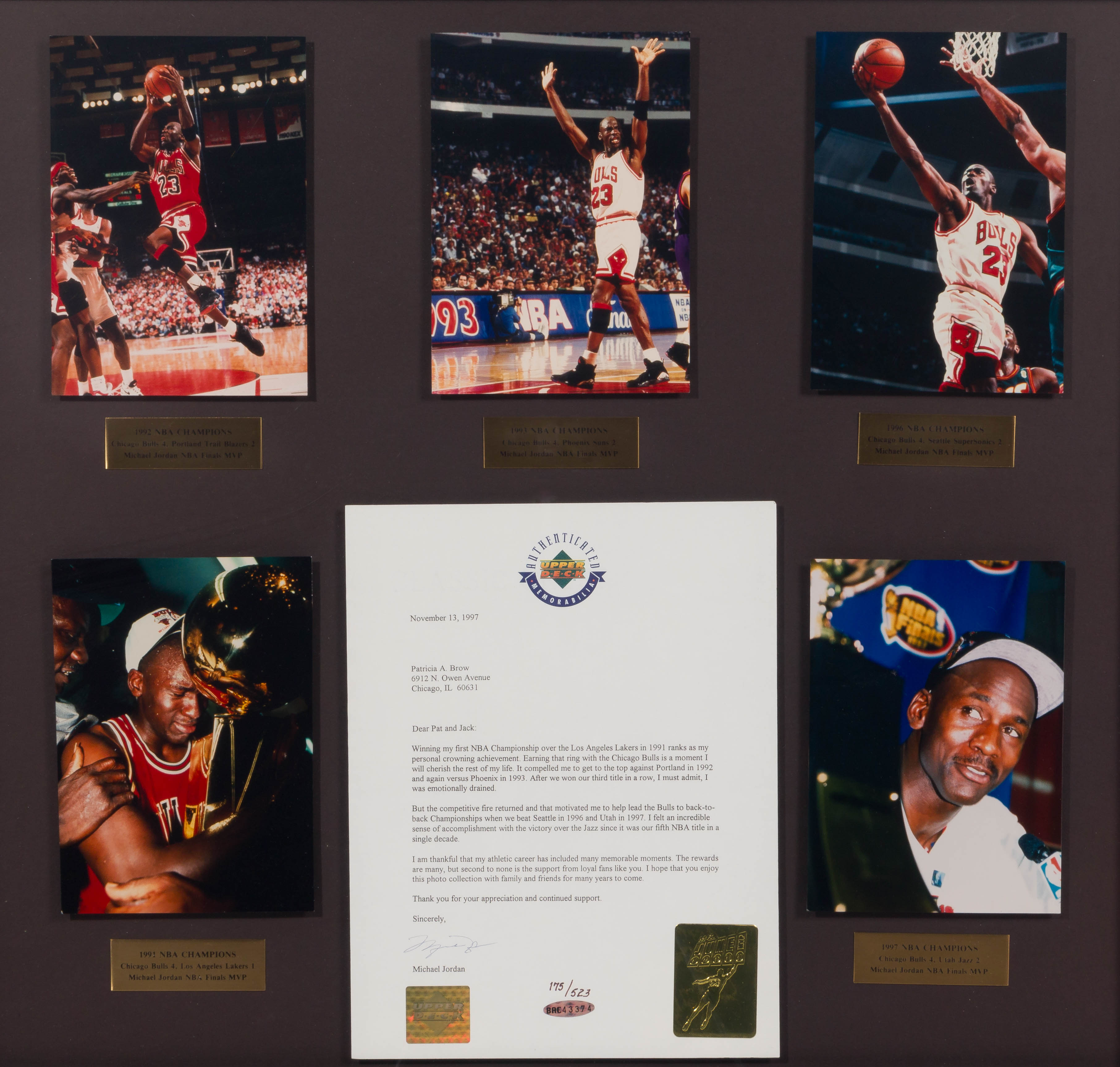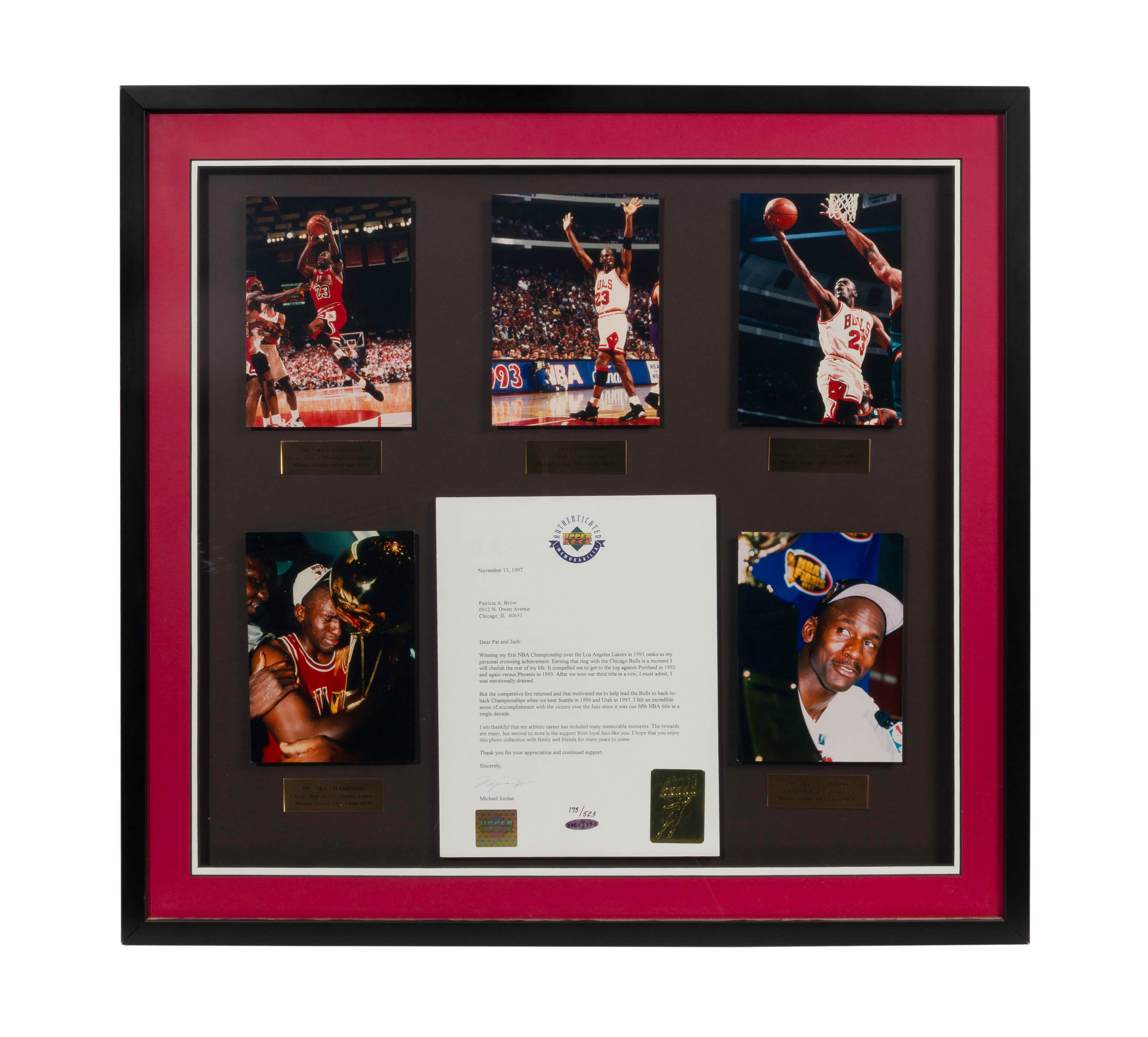 (5) Mr. June photographs from each championship year and a signed letter, #175/523, each photograph float mounted with an annotated placard beneath, under acrylic in a black frame, authenticated by Upper Deck, having both the Upper Deck hologram seal and a certificate of authenticity