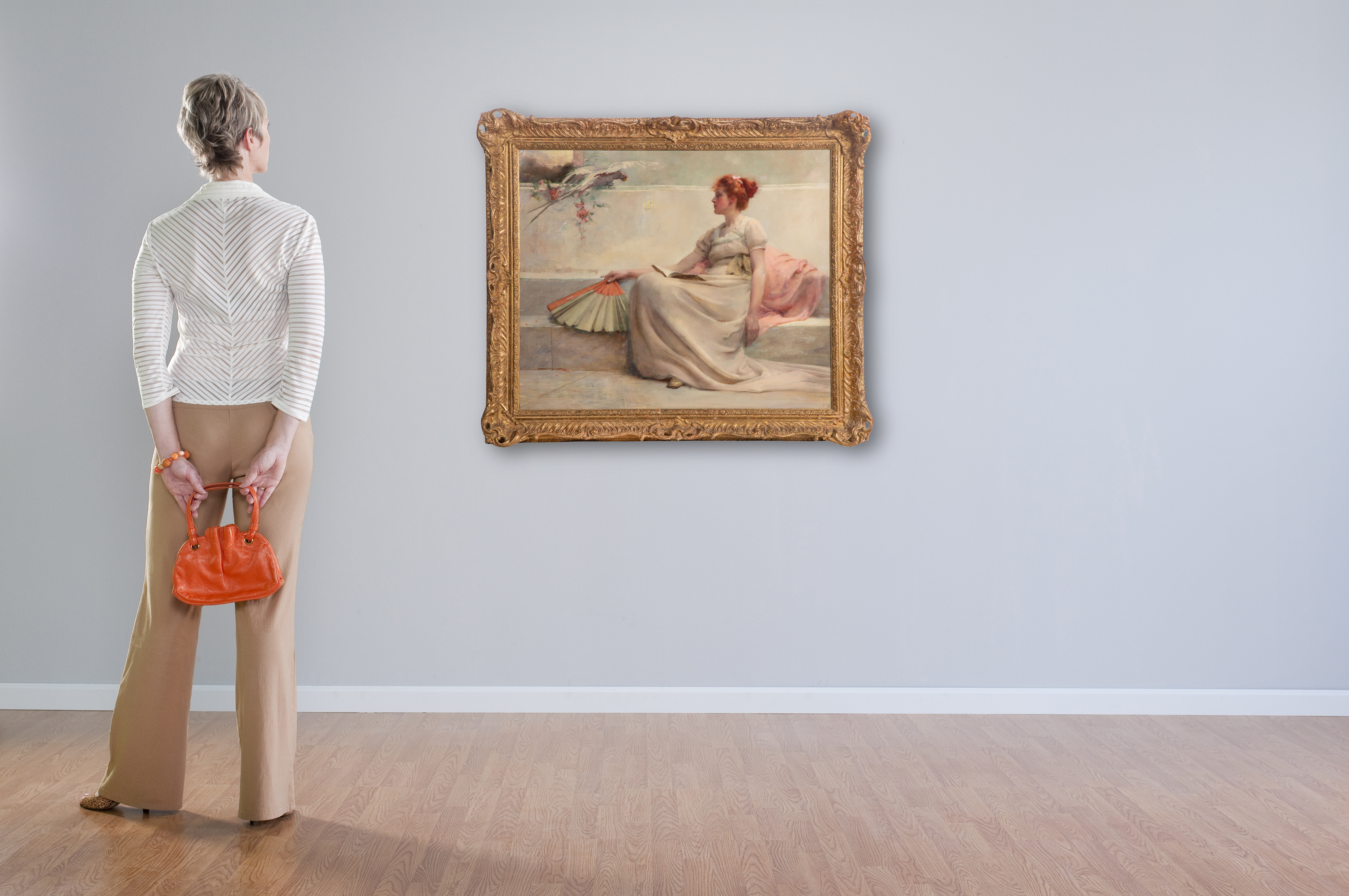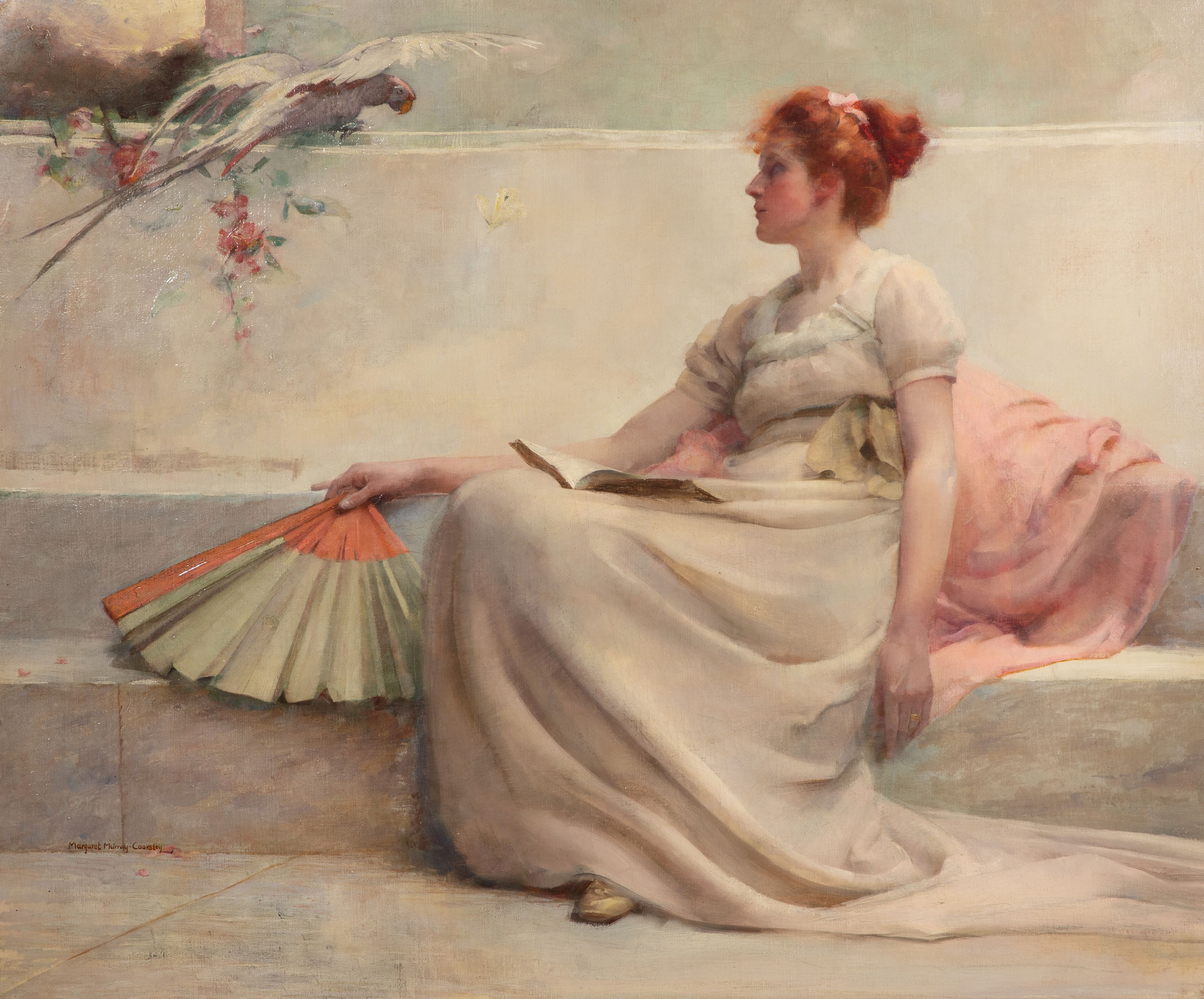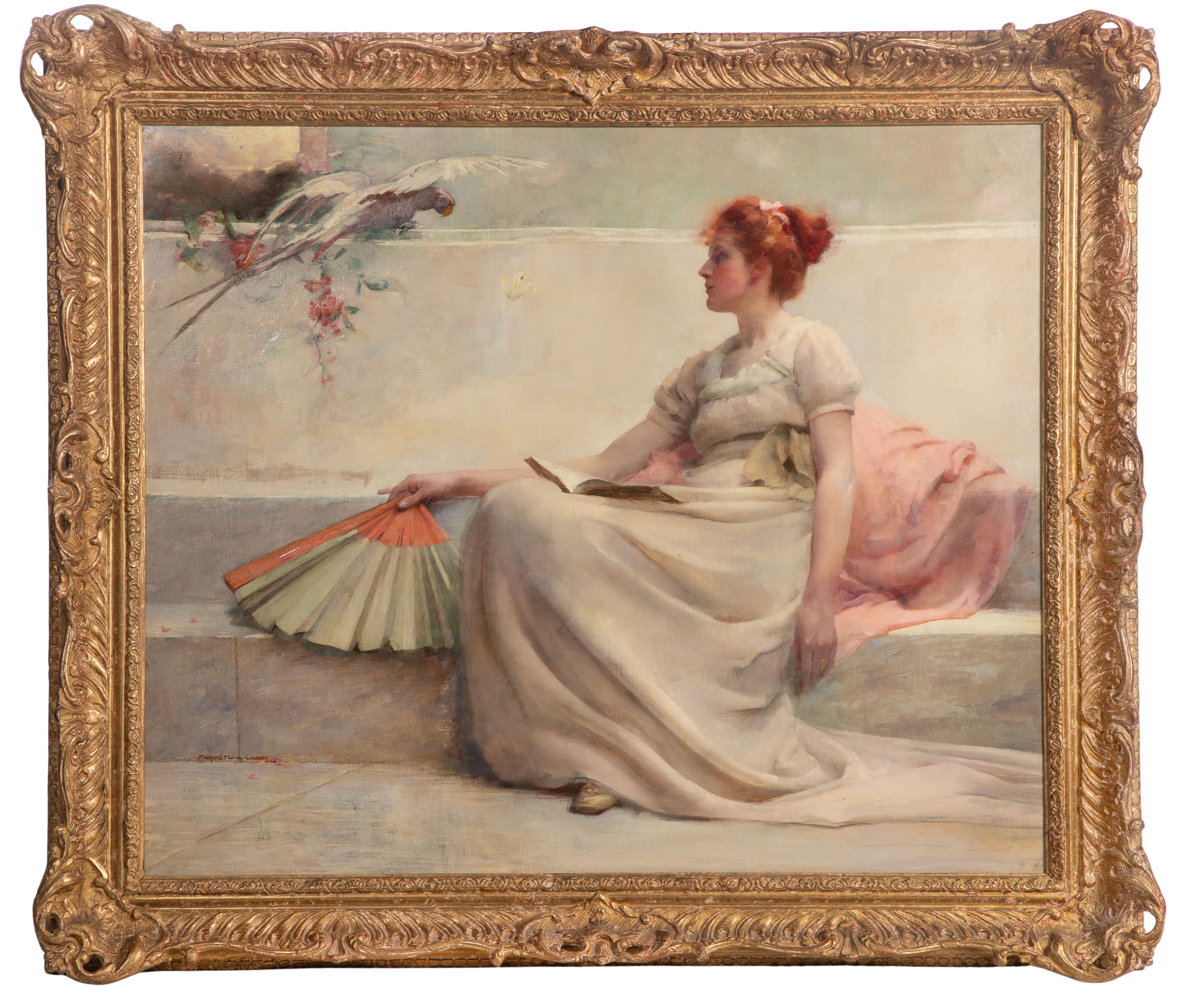 Undated, spuriously signed lower left, depicting a seated woman viewing a parrot on the wall behind her, being a copy of a painting (altered, having a parrot on the wall) by Mary Groves (English, active 1883-1933), in a gold-tone gesso on carved wood frame, retaining Marshall Fields, Chicago hang tag