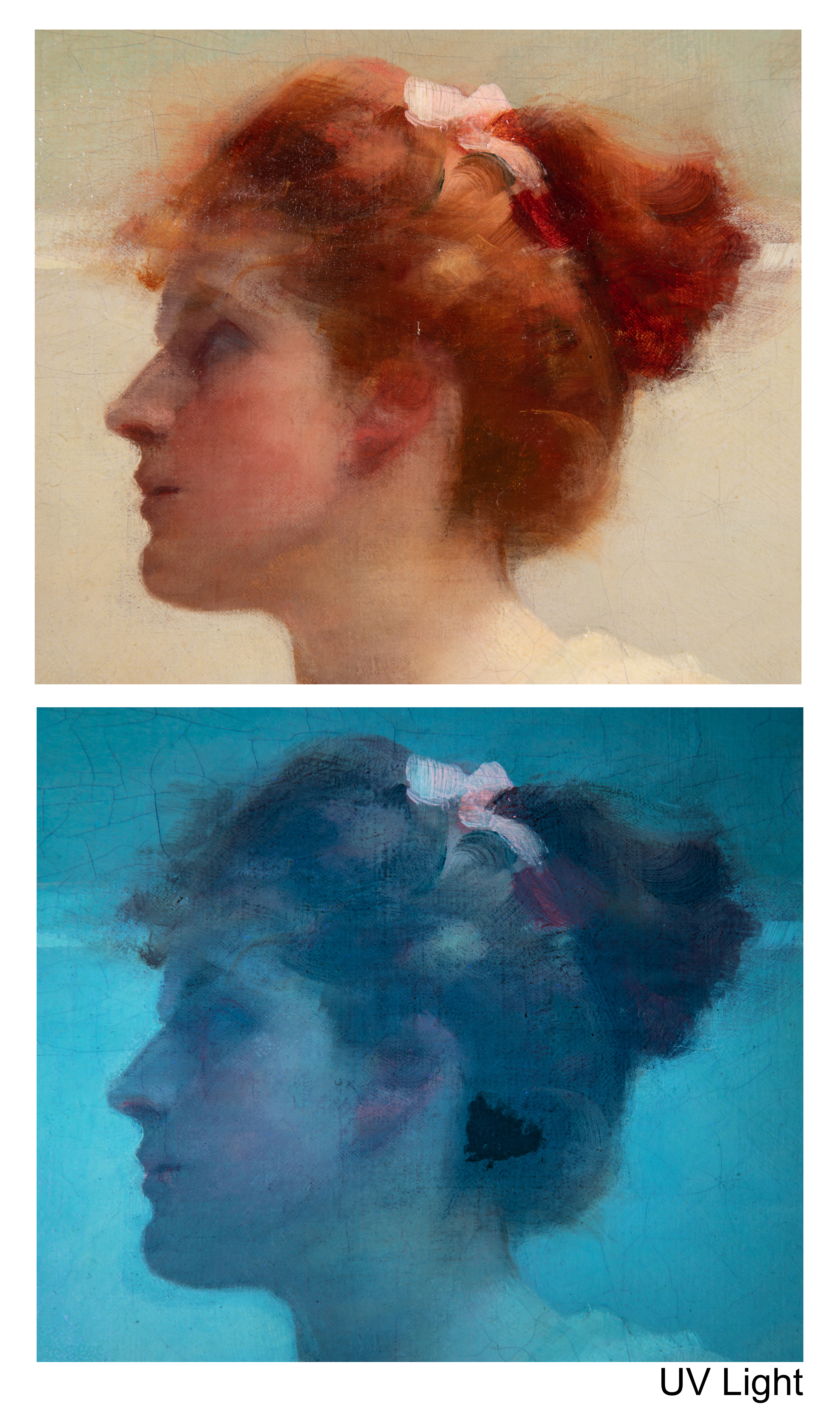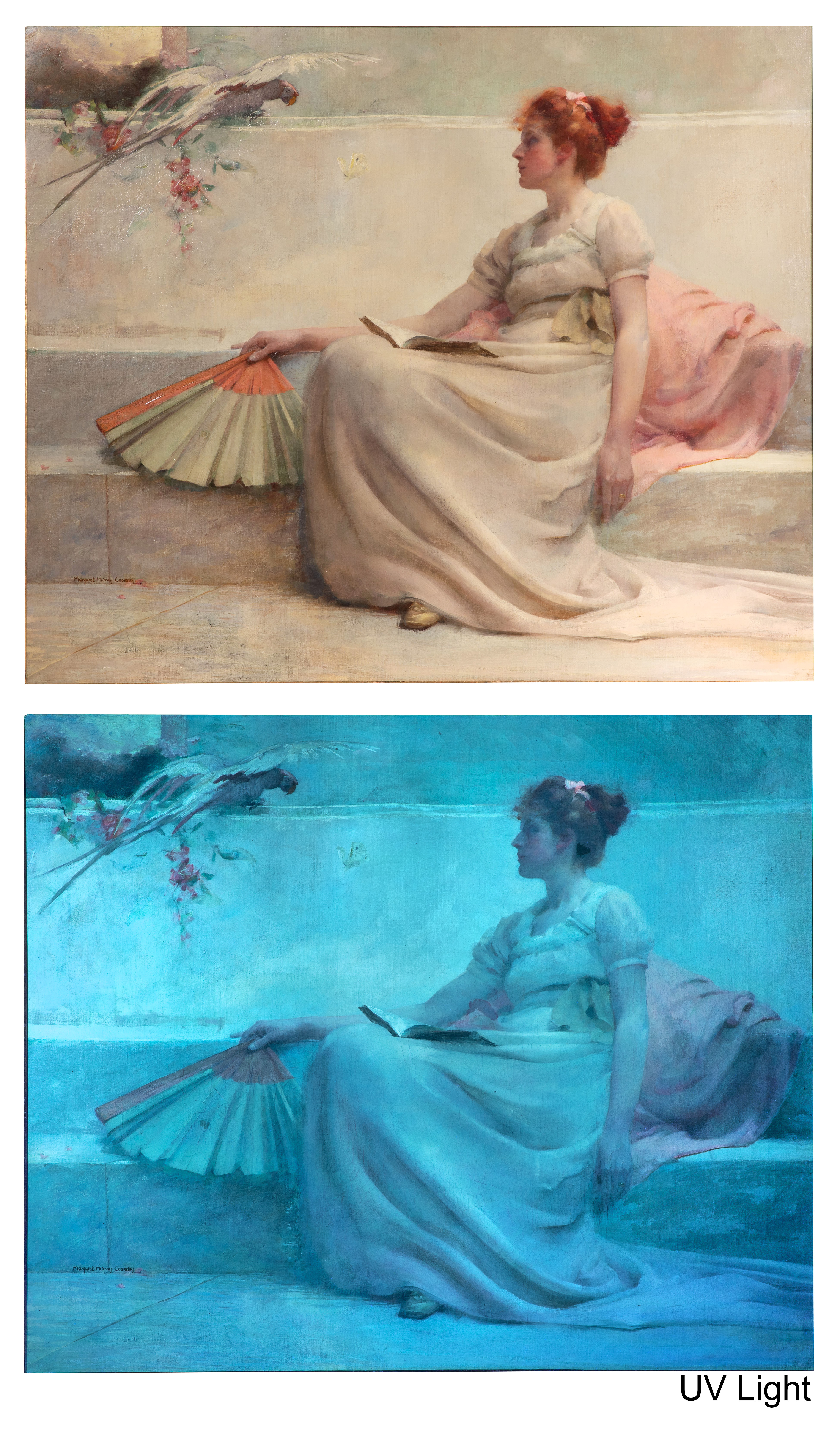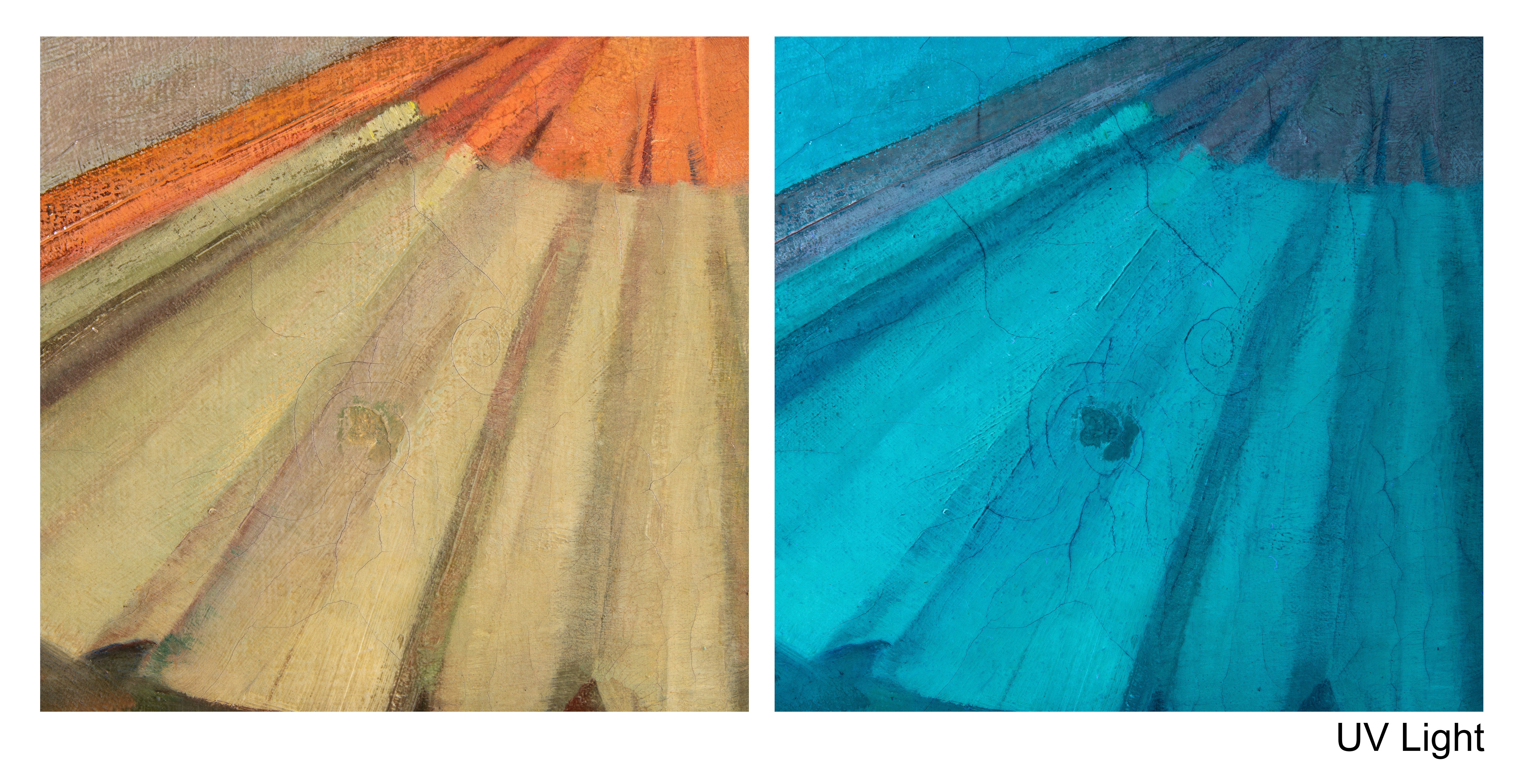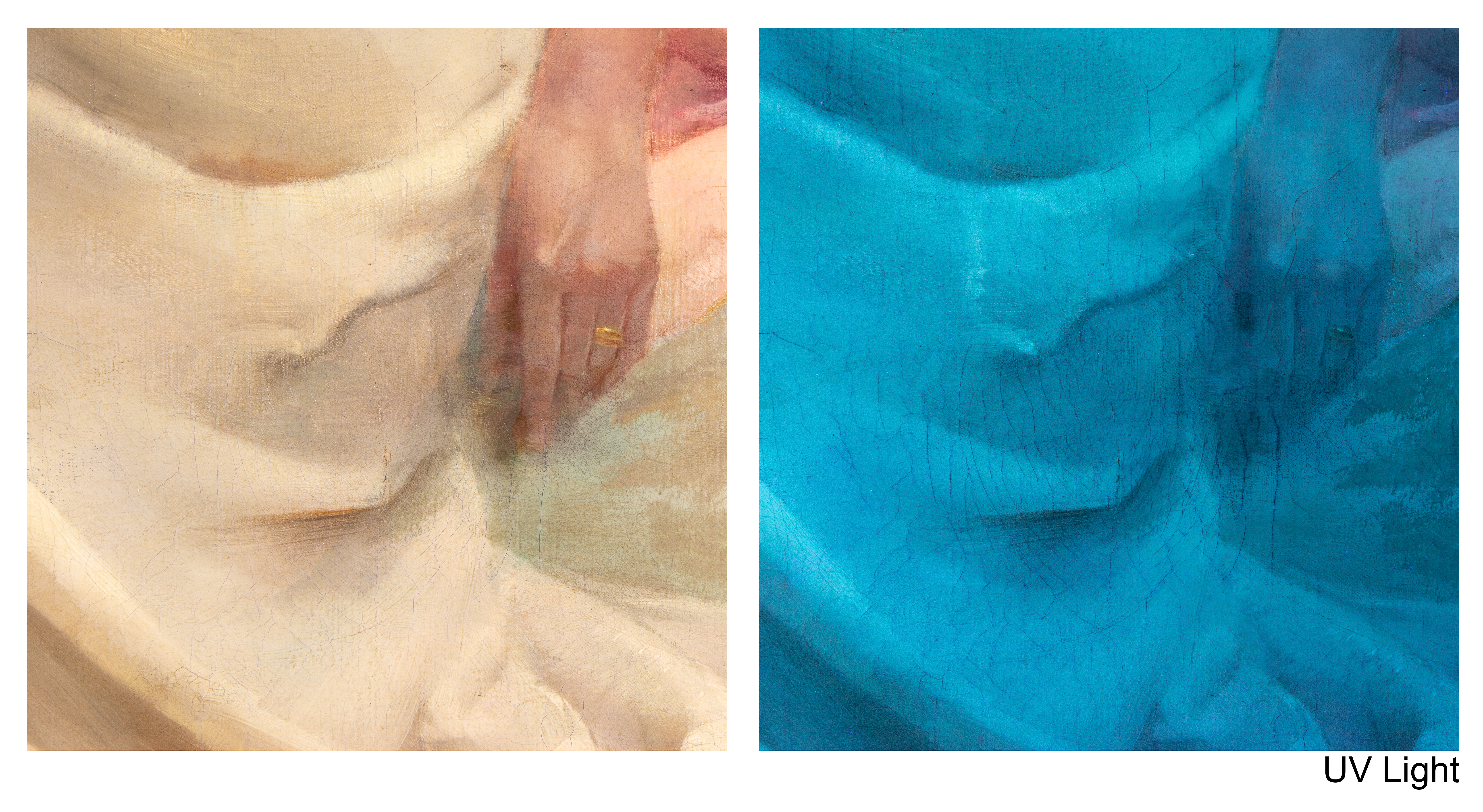 examined under UV light, having craquelure overall, minor paint losses on upper right and left sides, slight paint chipping to upper left corner, hair, hand and fan having inpainting, hand and fan having two puncture repairs, back having traces of efflorescence, frame having light wear
