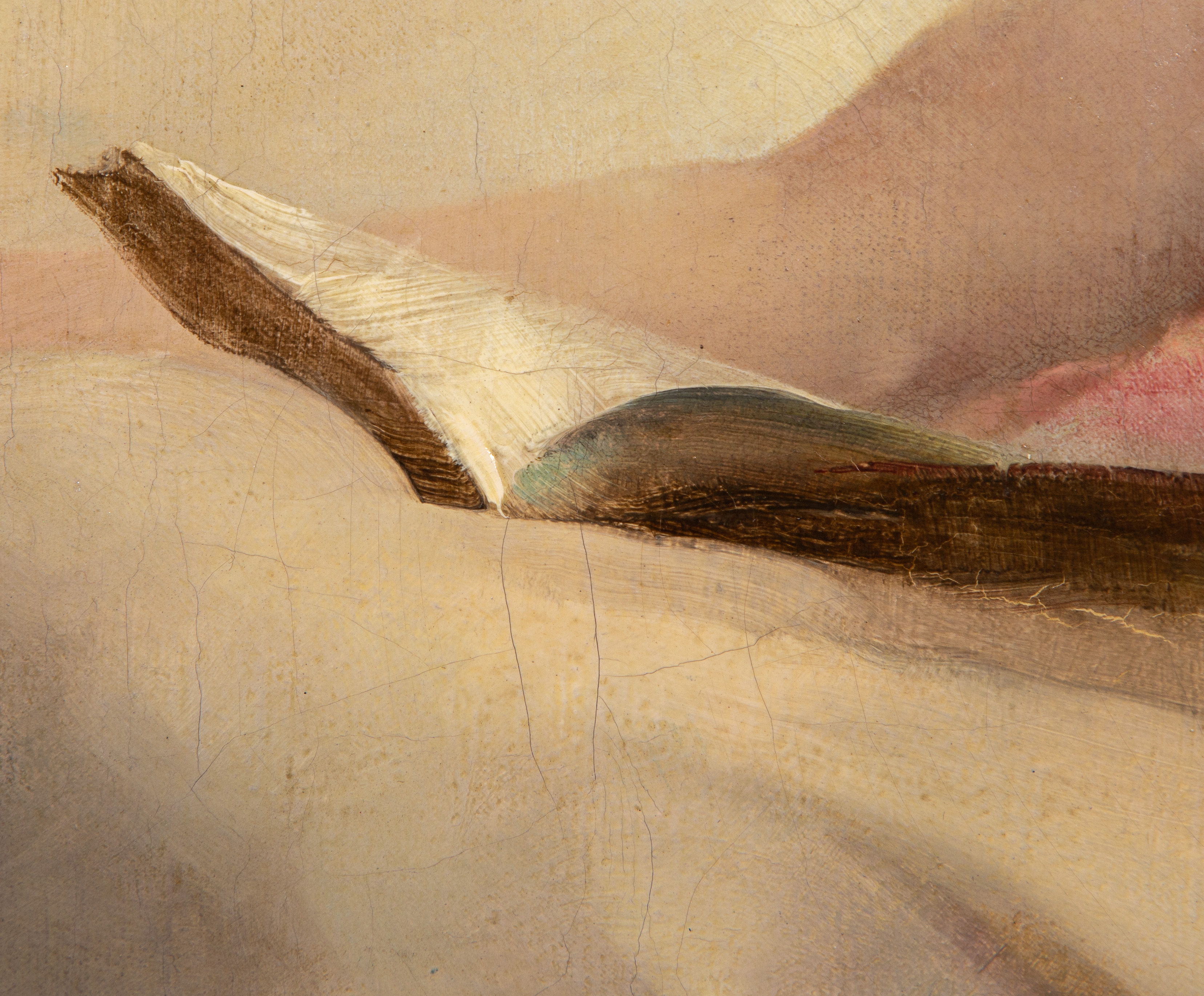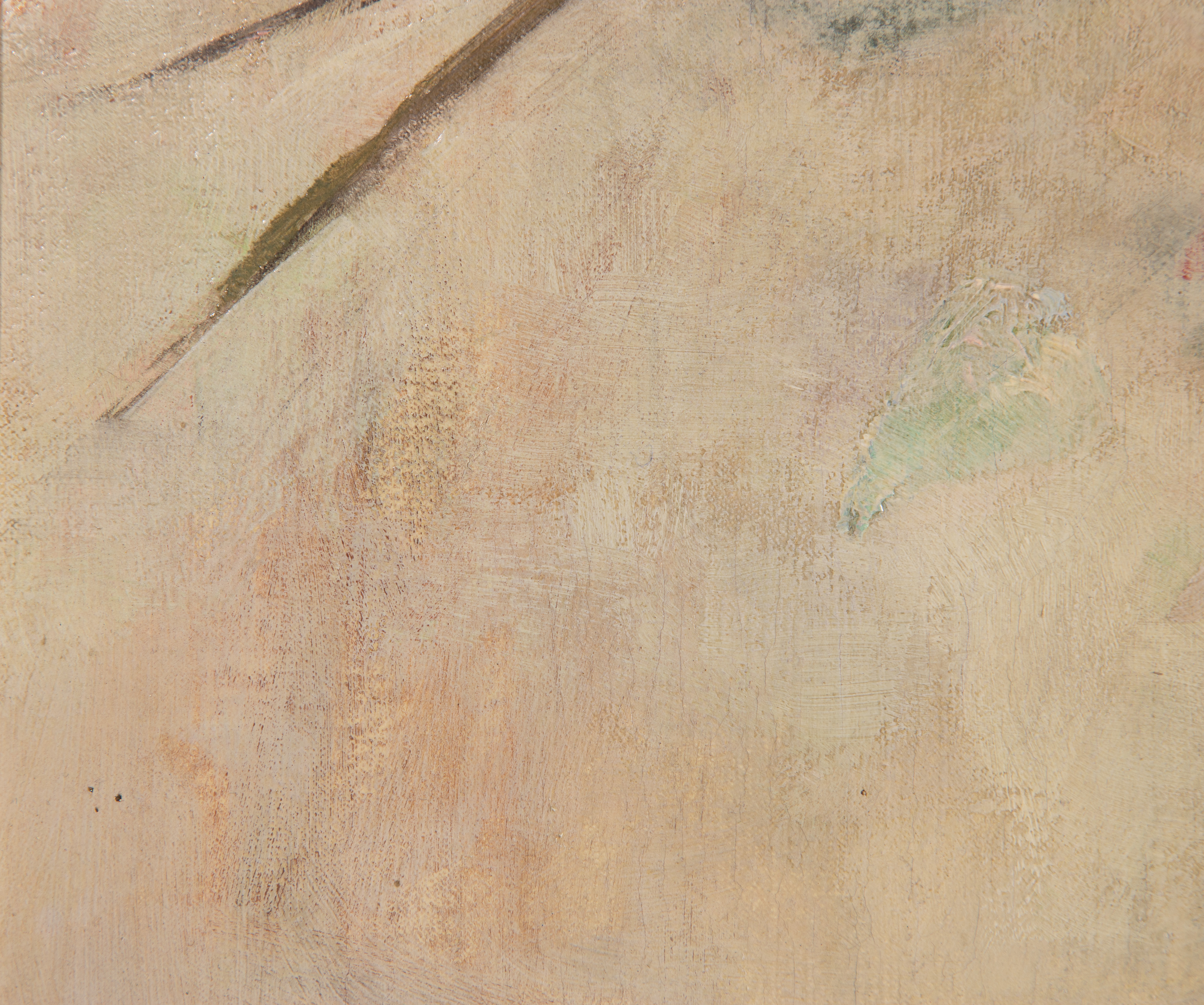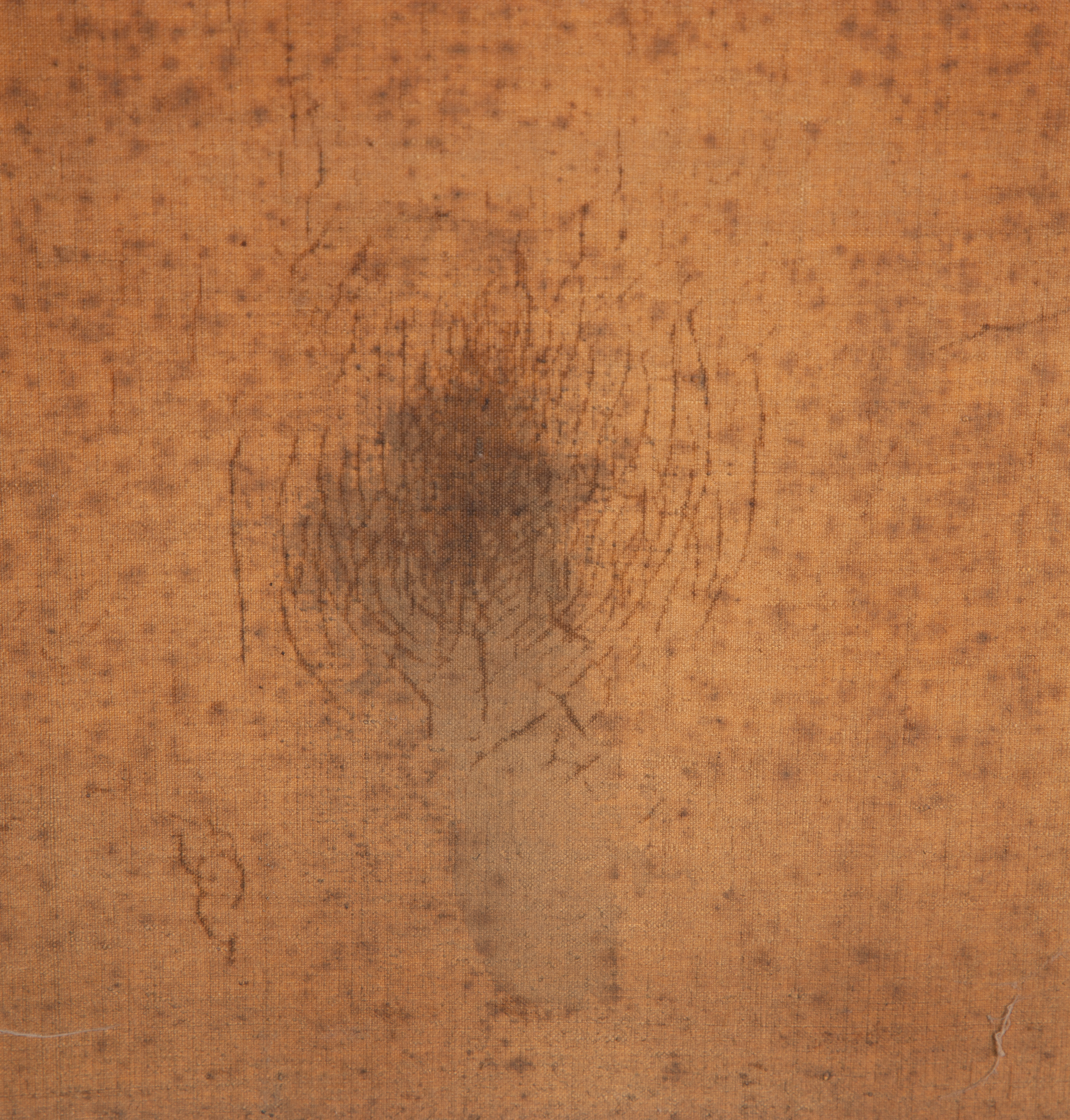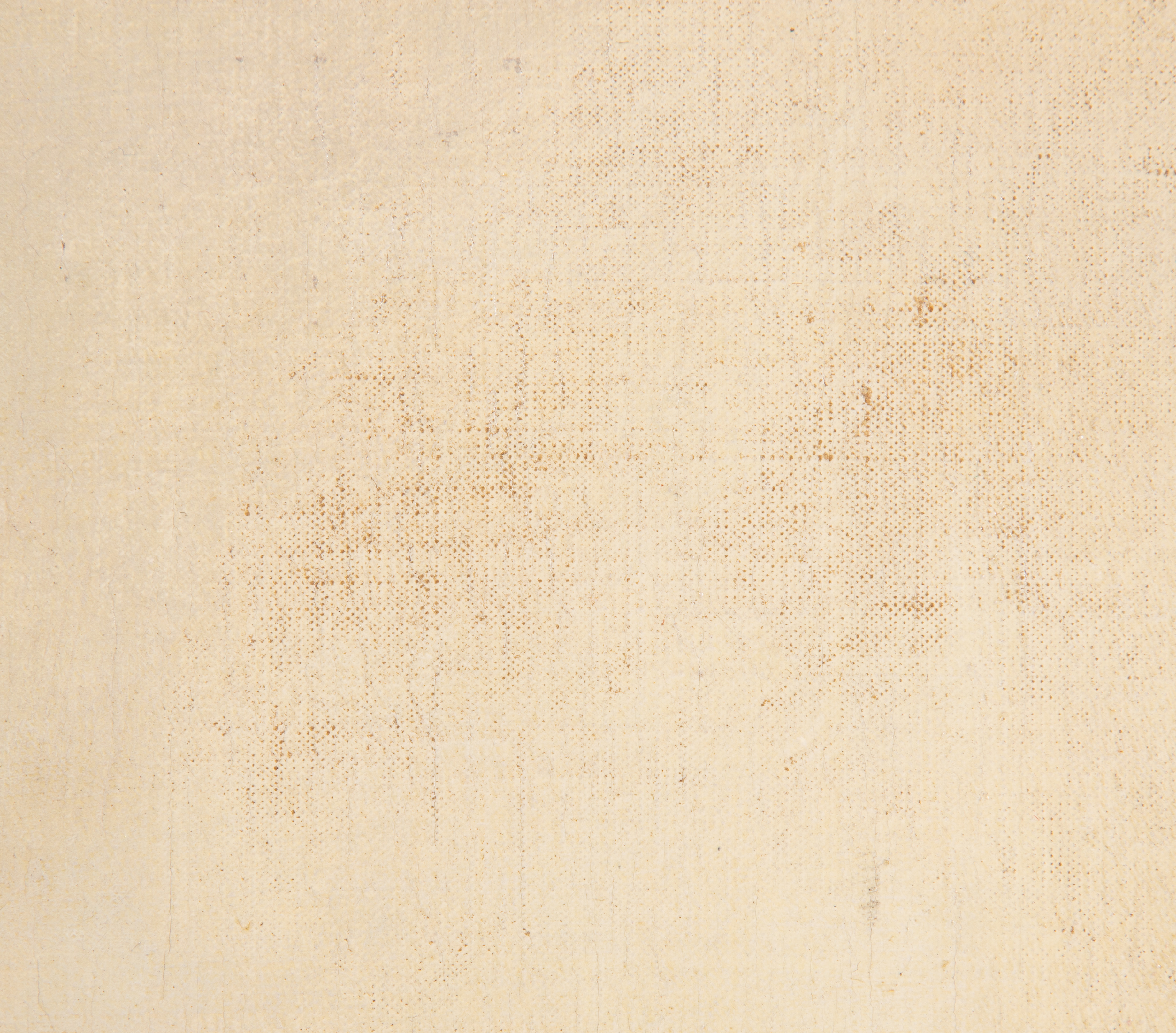 examined under UV light, having craquelure overall, minor paint losses on upper right and left sides, slight paint chipping to upper left corner, hair, hand and fan having inpainting, hand and fan having two puncture repairs, back having traces of efflorescence, frame having light wear