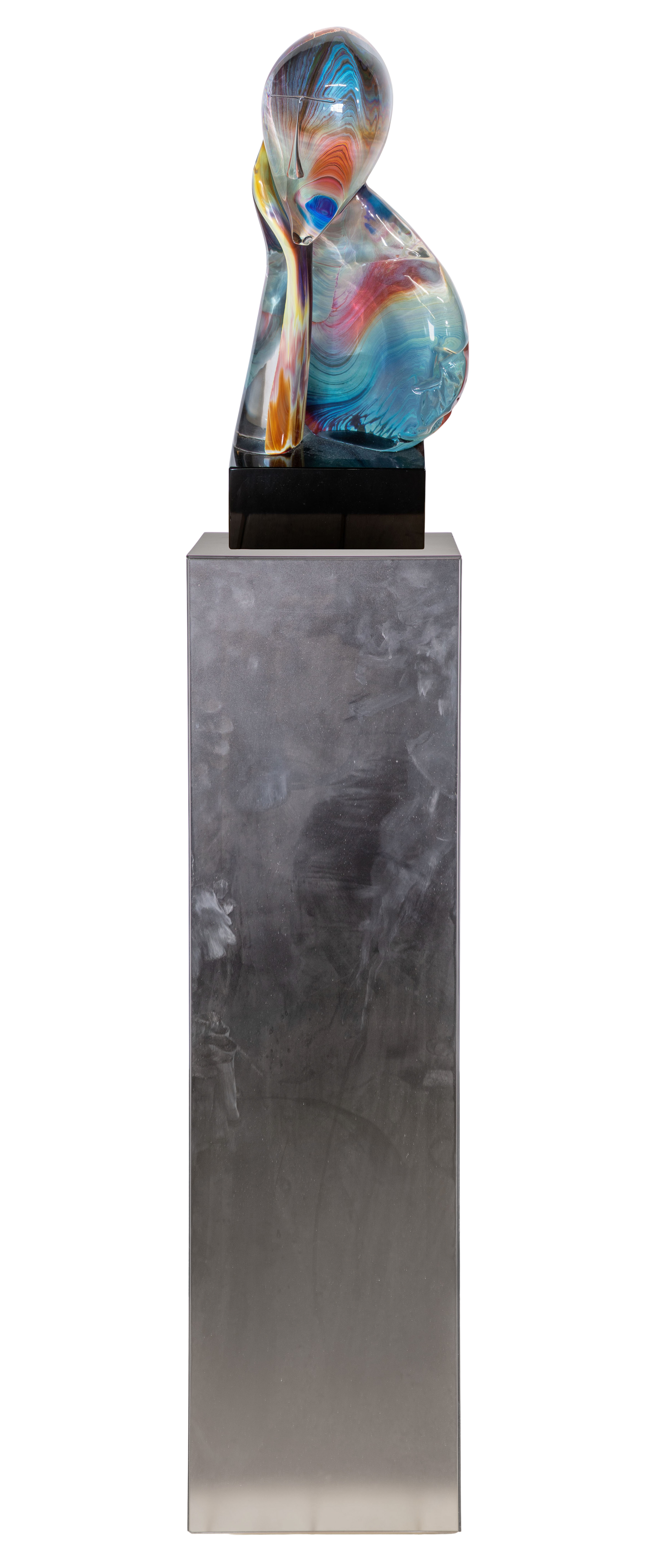 (2) total items including an undated, etch signed on base, depicting an abstract pensive figure; together with a smoked acrylic pedestal (42.5 x 12 x 12-inches)