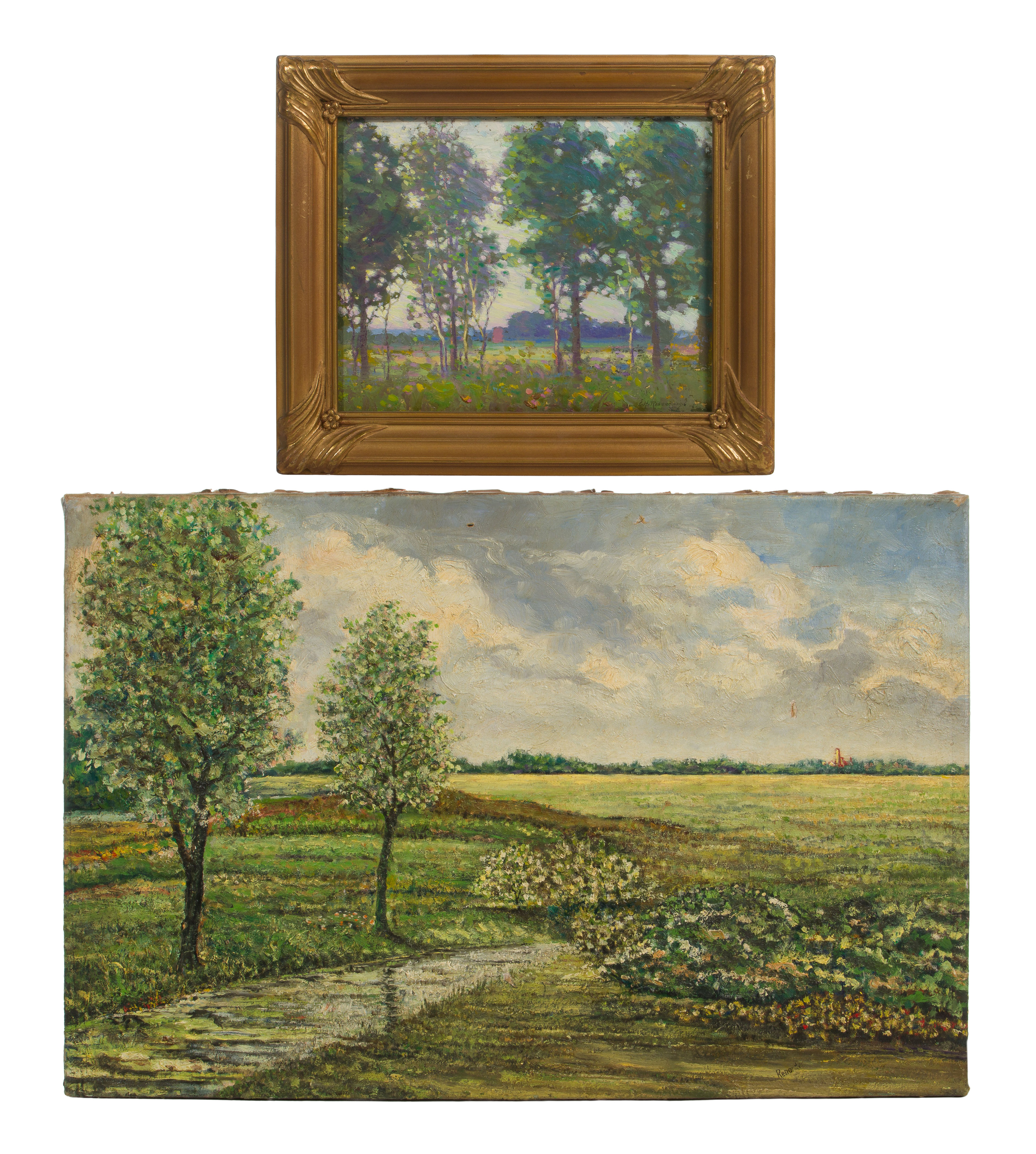 (2) total items including a 1916 Lewis Hemley Risser, signed and dated lower right, depicting a landscape image, in a gold-tone wood frame; together with a landscape oil on canvas illegibly signed lower right, unframed
