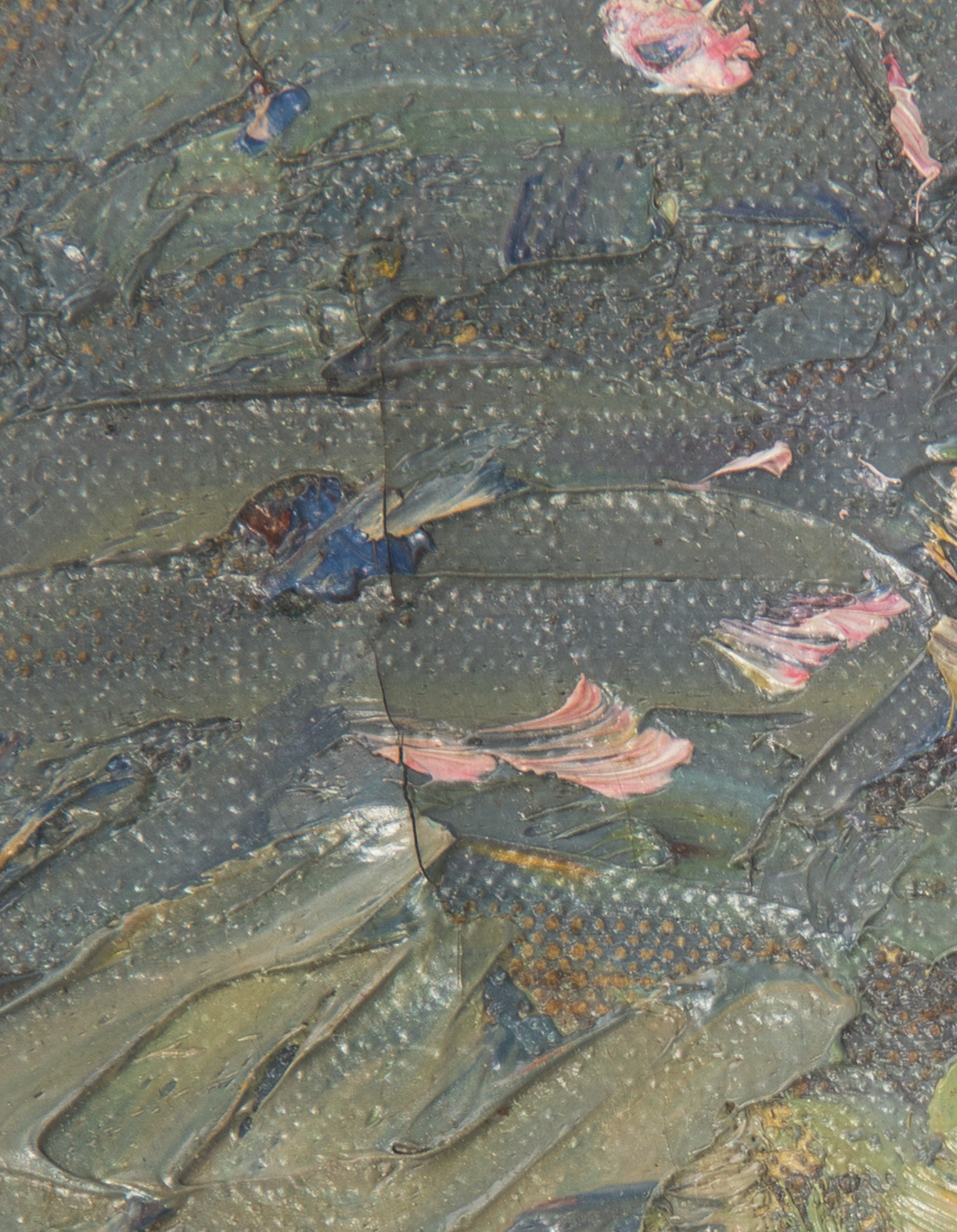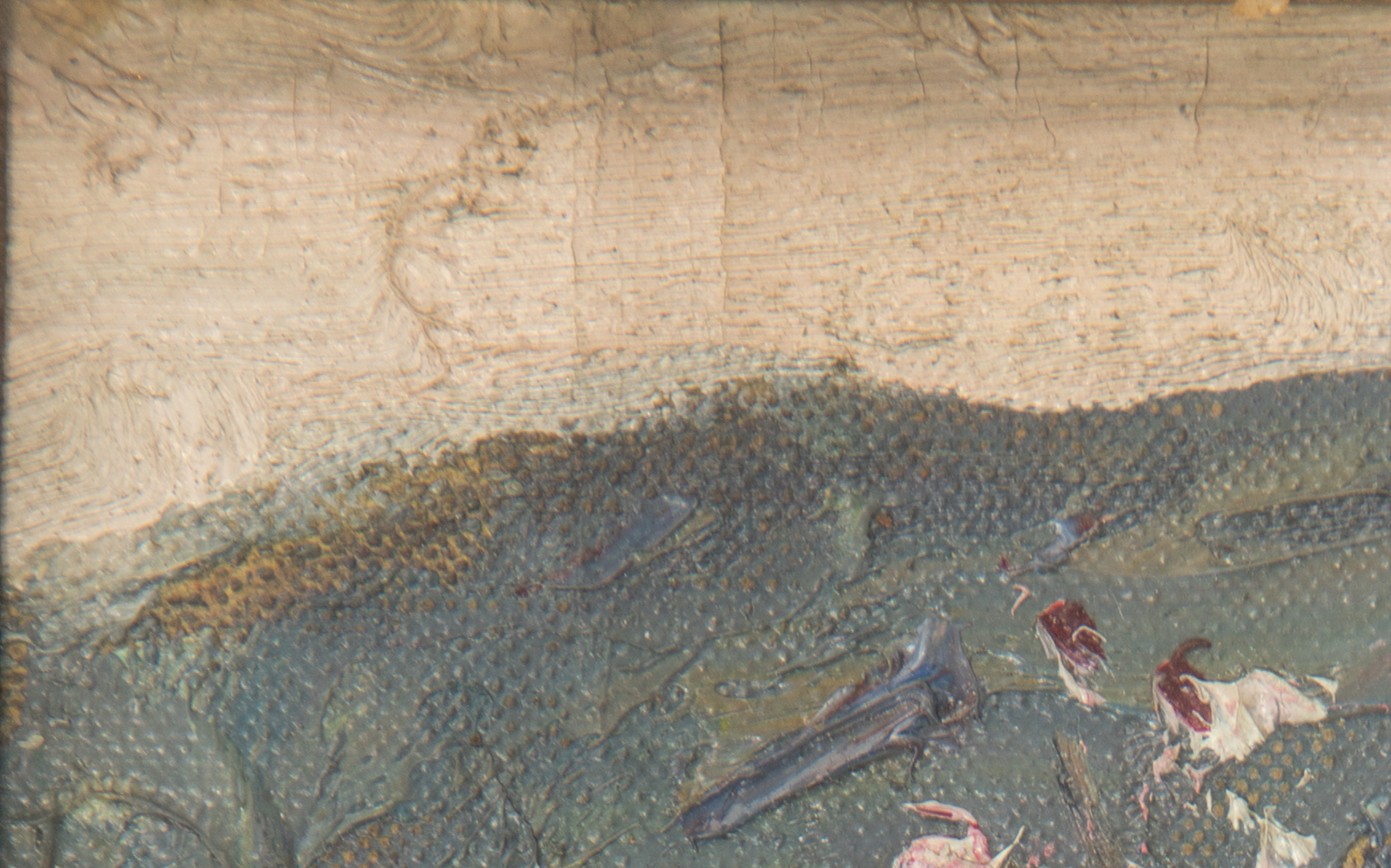 Condition: UV inspected through glass, appearing to have a repair upper right, craquelure overall, frame having some missing gesso, corners separating