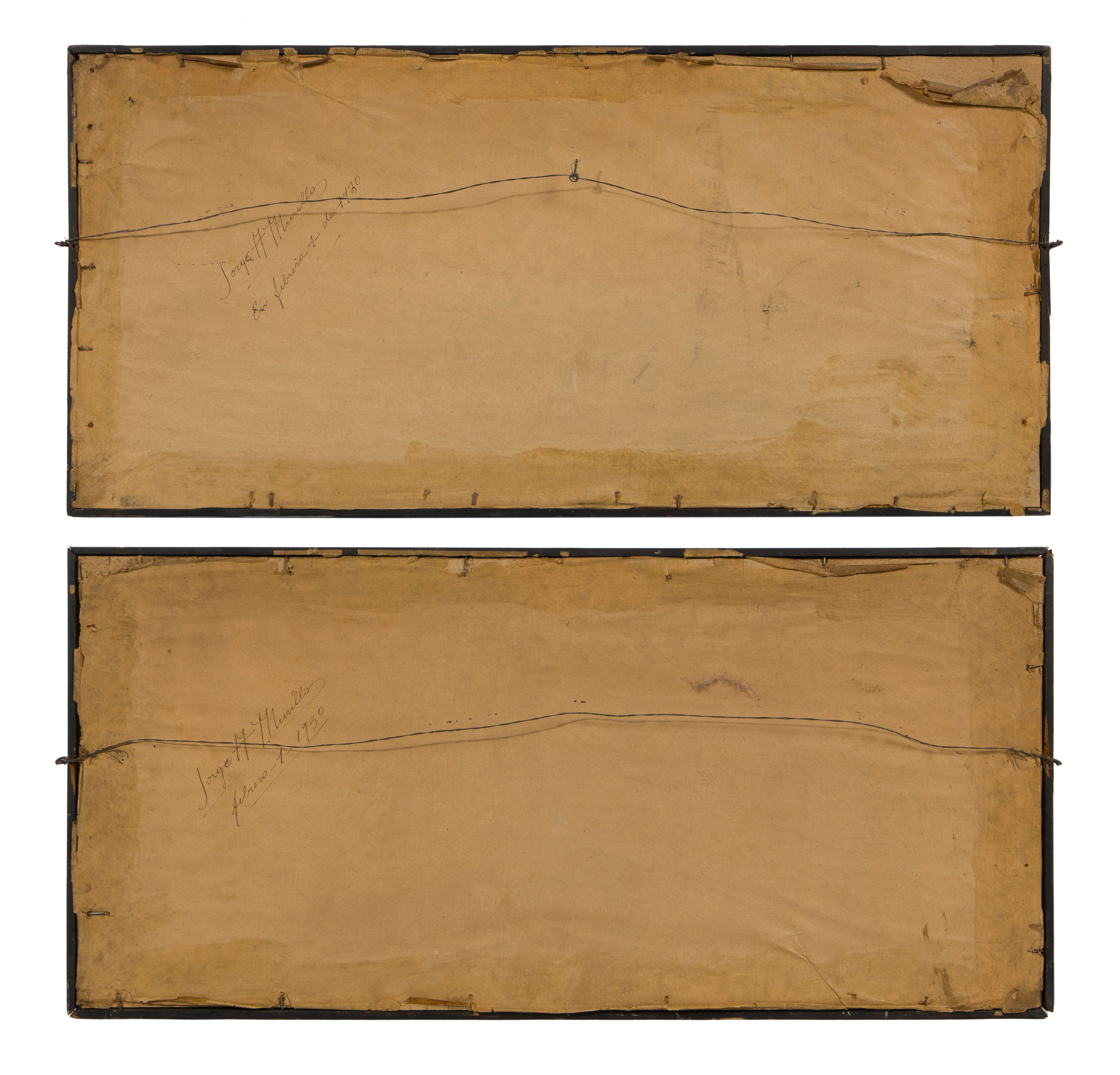 Condition: Murillo watercolors having creases and water damage, Trenchard having paint loss in the center and along the edges, Hicks having areas of paint loss throughout, unsigned watercolor having water damage, frames having chips and paint loss, a Murillo frame separating in the corners, unsigned watercolor having missing glass section in the upper right corner