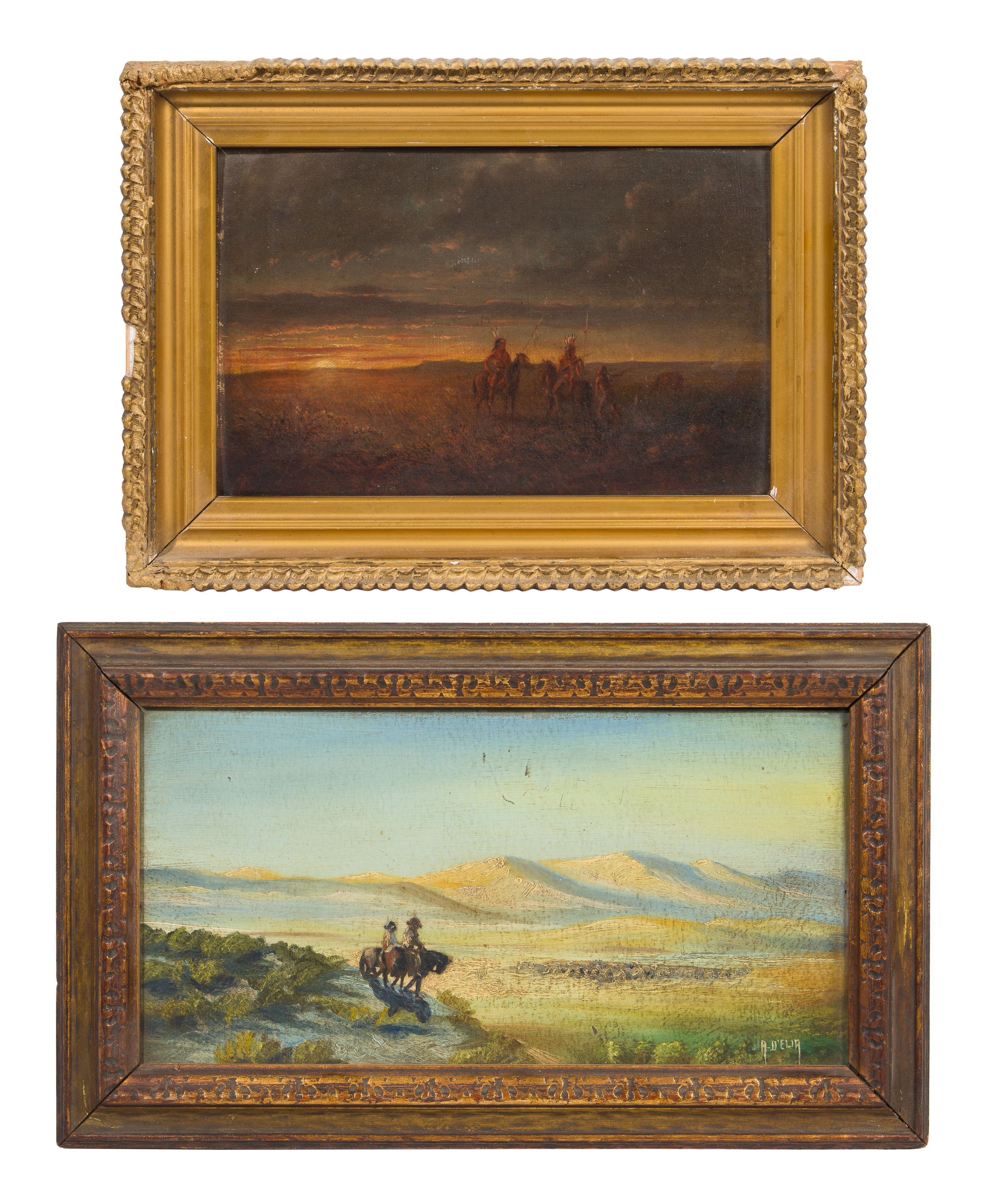 (2) total items including an oil on canvas laid to board, initialed lower left, depicting three Native Americans at sunset, in a gold-tone wood frame; together with an oil on board signed ‘A. D’elia’ lower right, in a gold-tone wood frame