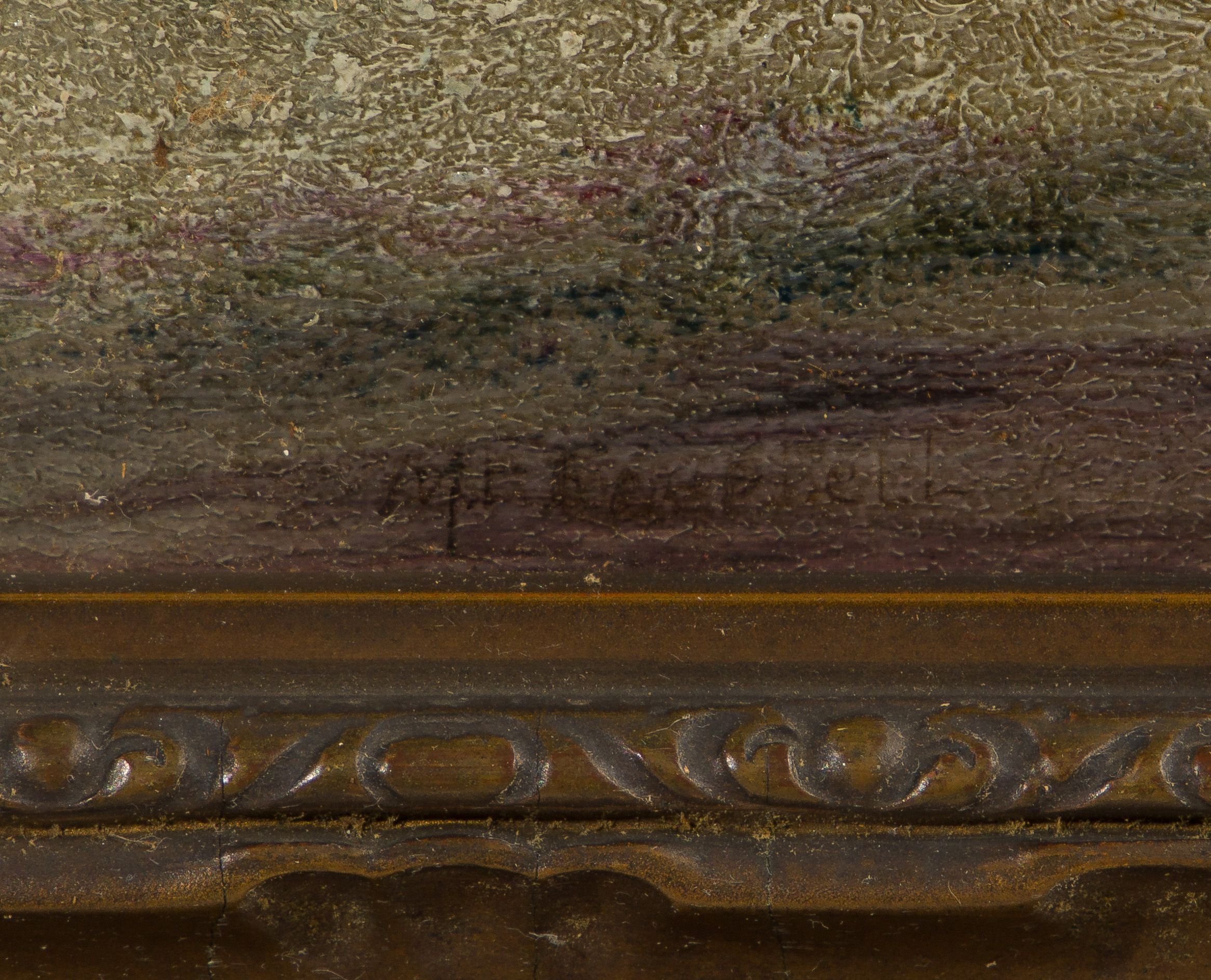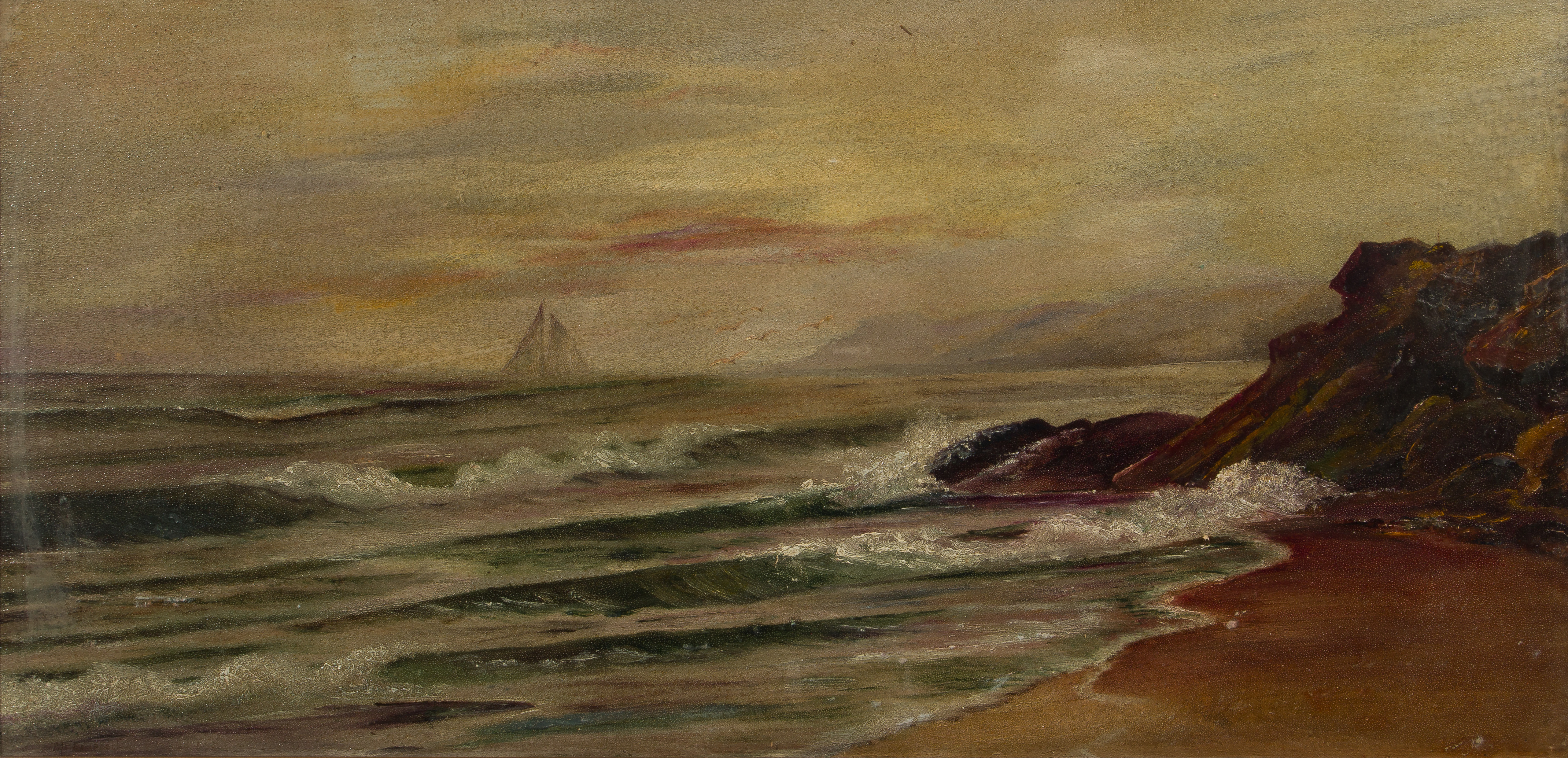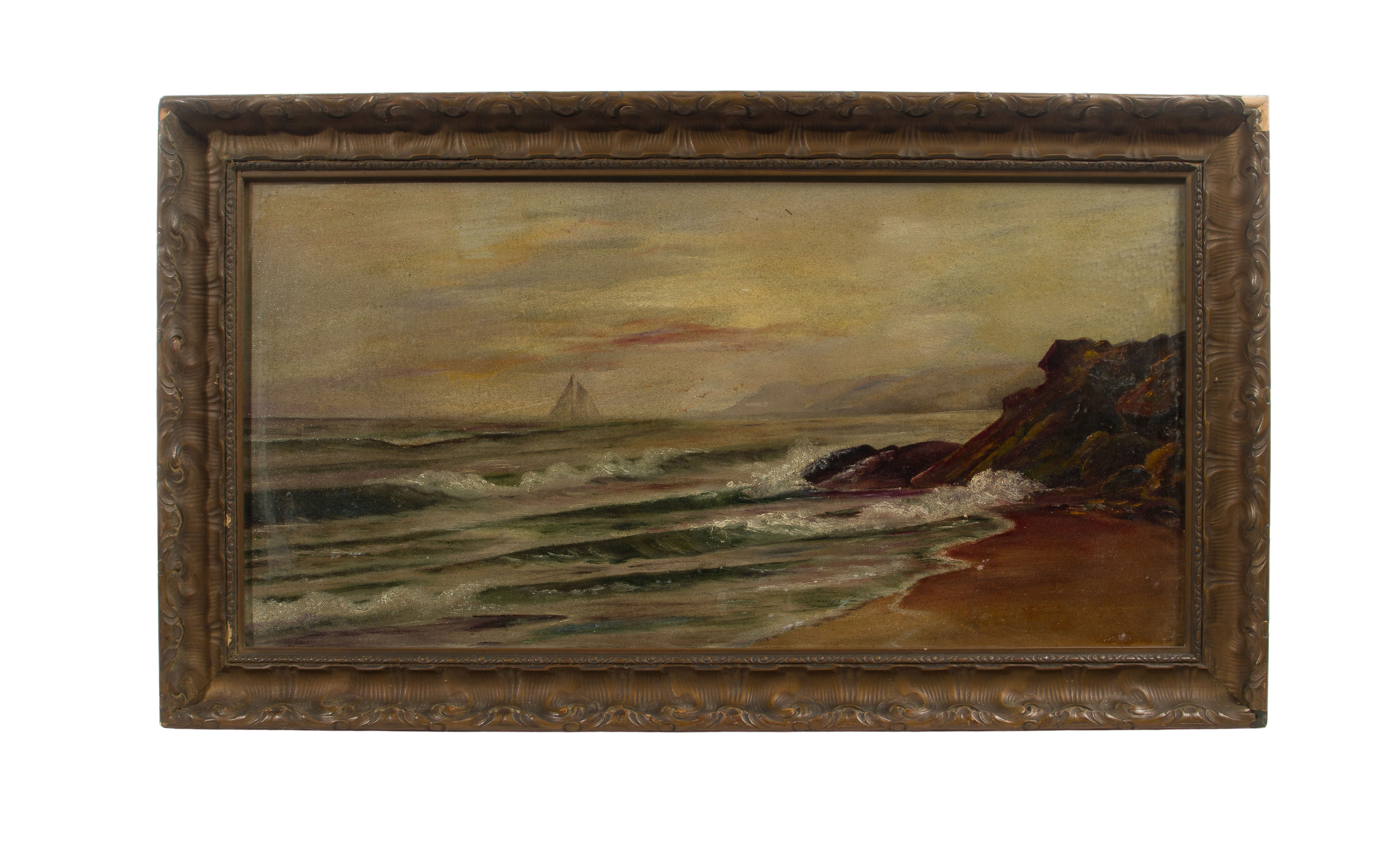 Undated, illegibly signed lower left, depicting a sailboat off a rocky shore, rendered using paint having a grit / sand admixture, behind glass in a bronze-tone gesso on carved wood frame