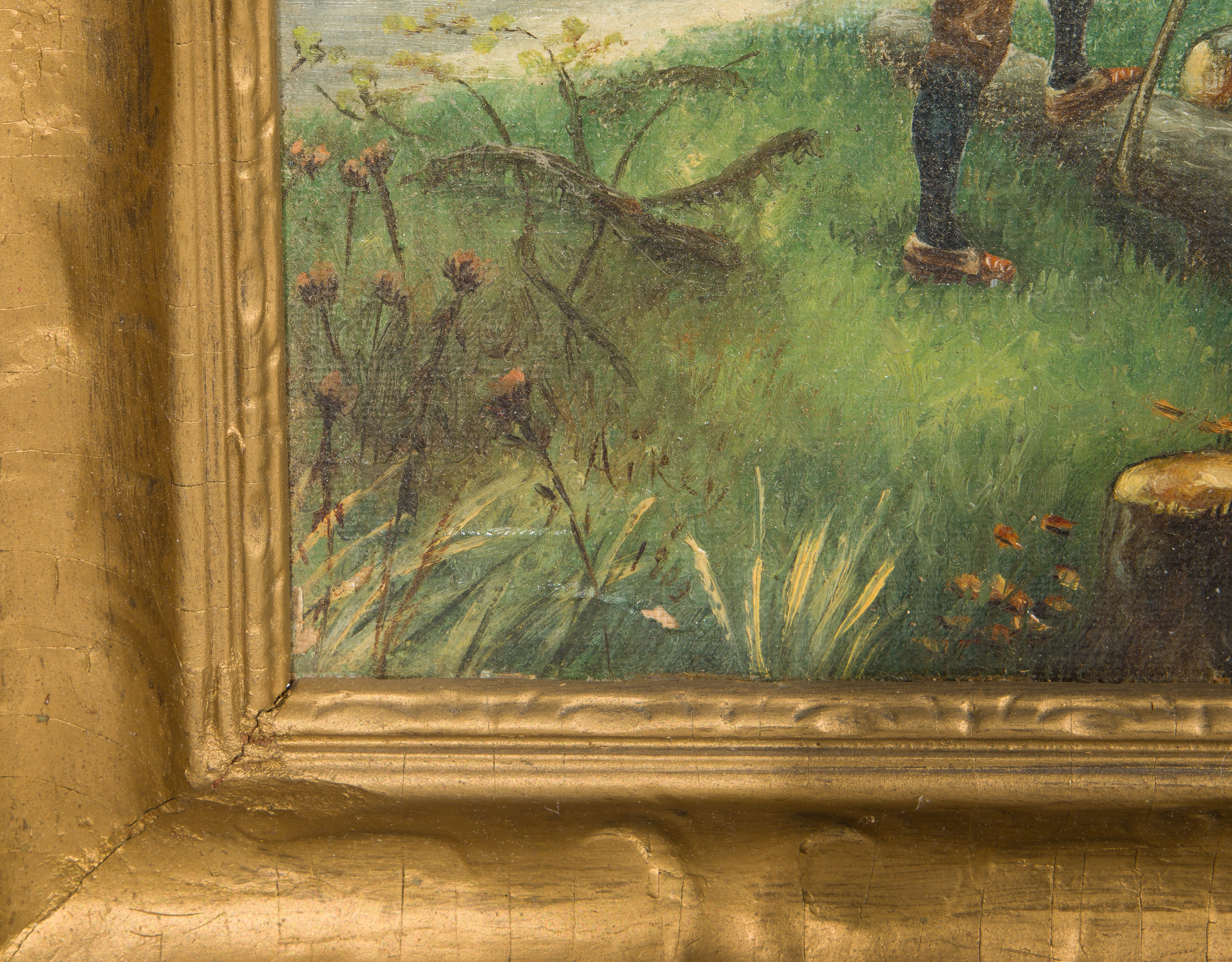 (2) total items including a 1903 signed ‘Aiken’ lower left and titled lower right, depicting settlers, Native Americans and lumberjacks, in a gold-tone wood frame; together with an unsigned oil on tin depicting a military base with an American flag and soldiers, in a wood frame