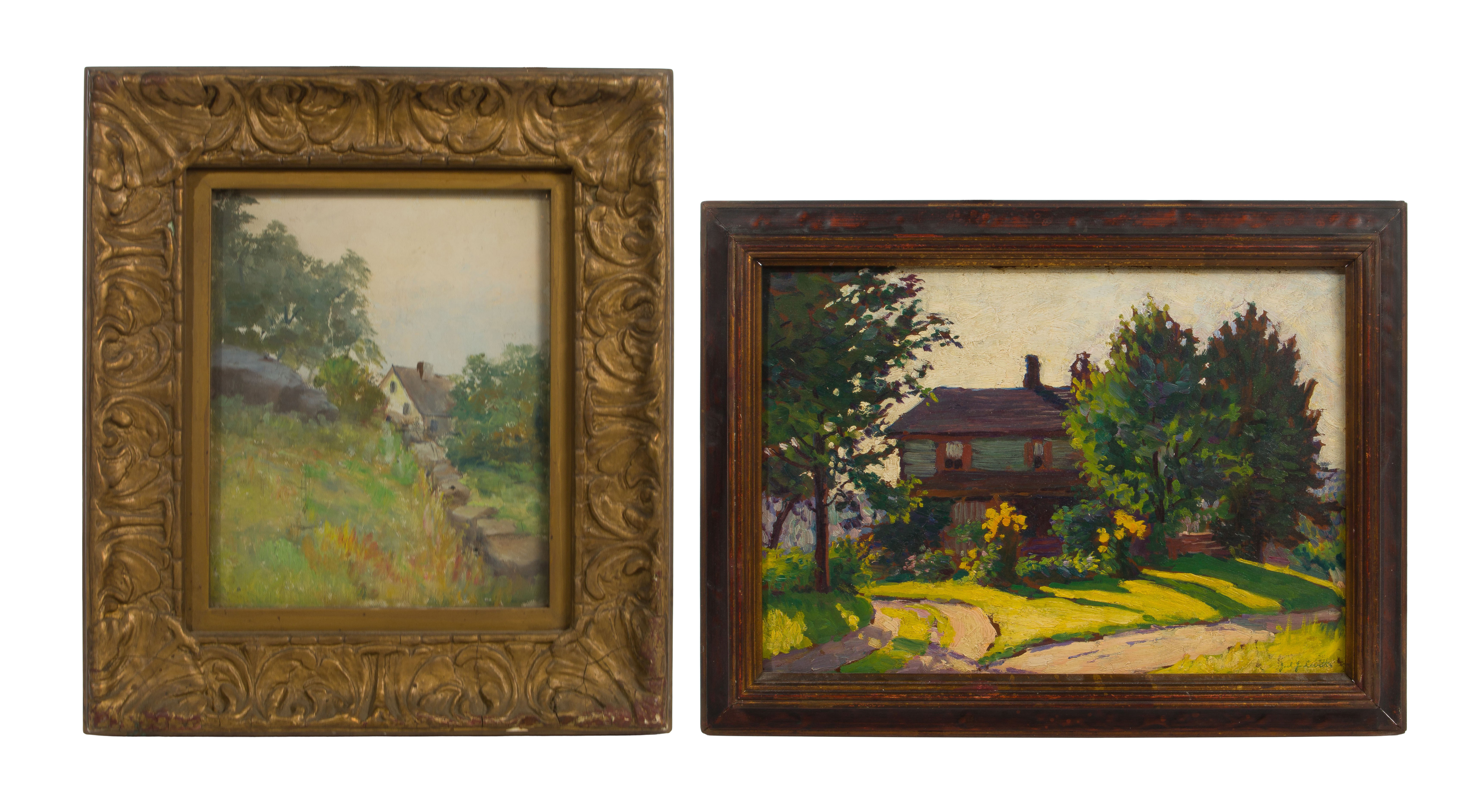 (2) items including one depicting a house flanked by trees, illegibly signed lower right, in a wood frame and one depicting a house flanked by grass and trees, illegibly pencil signed, behind glass in a gold-tone wood frame