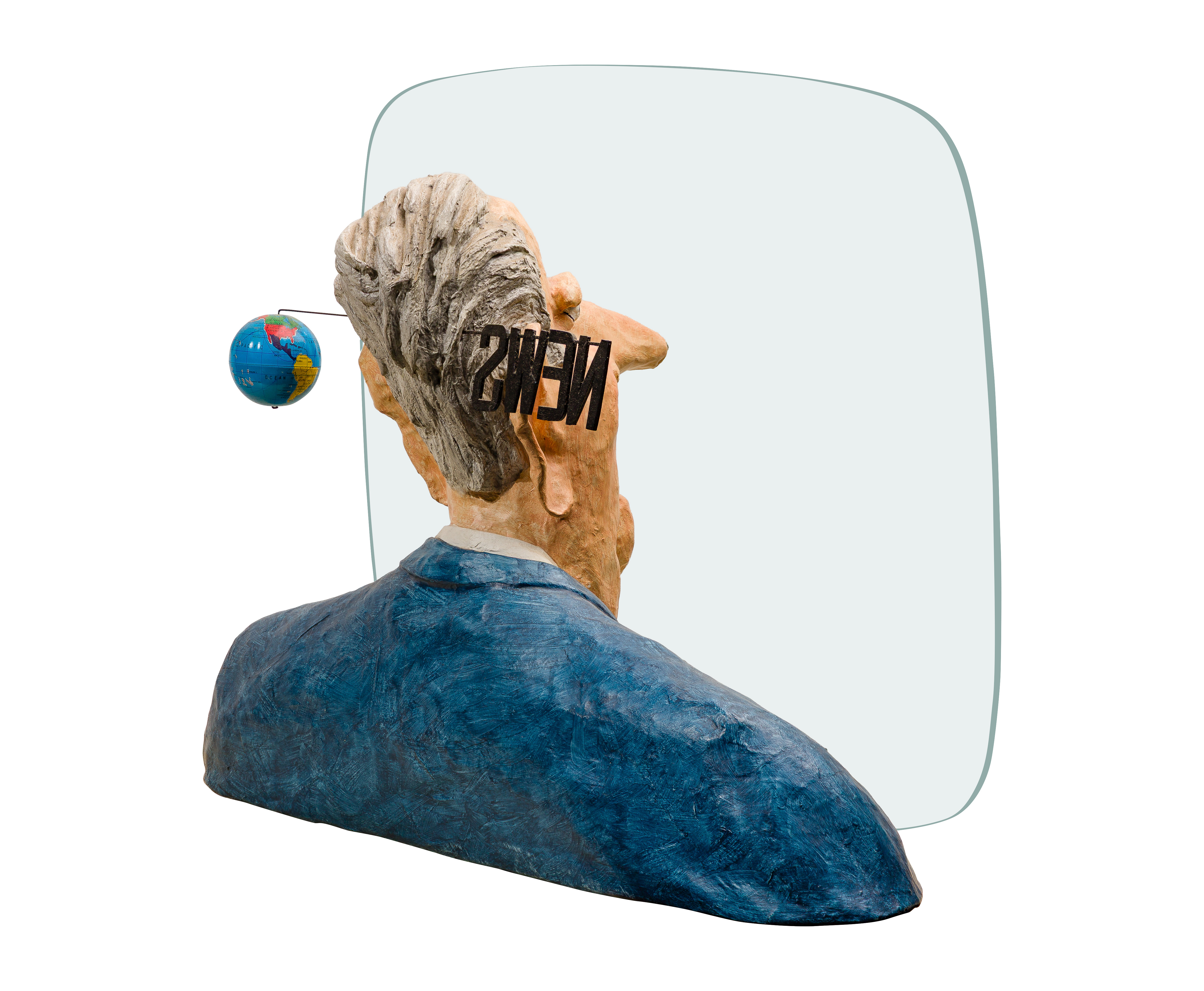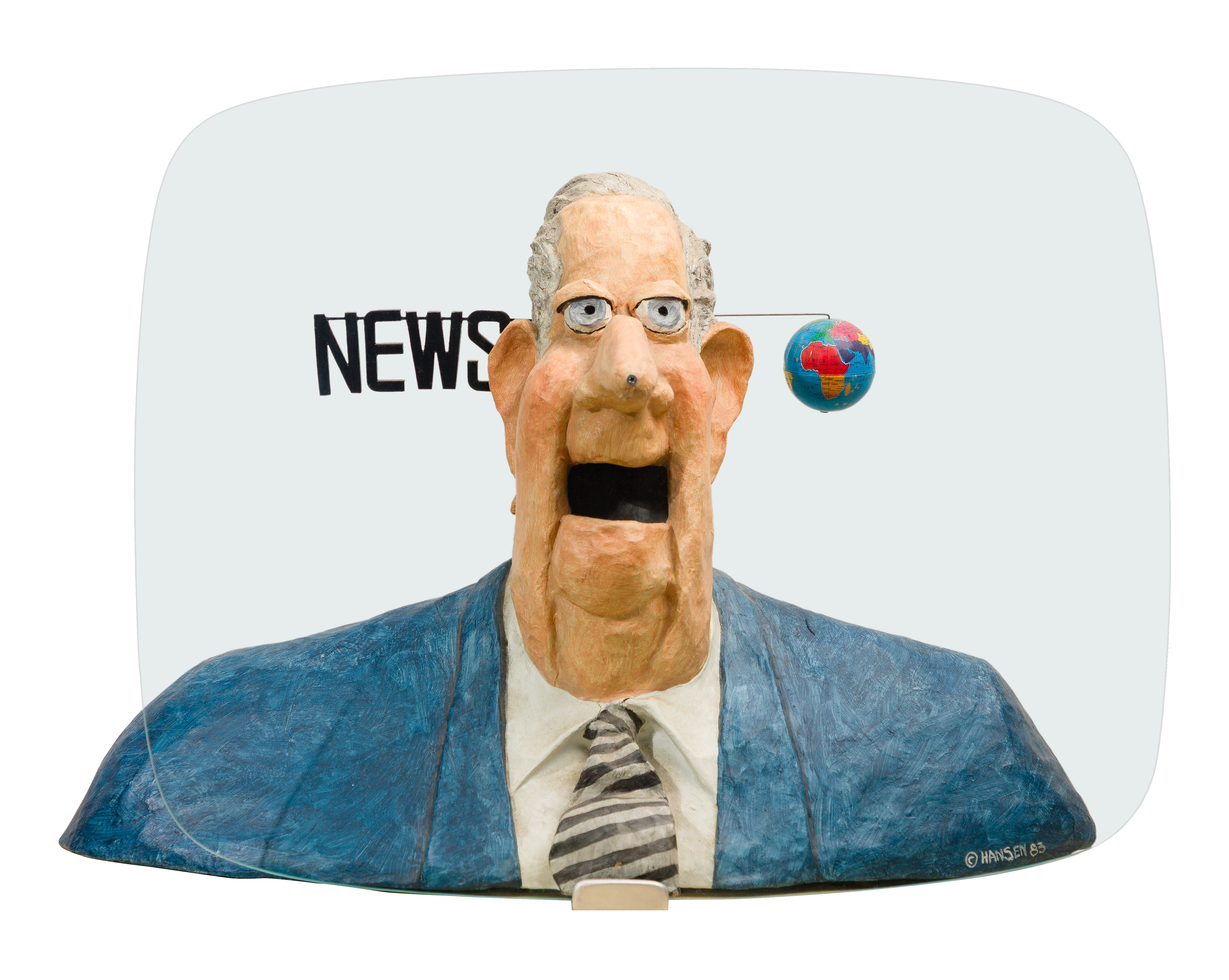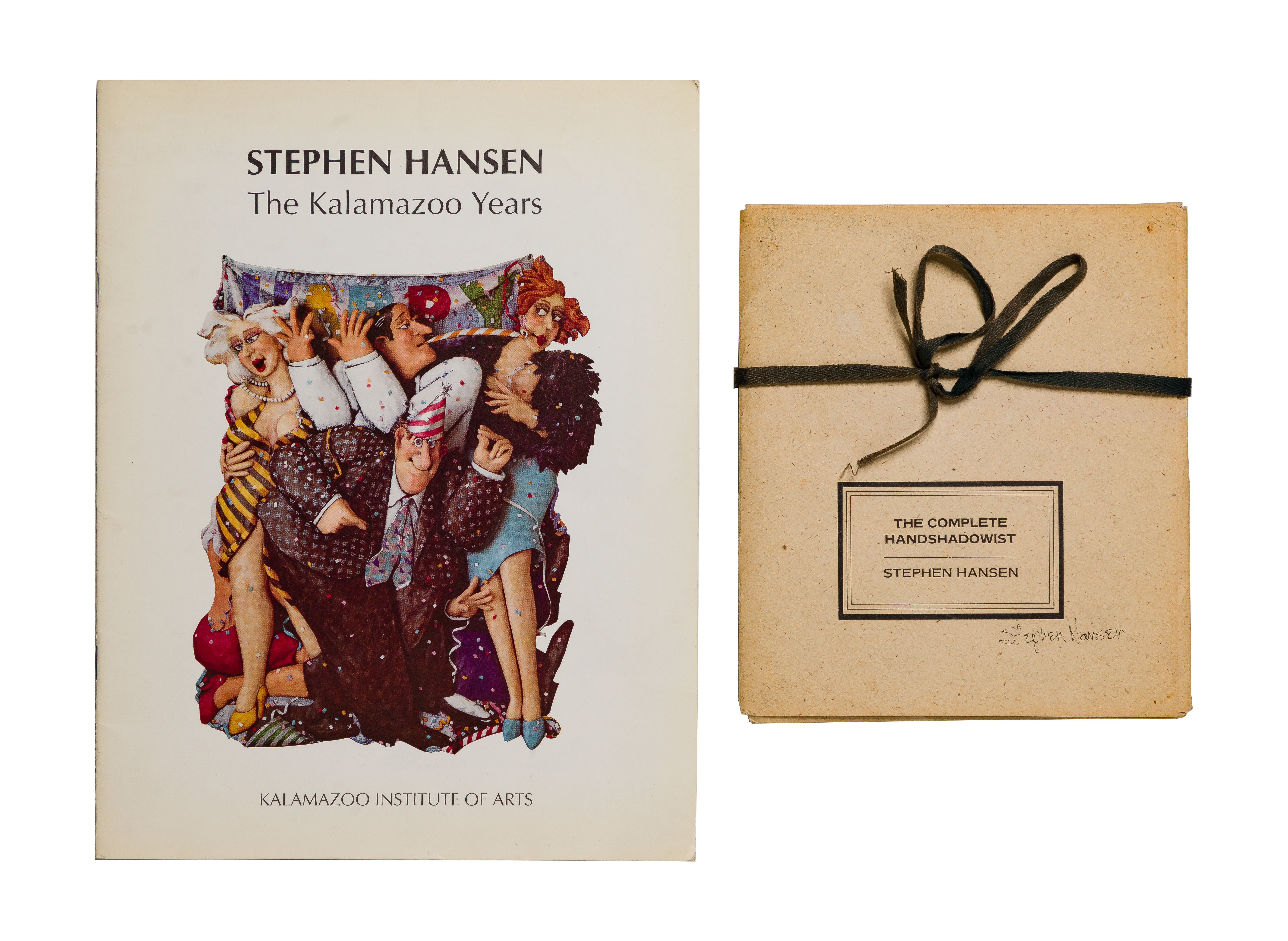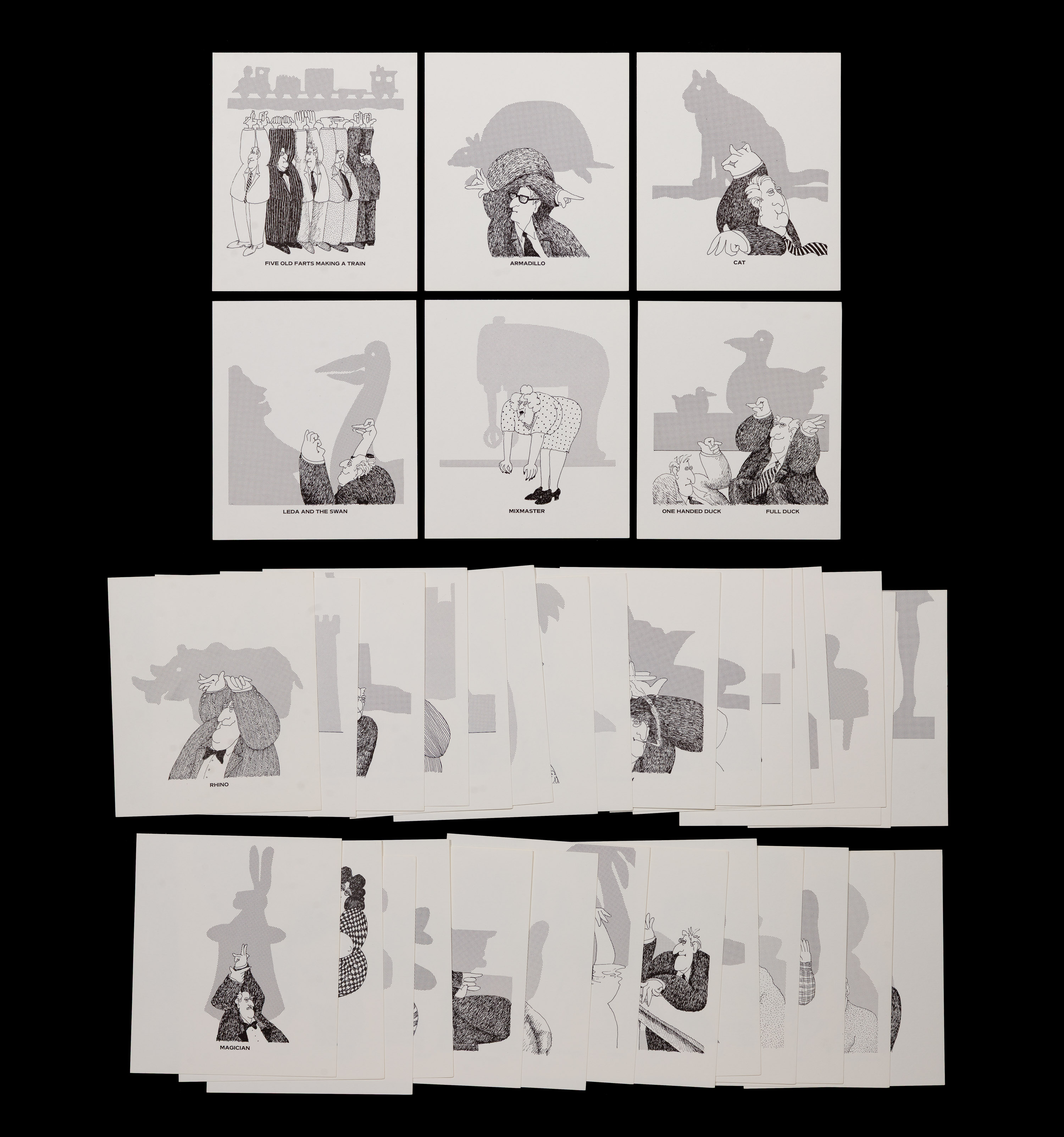 (3) total items including a 1983, signed and dated lower right, depicting a papier mache news anchor behind a glass television screen; together with a pamphlet and The Complete Handshadowist print set