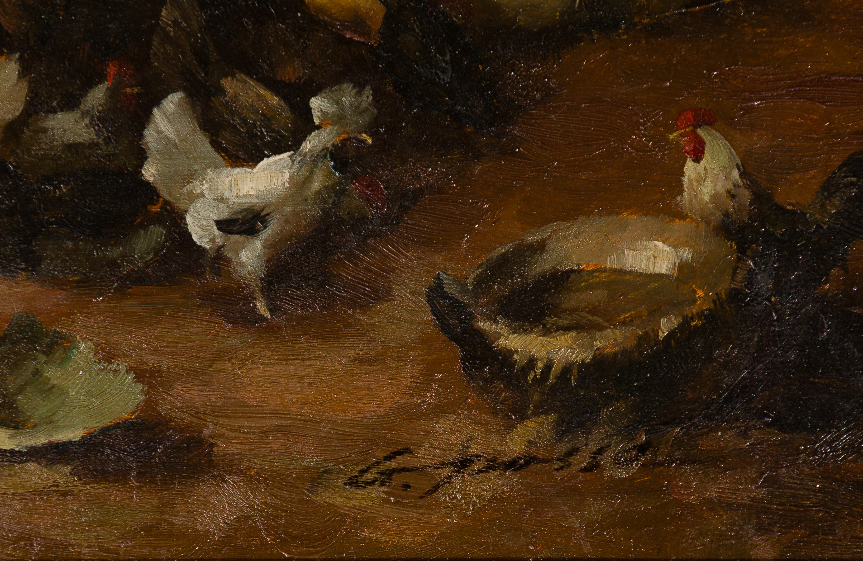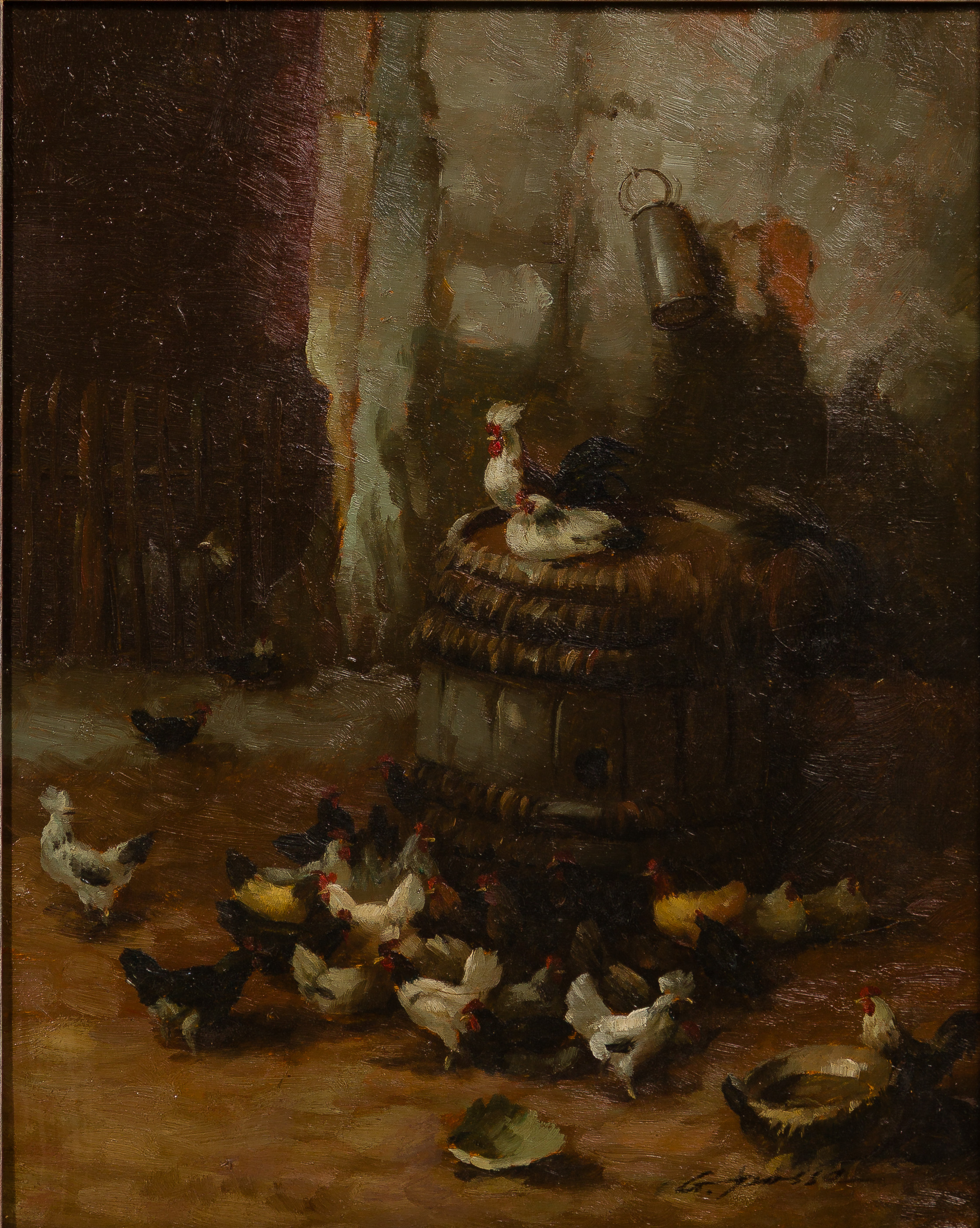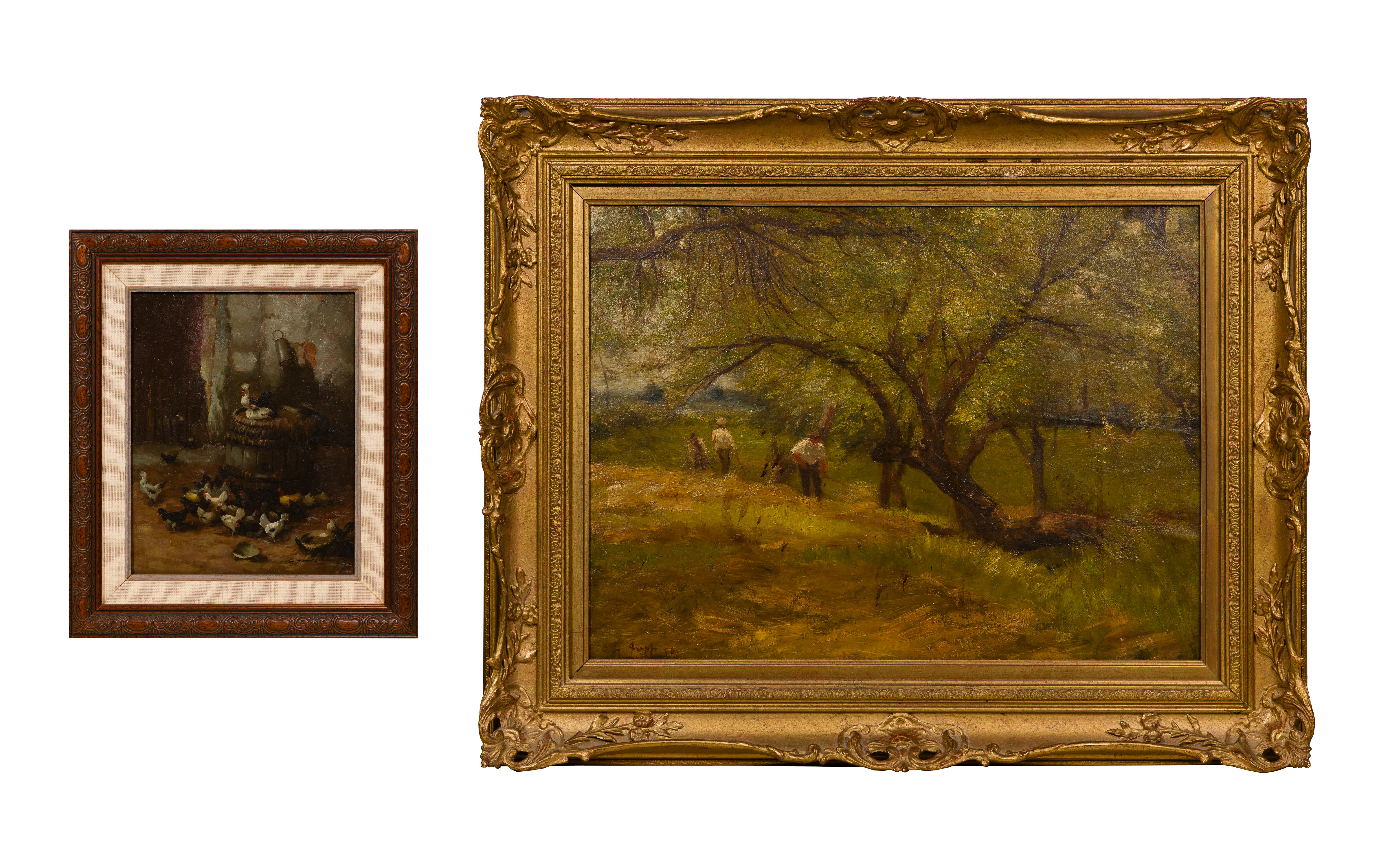 (2) total items including a 1916, signed lower left, a landscape depicting thrashing of wheat, in a gilt wood frame; together with an undated oil on canvas, illegibly signed lower right, depicting chickens in a farmyard, in a wood frame