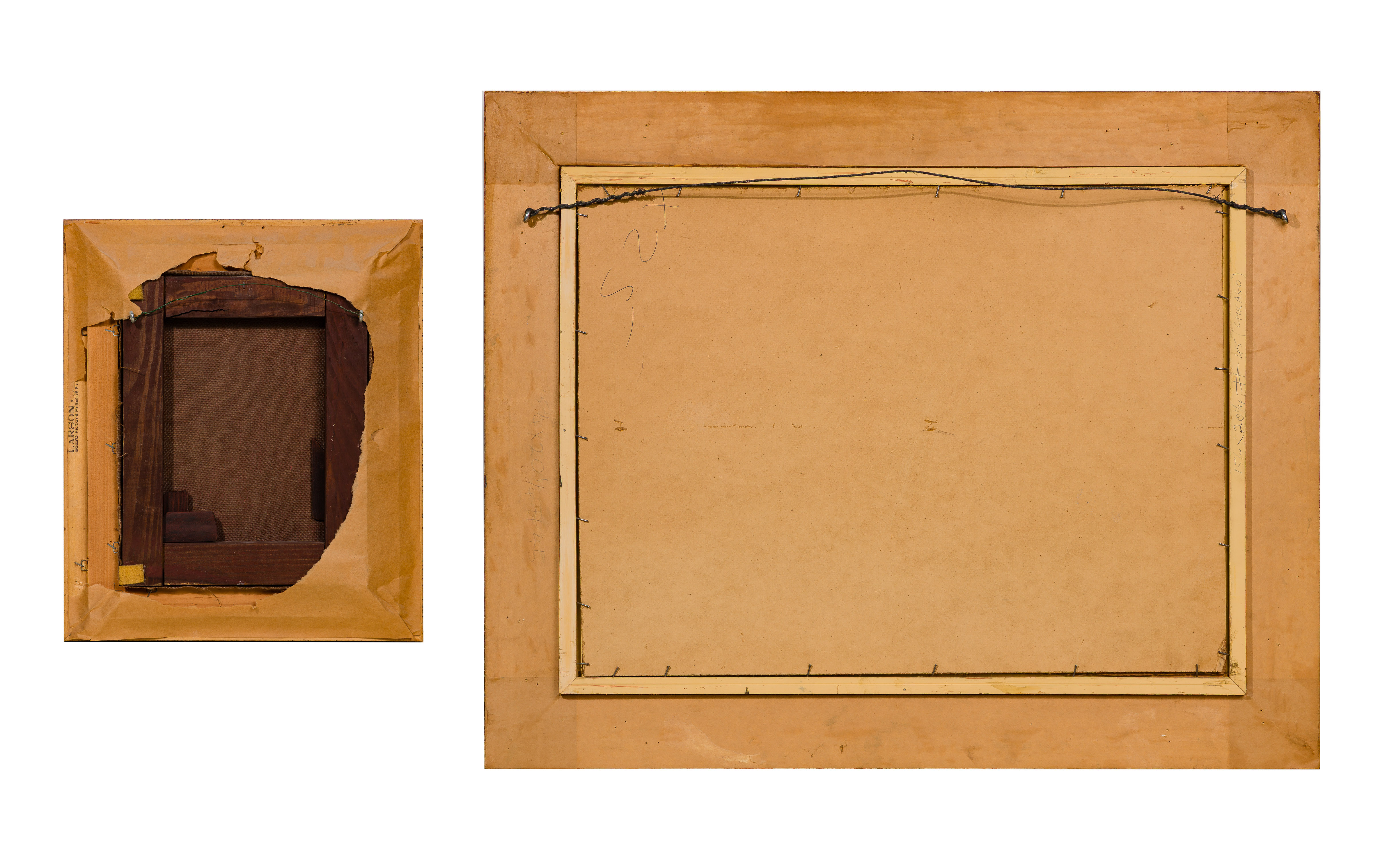 Jupp having brown liquid splatter in center, scratching near signature, chickens having visible stretcher marks, frames having minor wear