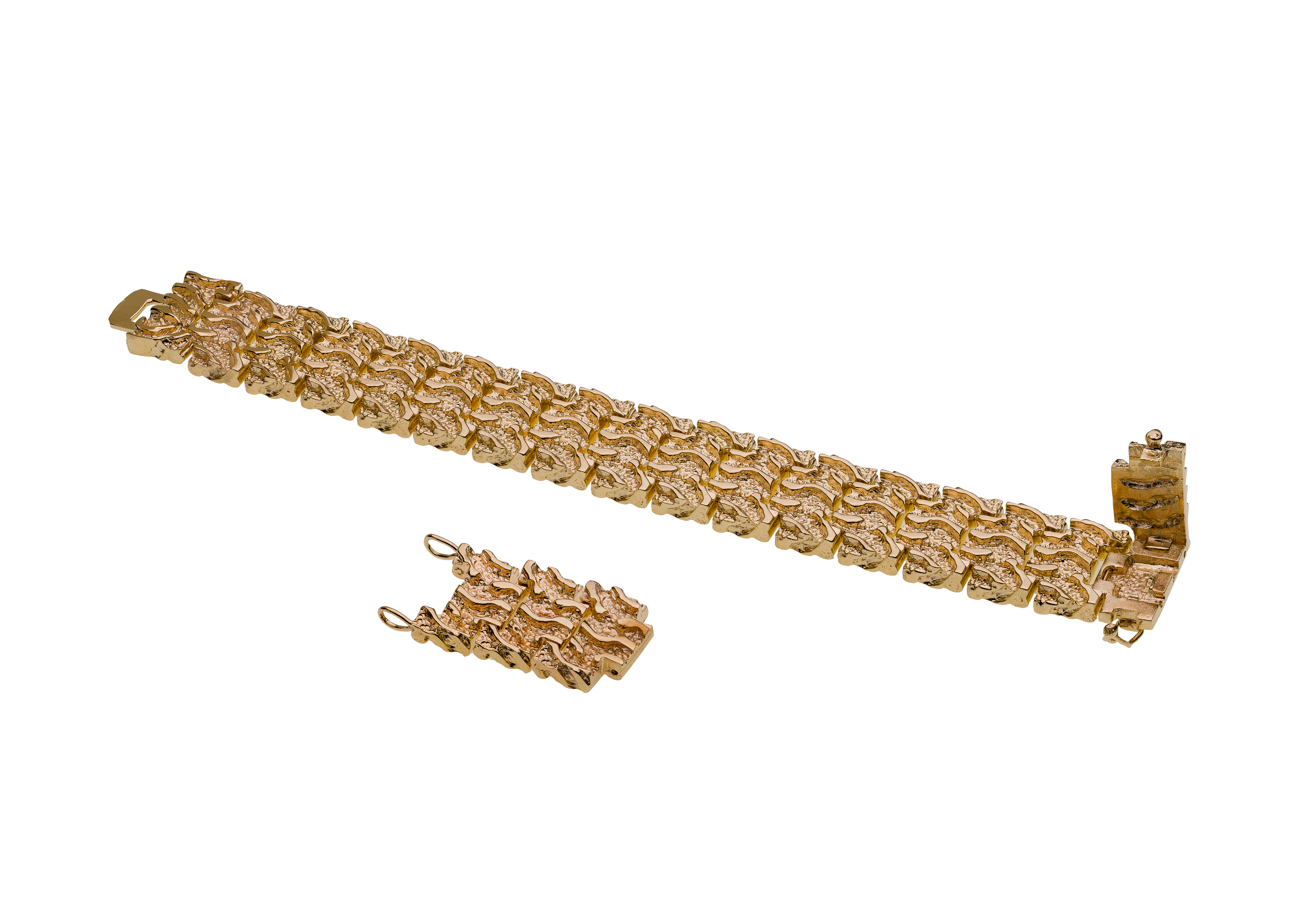 A link style having a brushed and smooth surface, 0.75-inch width and extra links (unmarked 14k)