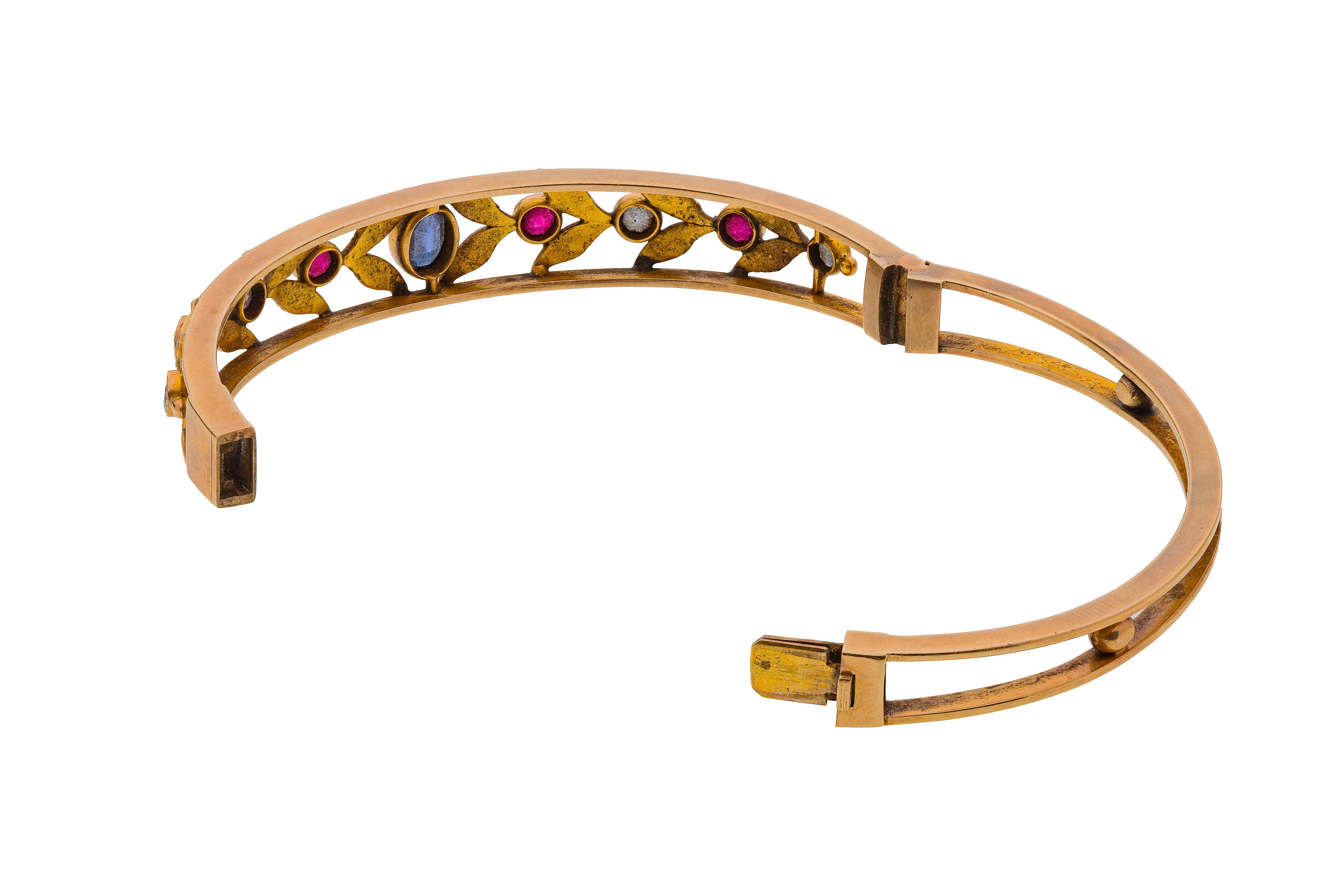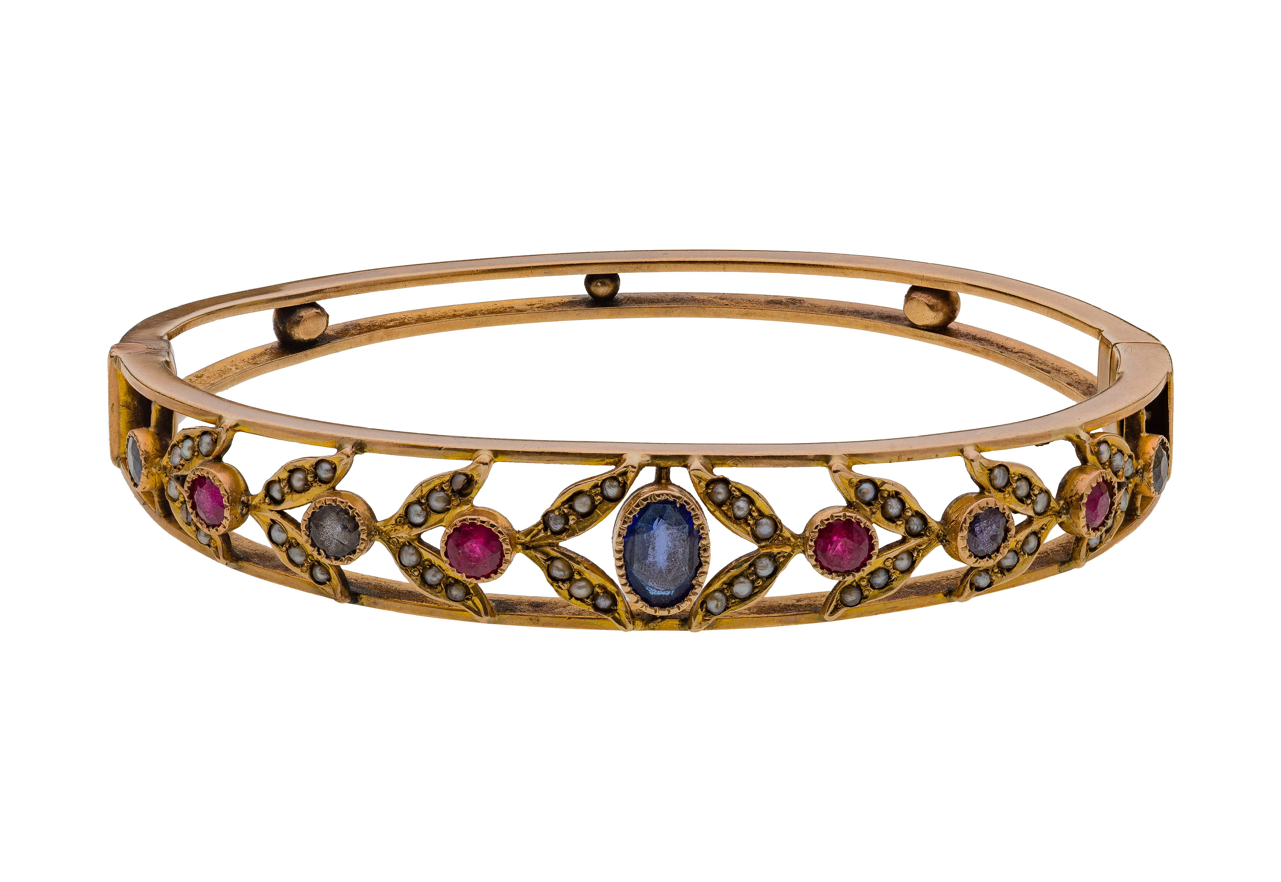 Having a floral design with a central oval cut spinel, flanked by seed pearl leaves and round cut rubies and sapphires