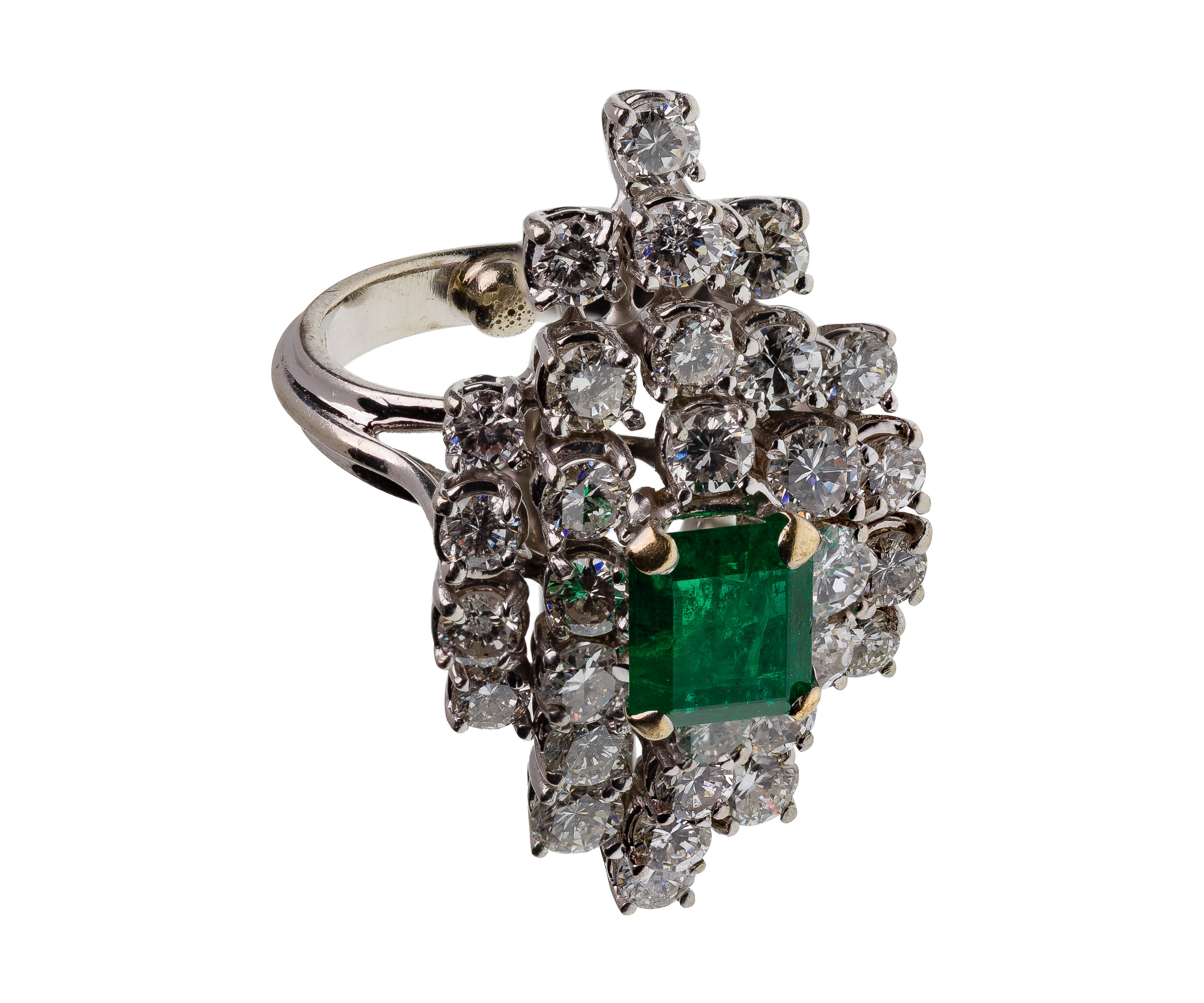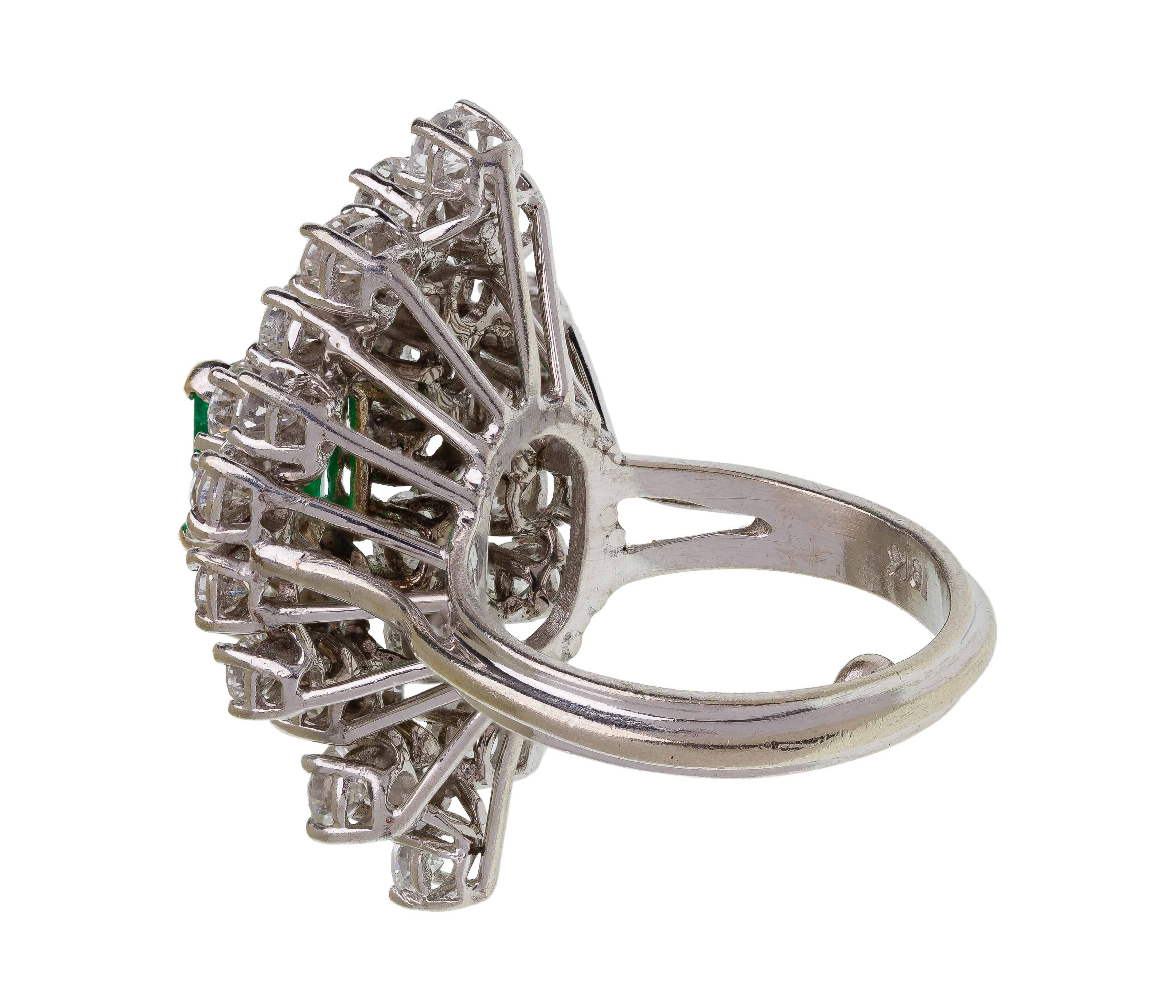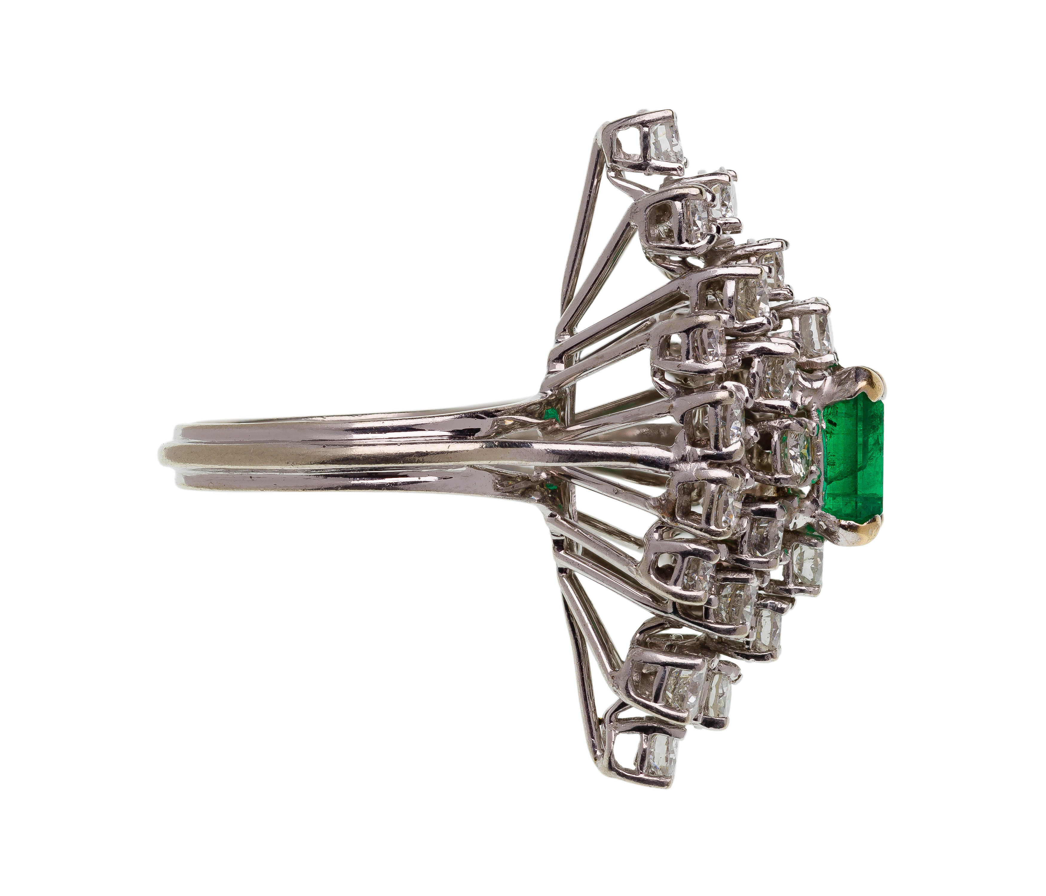 A statement ring having a rectangle cut emerald (approximately 7.2 x 7.0mm) flanked by stepped rows of thirty round cut diamonds weighing approximately 3.0 carats total weight (mismarked ’18k’)
