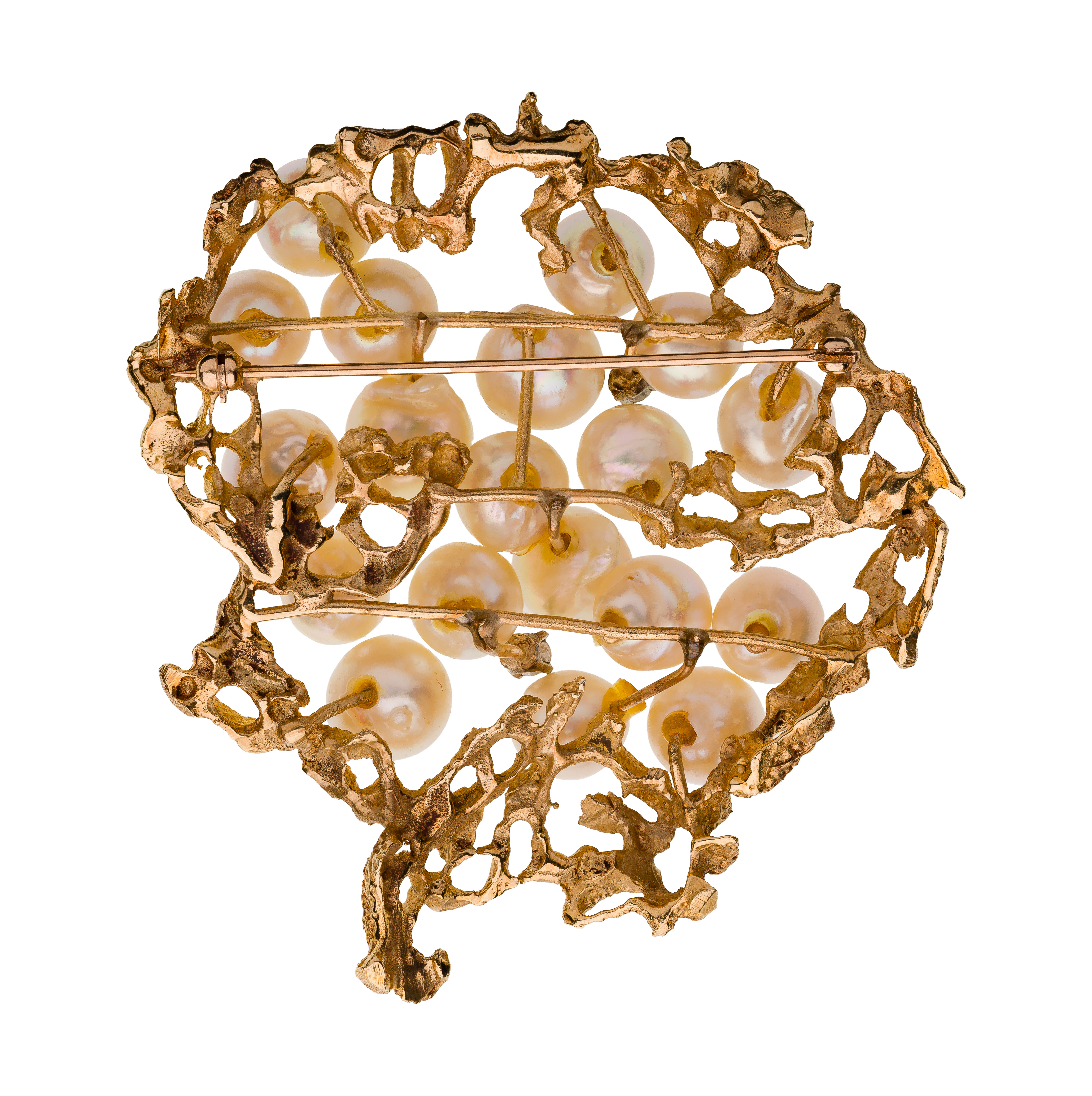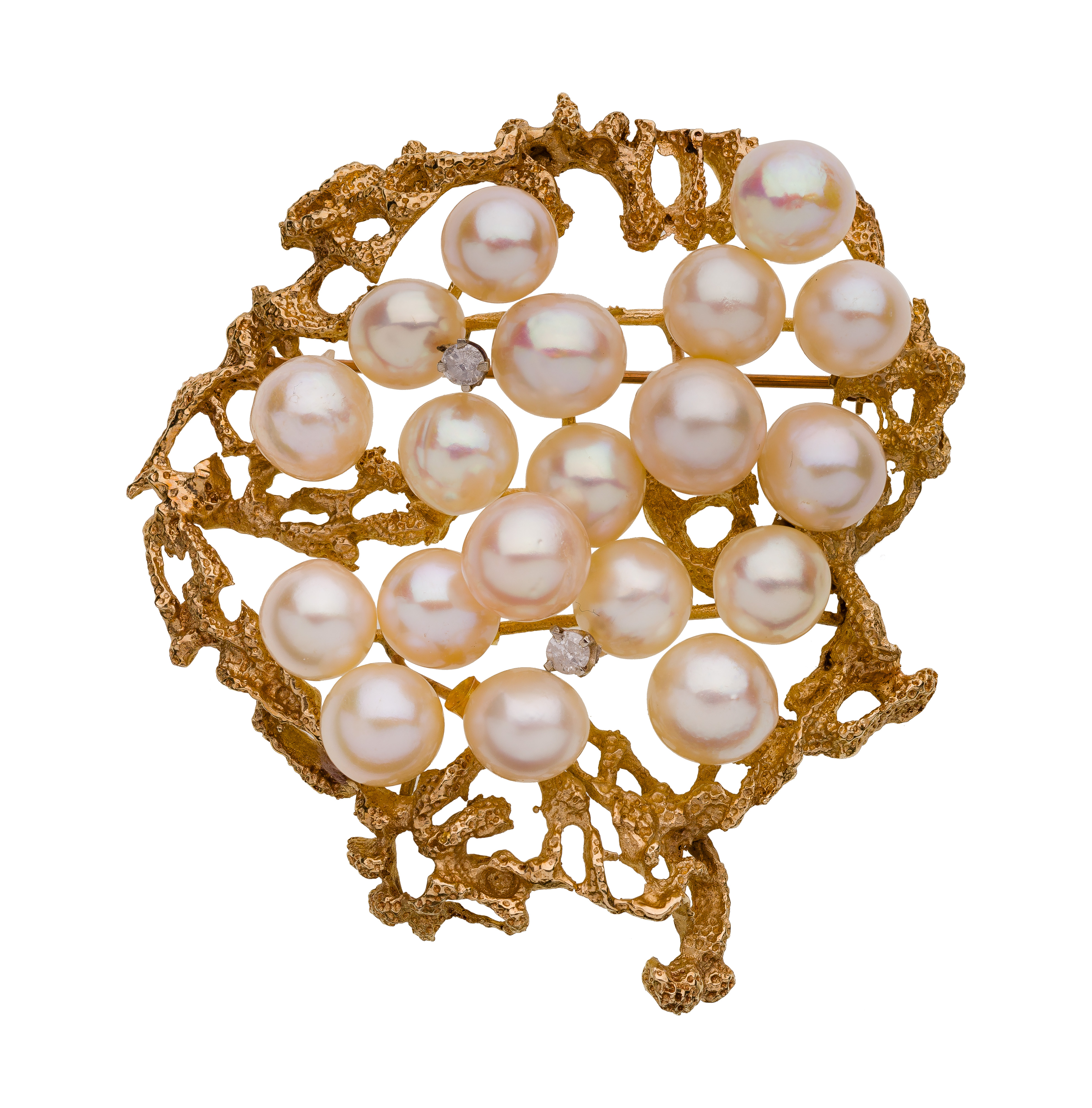 A cluster style setting having 8mm pearls and two round cut diamonds randomly placed in the setting (unmarked 14k)