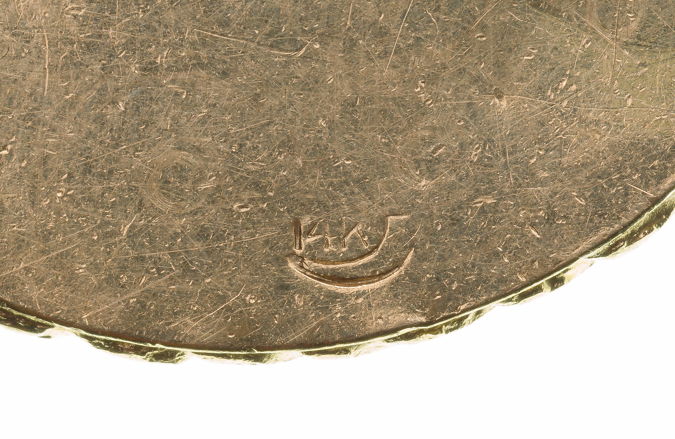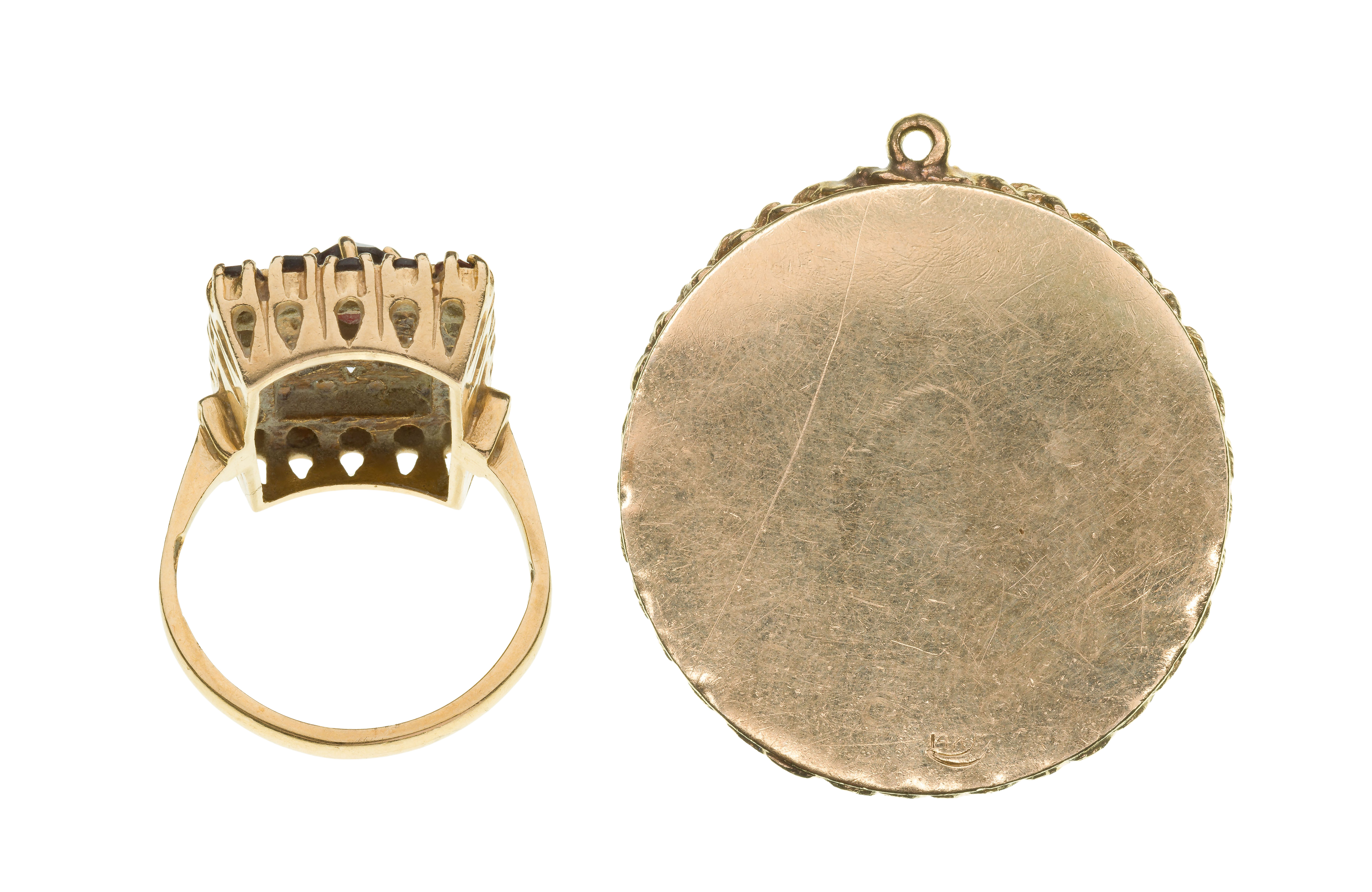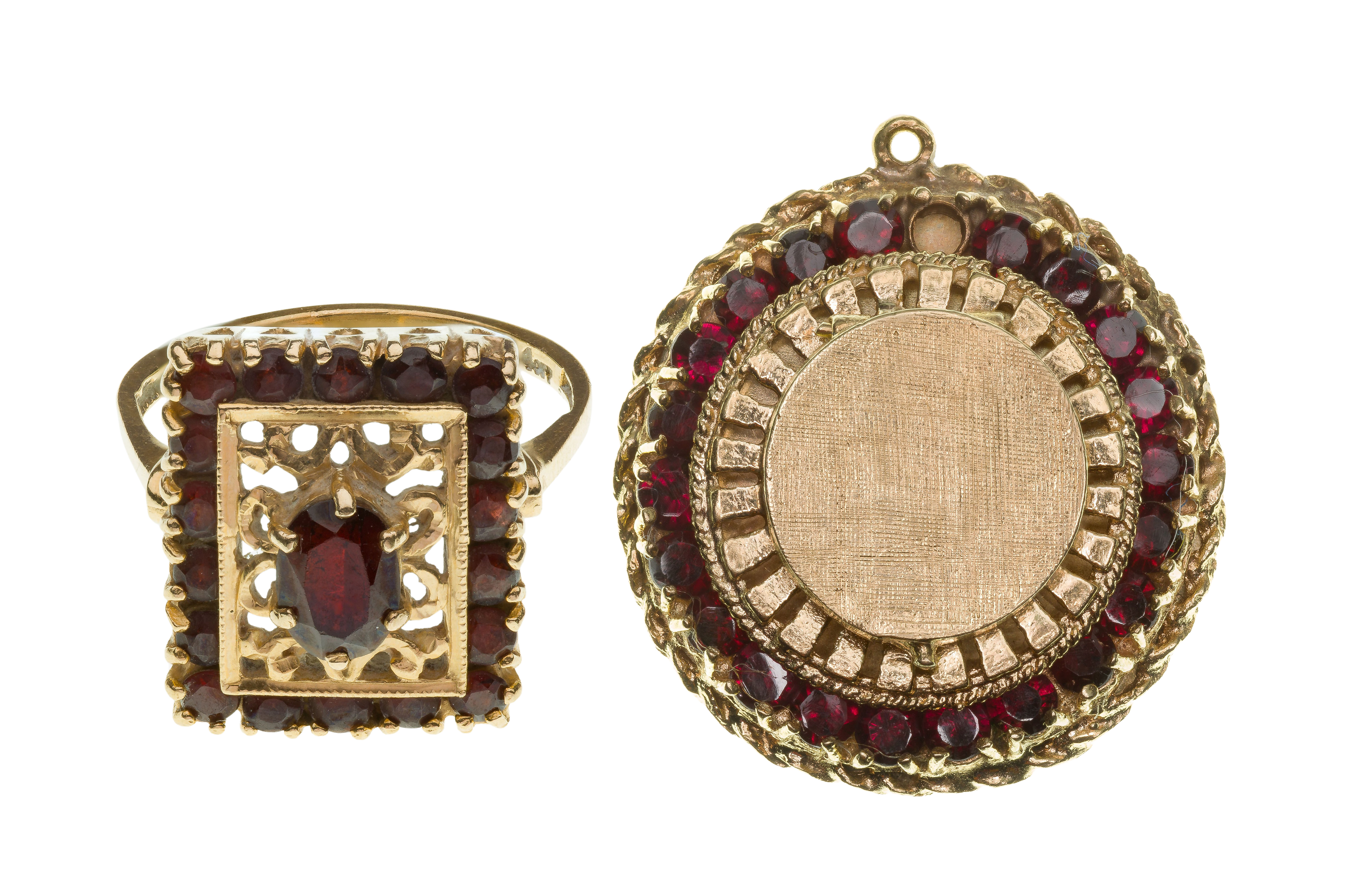 (2) items including an oval cut garnet in a square setting flanked on all sides by round cut garnets as well as a disc style charm having a hinged opening encircled by round cut garnets (all marked ’14k’)