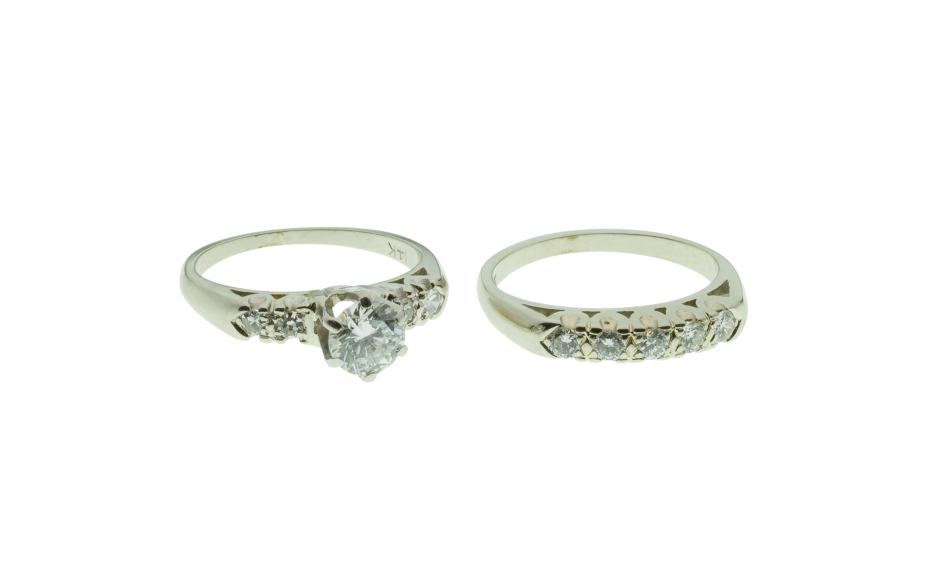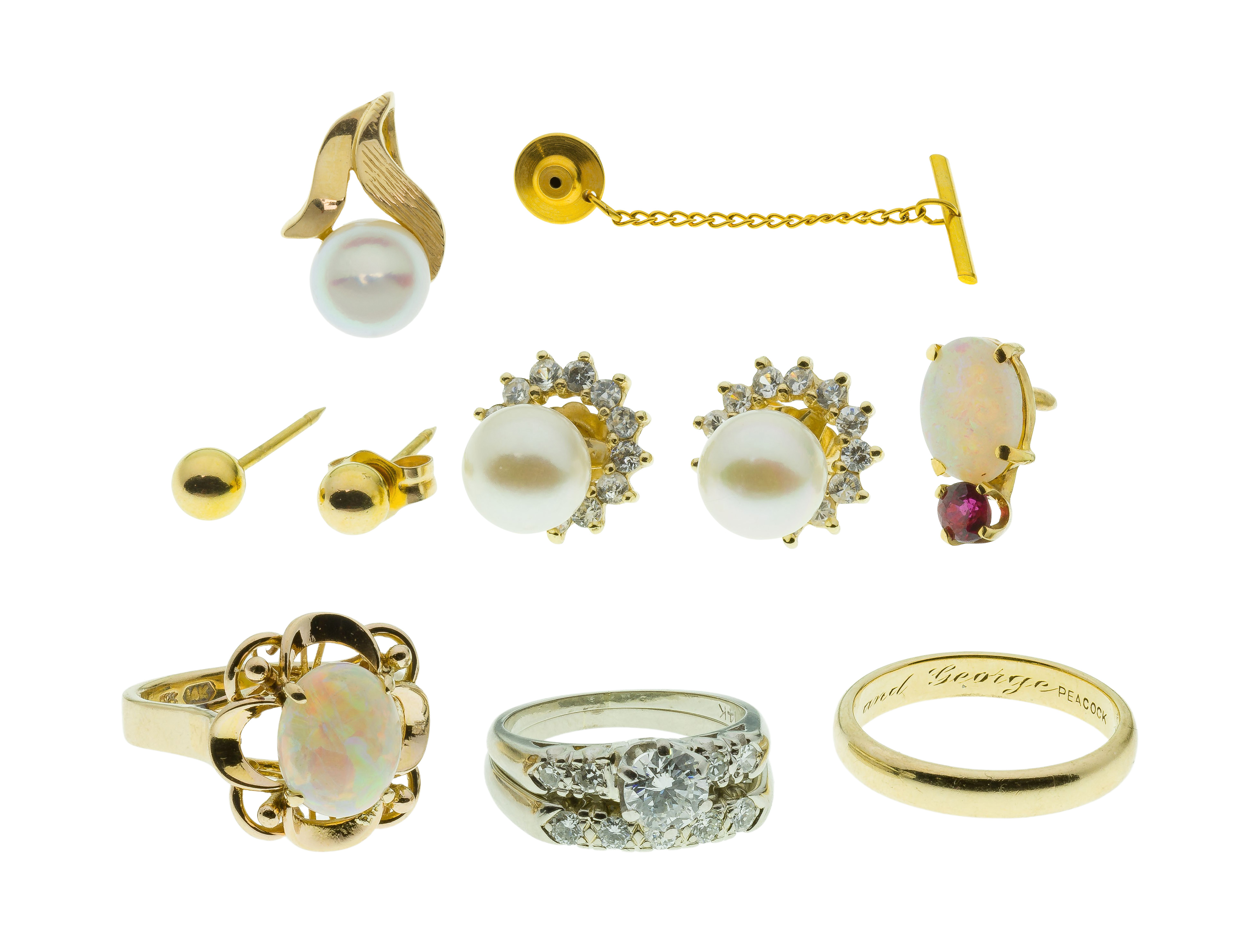 (8) items including a wedding set having a round cut solitaire diamond engagement ring and diamond accented band, a plain gold band, an oval cut opal ring, a pair of pearl studs, a pair of gold ball studs, a pearl pendant, a pair of diamond accented circular earring jackets and an opal and ruby single earring (most marked ’14k’)