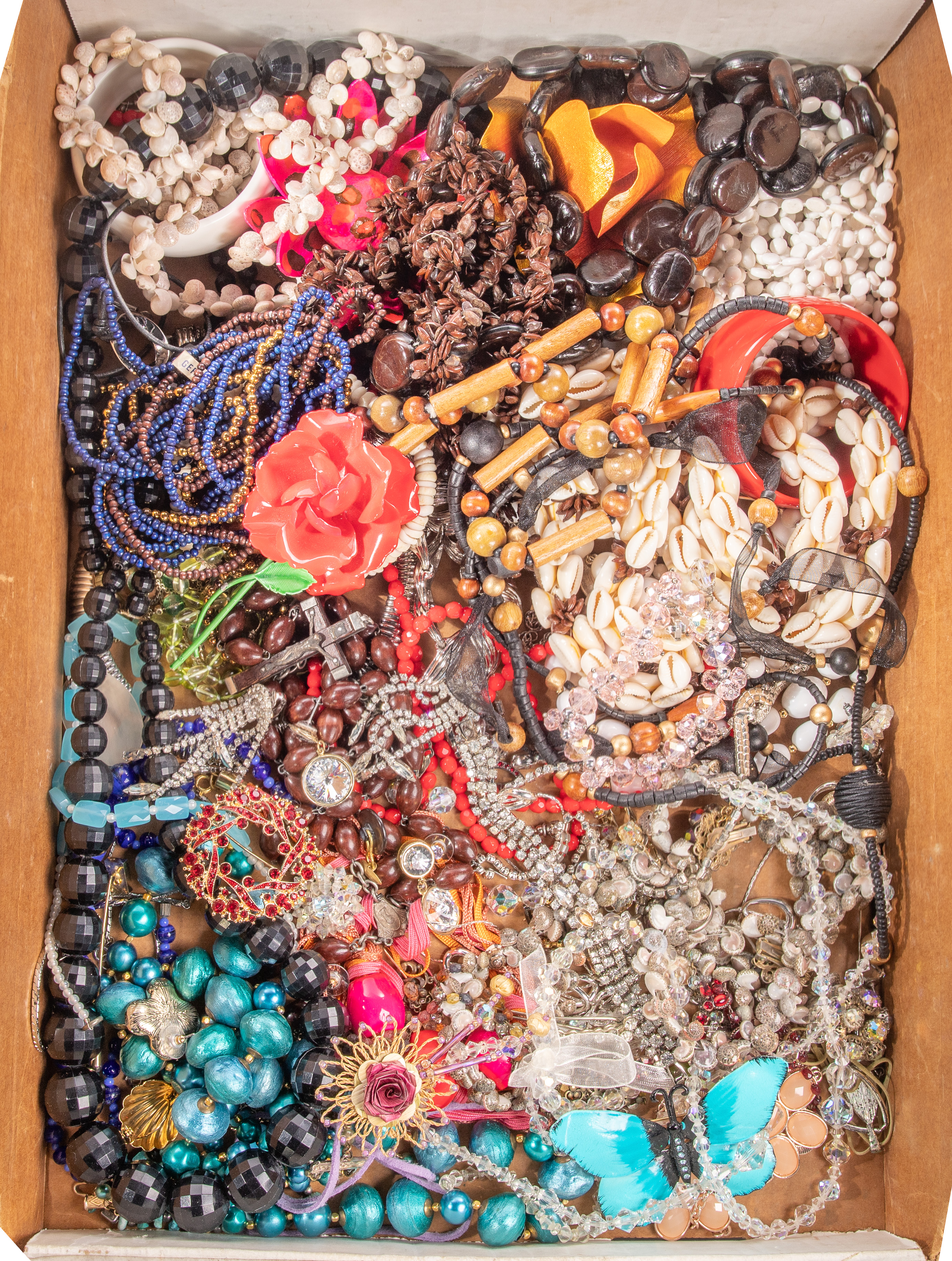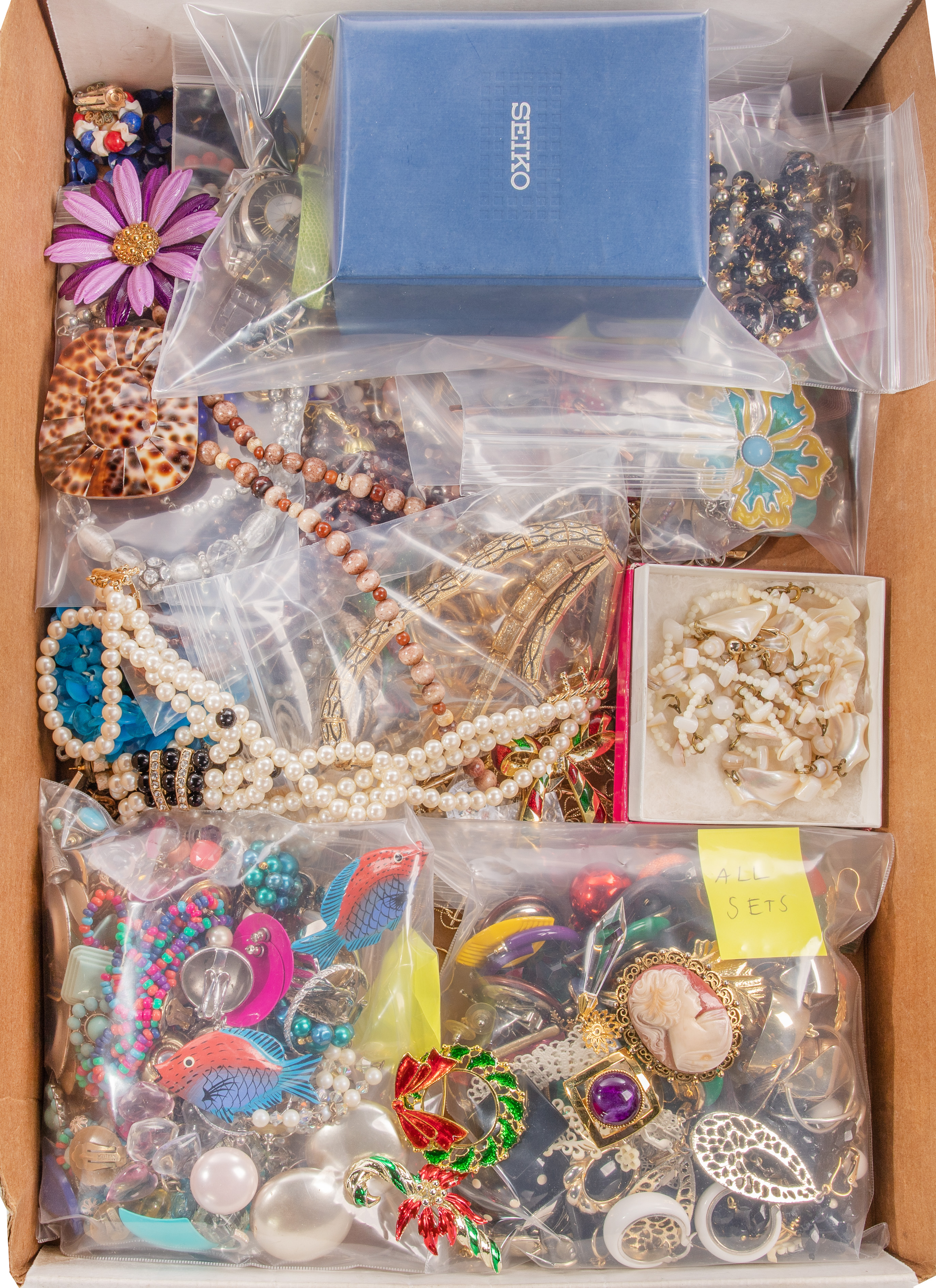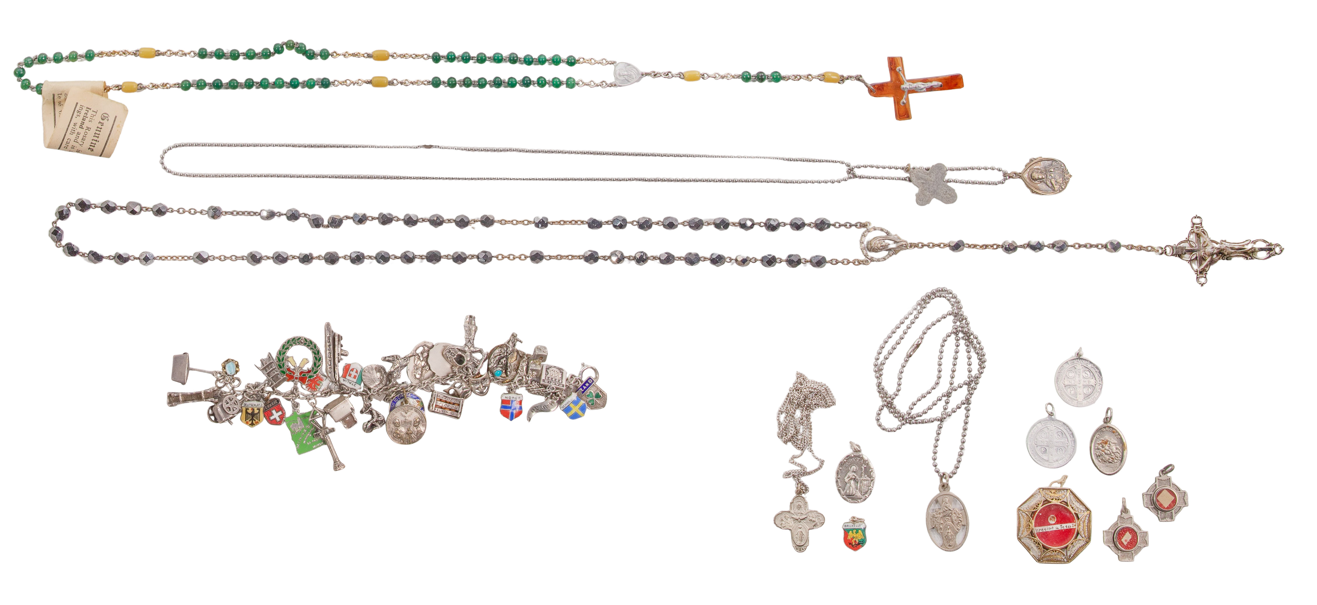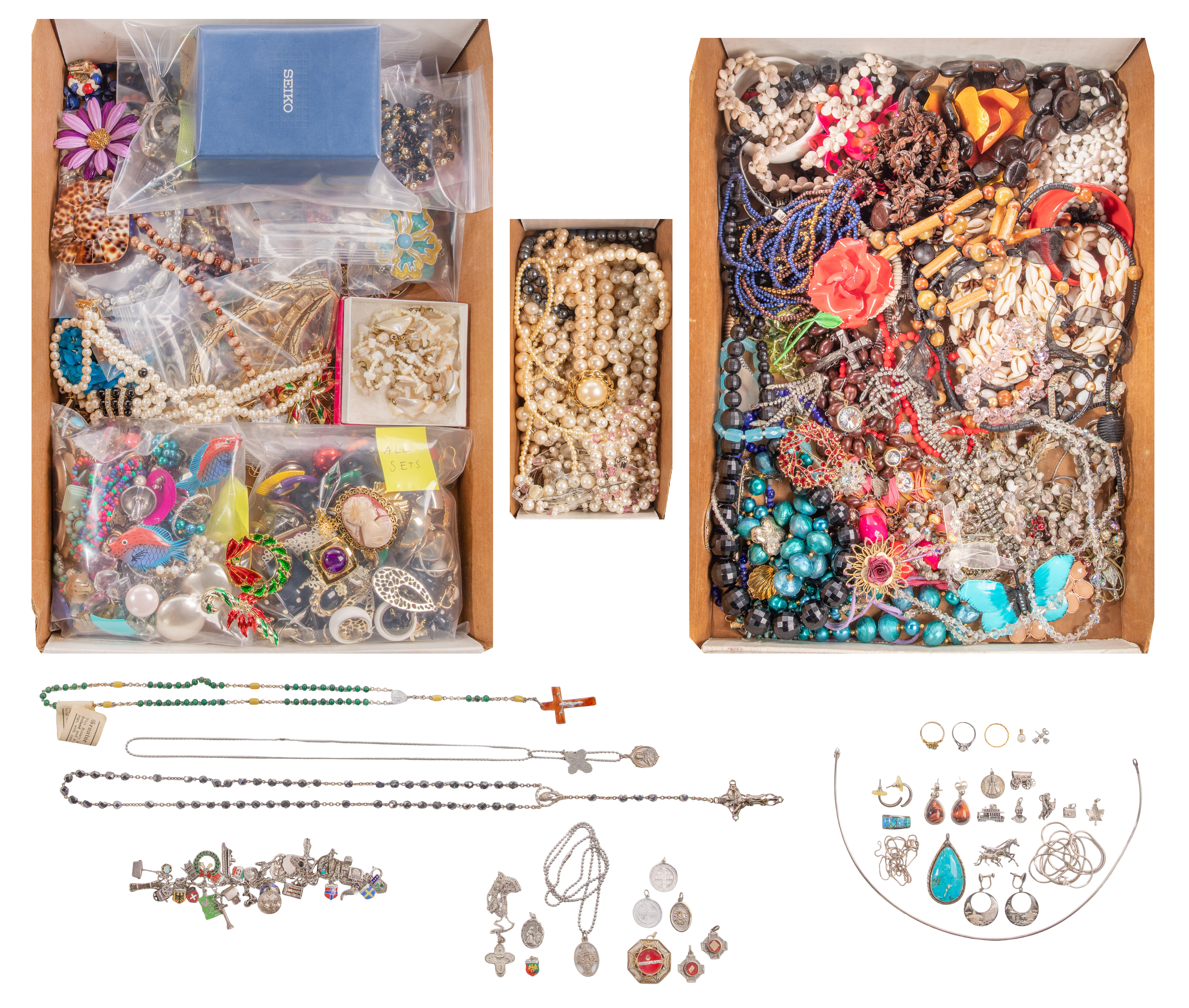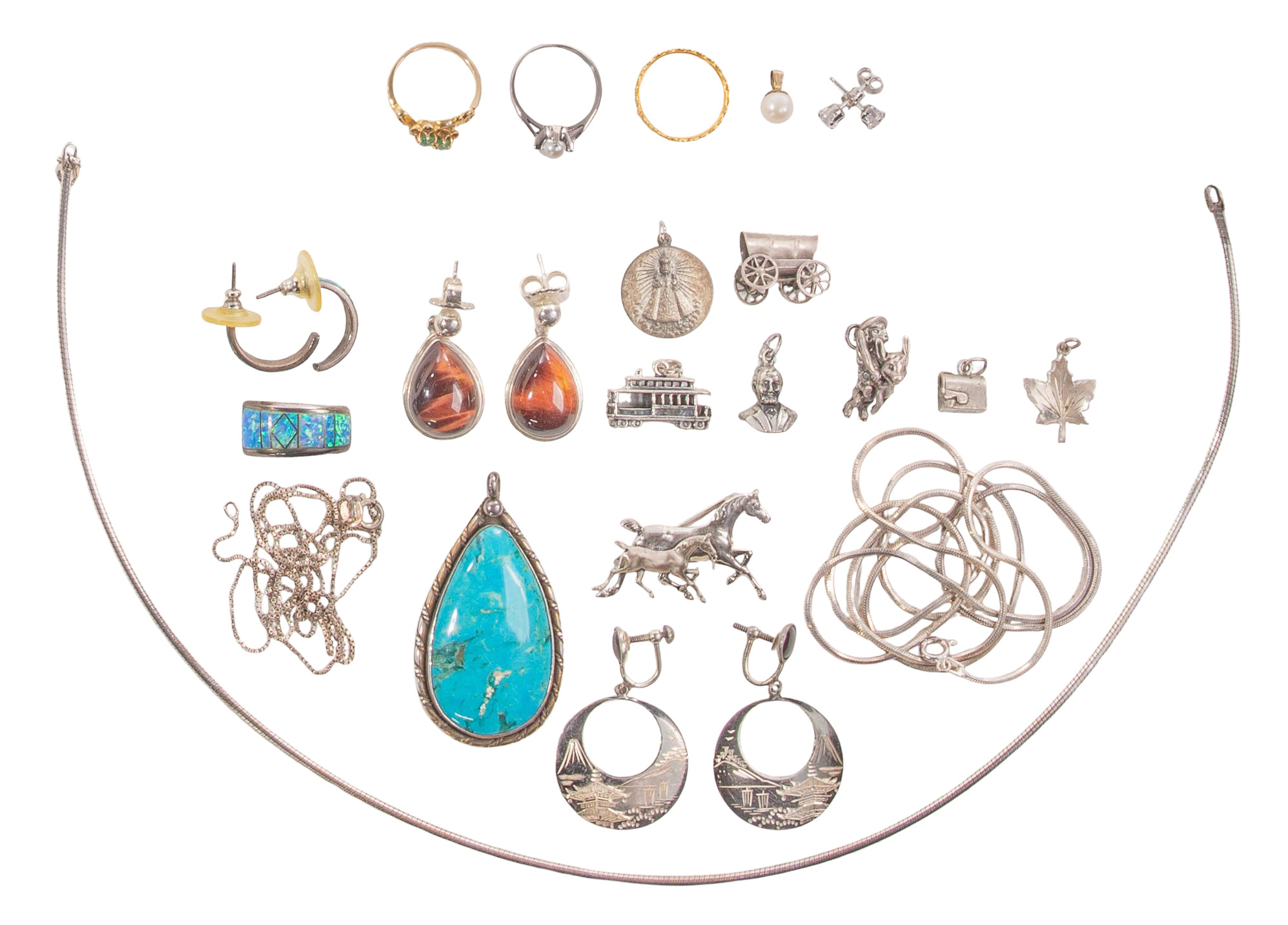 Including a band (unmarked 22k) having alternating disk and rosette motif, a white gold and pearl ring (marked ’10k’), a ring, a pair of earrings having stones and a pearl pendant (unmarked 10k), a turquoise pendant, a wrapped wire choker, (2) chain necklaces, (3) pairs of earrings, a brooch and (8) charms (all marked ‘925’ / ‘sterling’), a charm bracelet having approximately (30) charms (unmarked 0.925 silver), a reliquary pendant, rosaries and religious medals as well as approximately (15) pounds of costume jewelry including sets