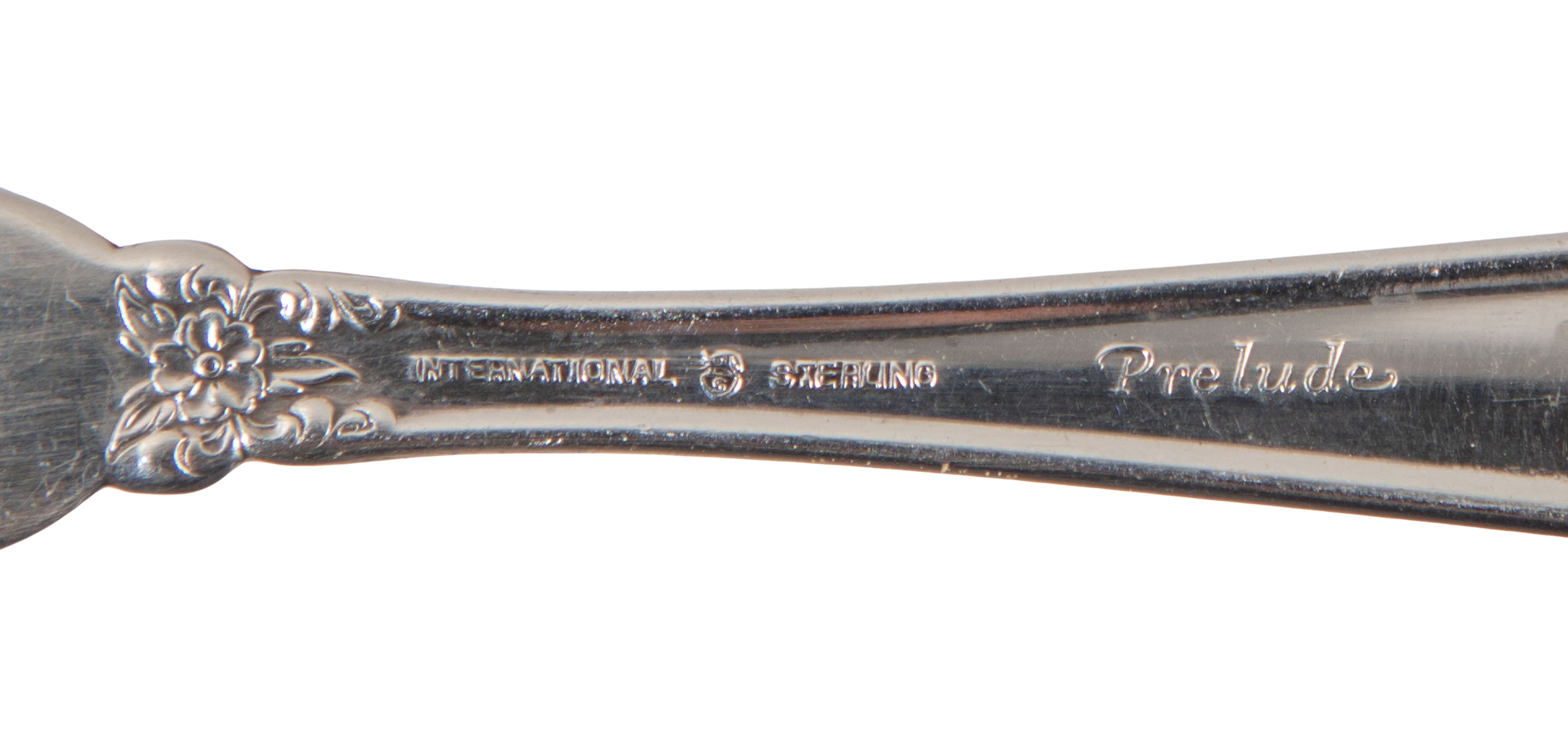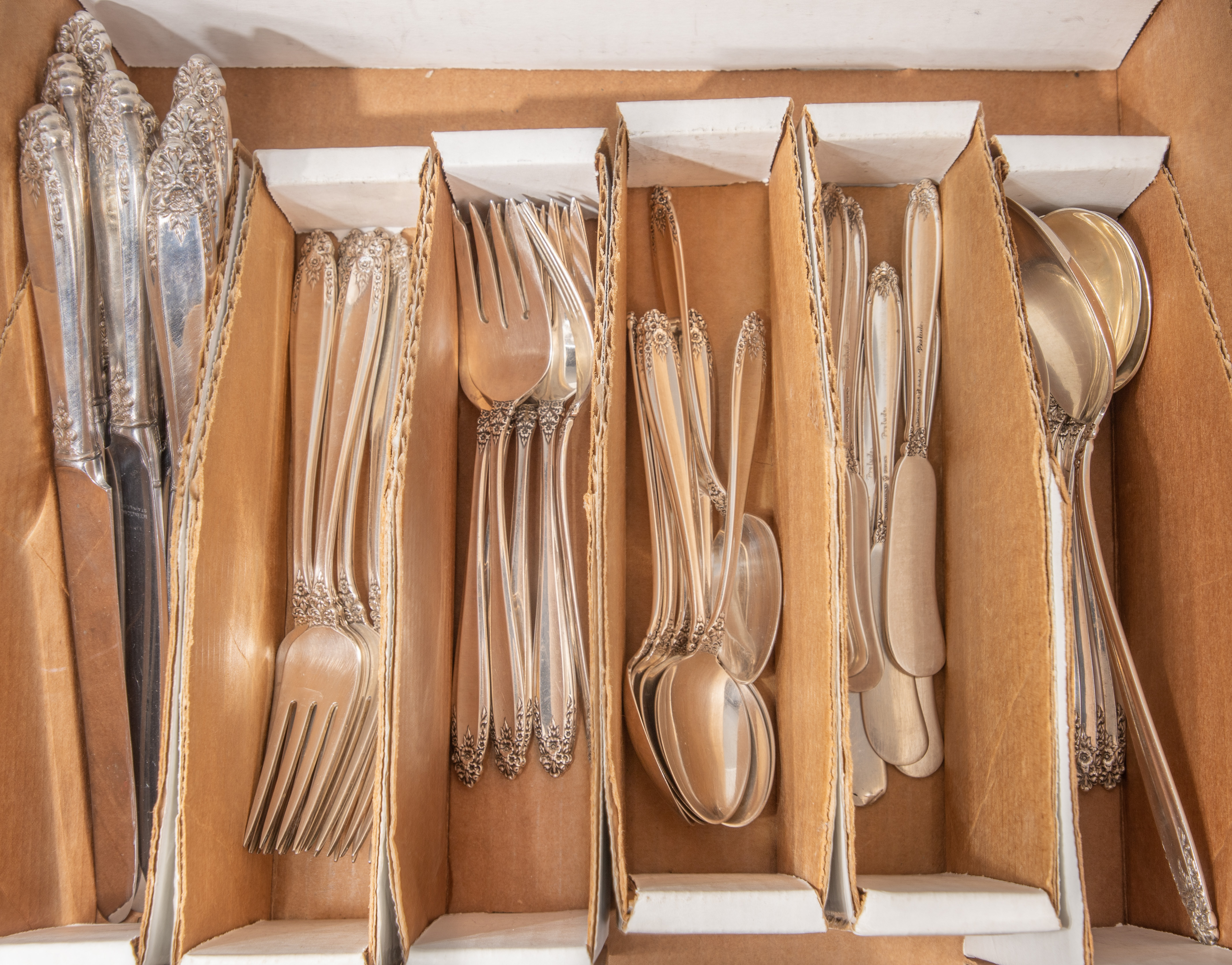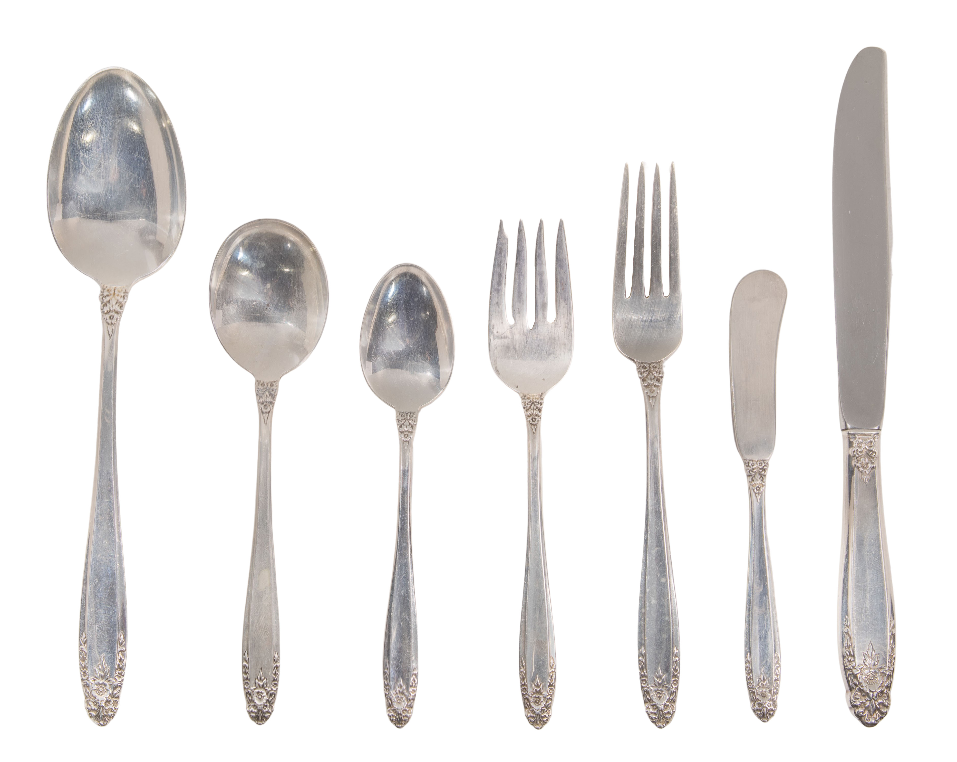 (47) total items including (8) 9-inch dinner knives, (8) 5 3/4-inch solid butter knives, (7) 7 1/4-inch dinner forks, (7) 6 1/2-inch salad forks, (8) 6-inch teaspoons, (7) 6 1/4-inch round soup spoons and (1) serving utensil; together with a weighted sterling silver handle (all marked ‘sterling’)