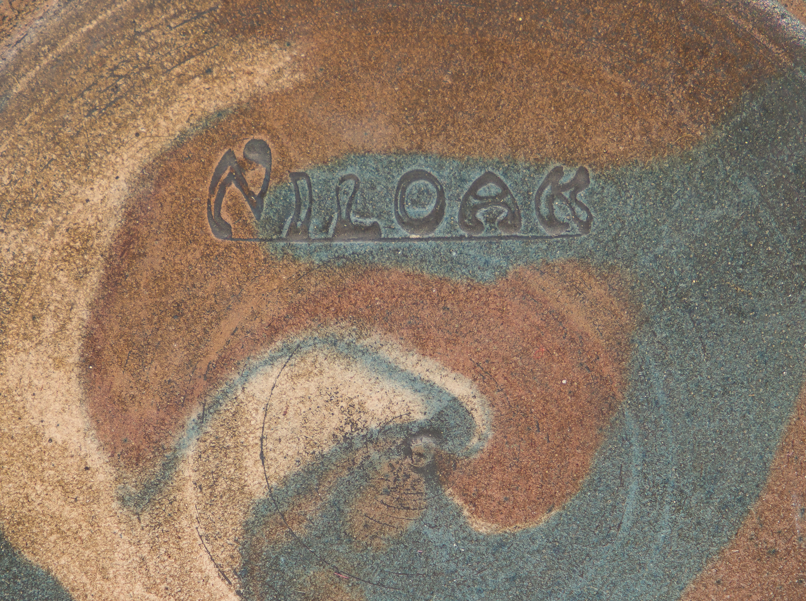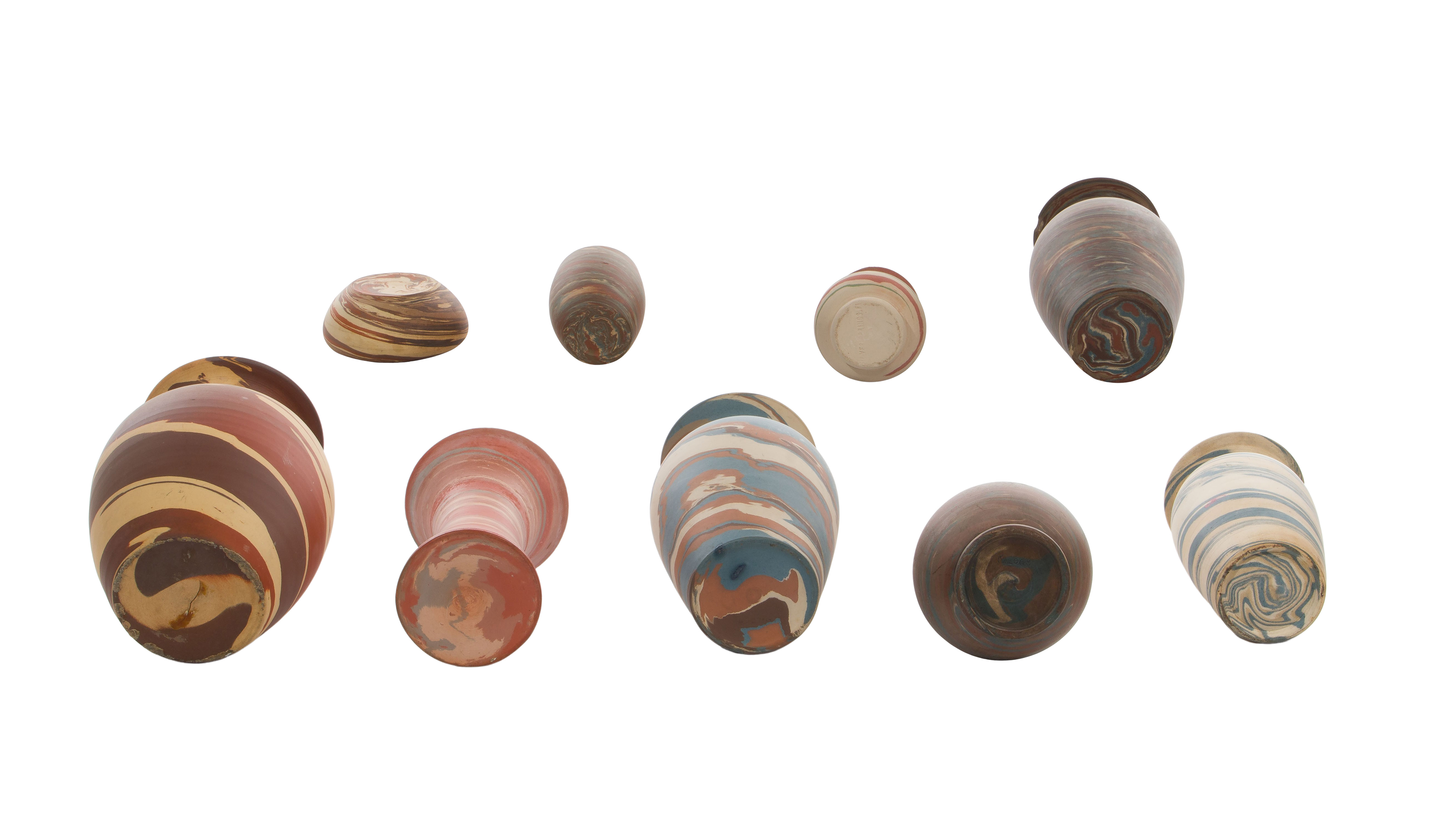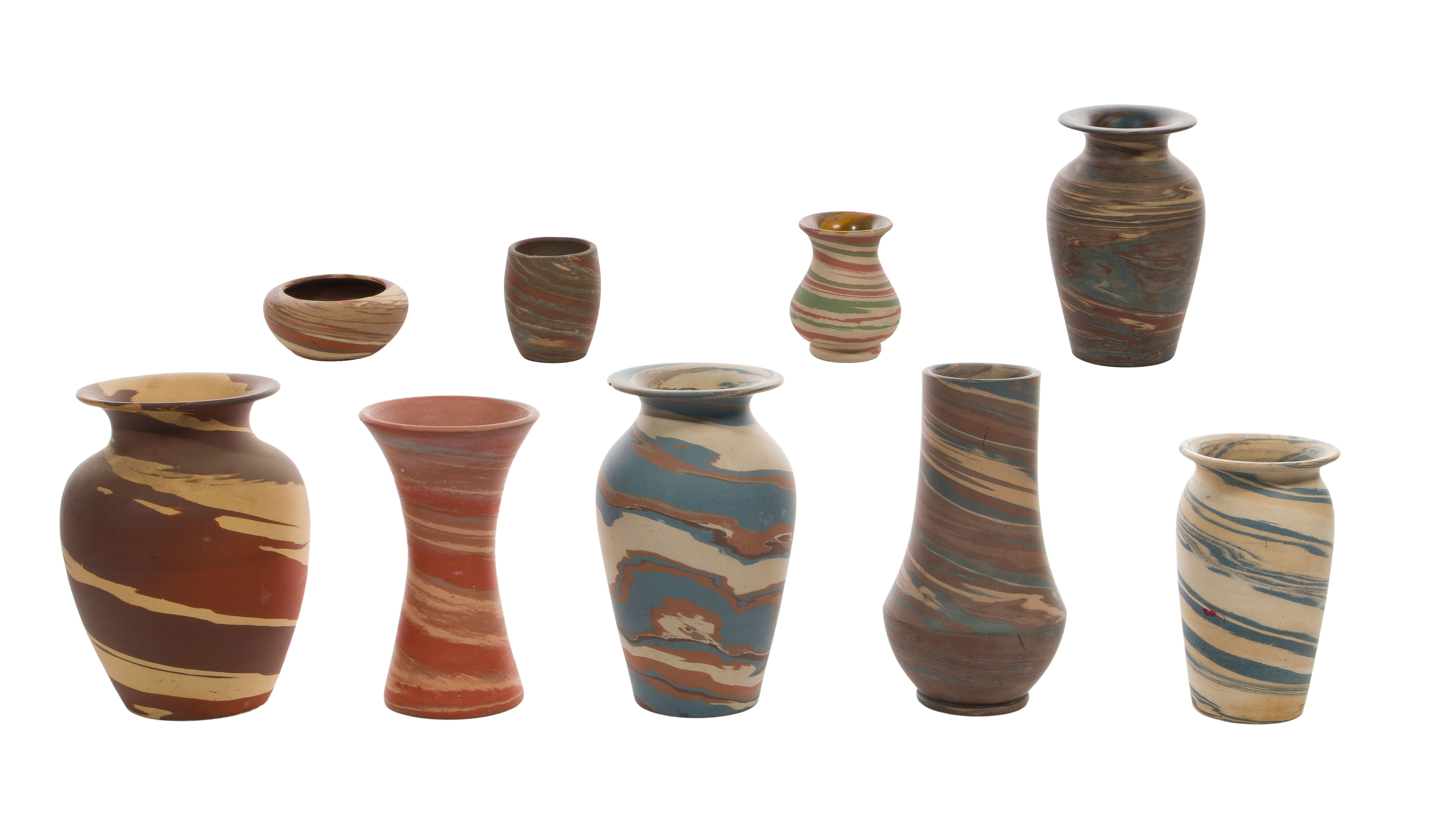 (9) total items including (2) vases, each having impressed maker mark to the underside; together with Niloak style including (4) pottery vases, a cup, a bowl and a vase marked ‘Silver Springs, FL’ on the underside