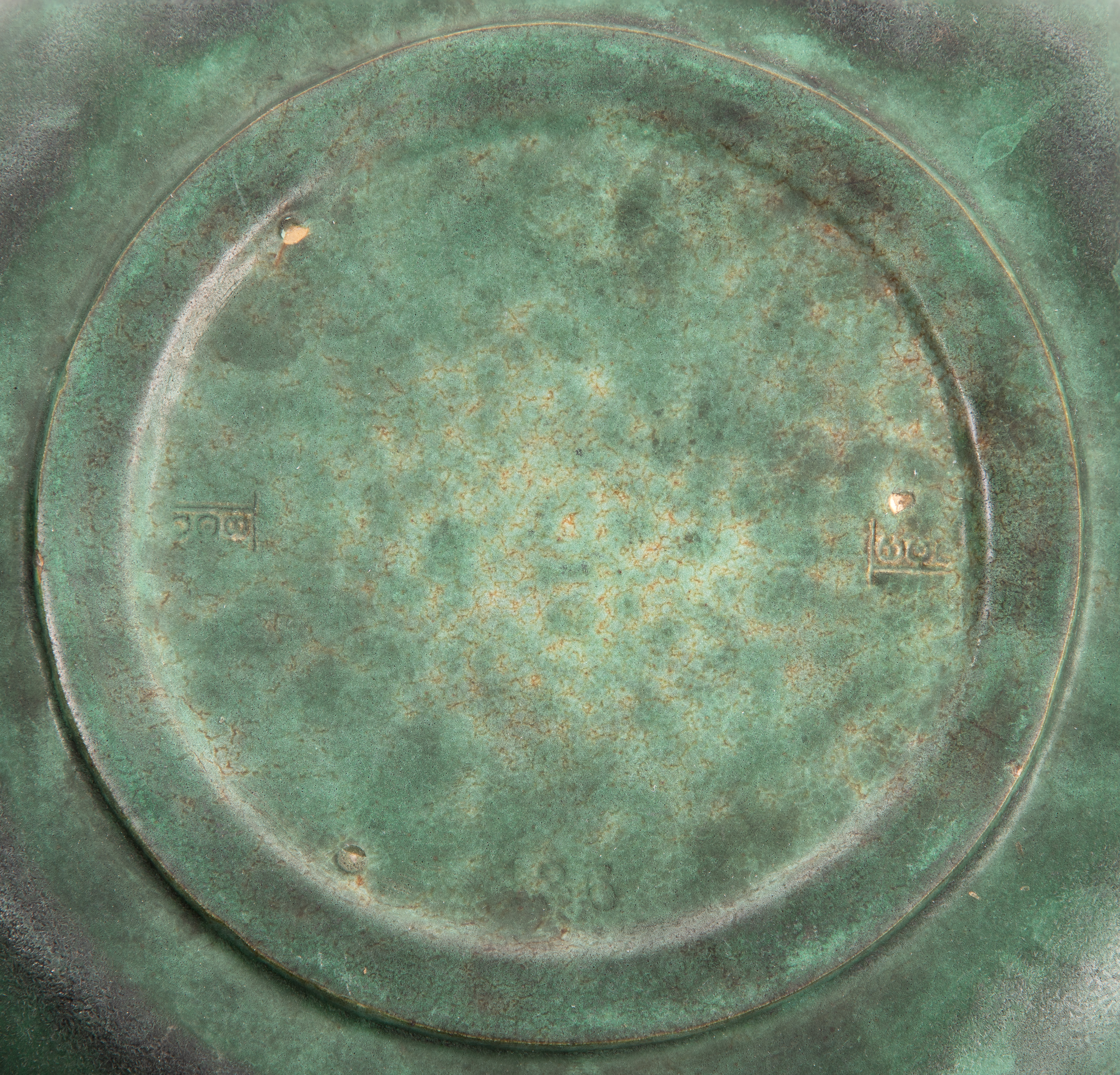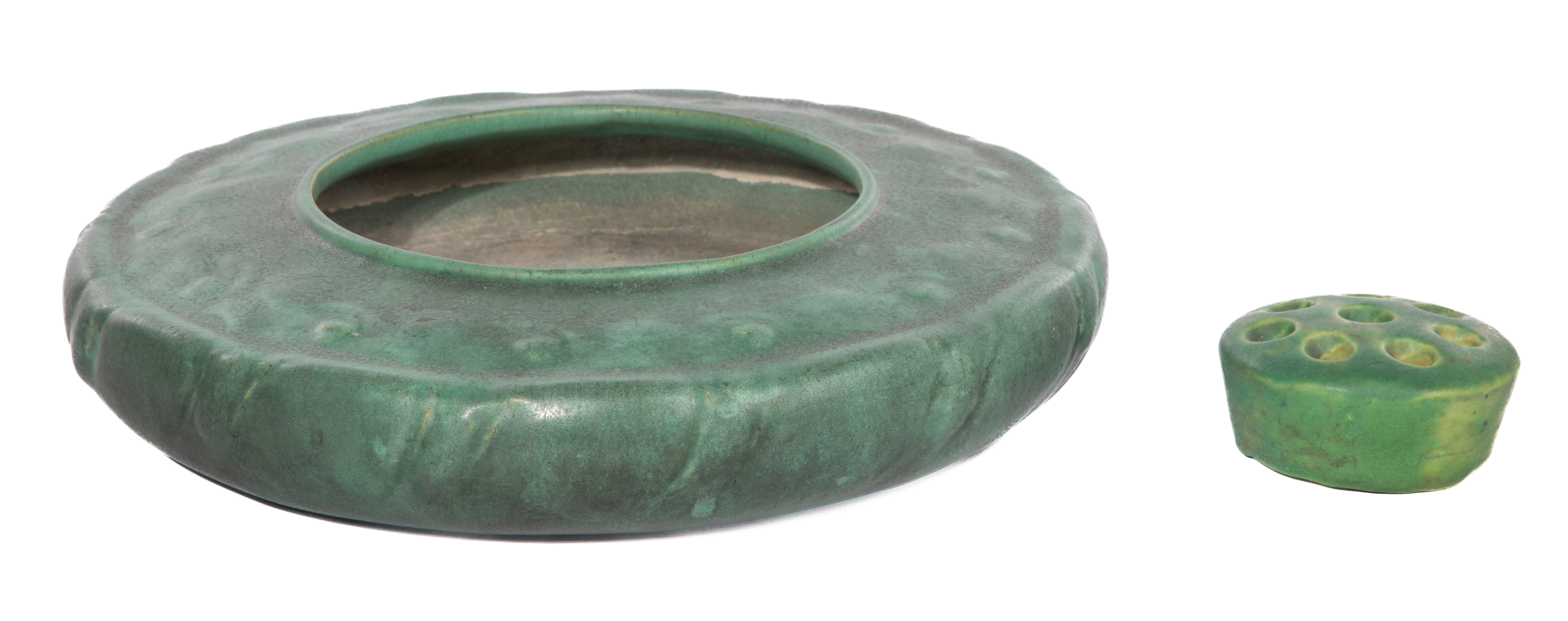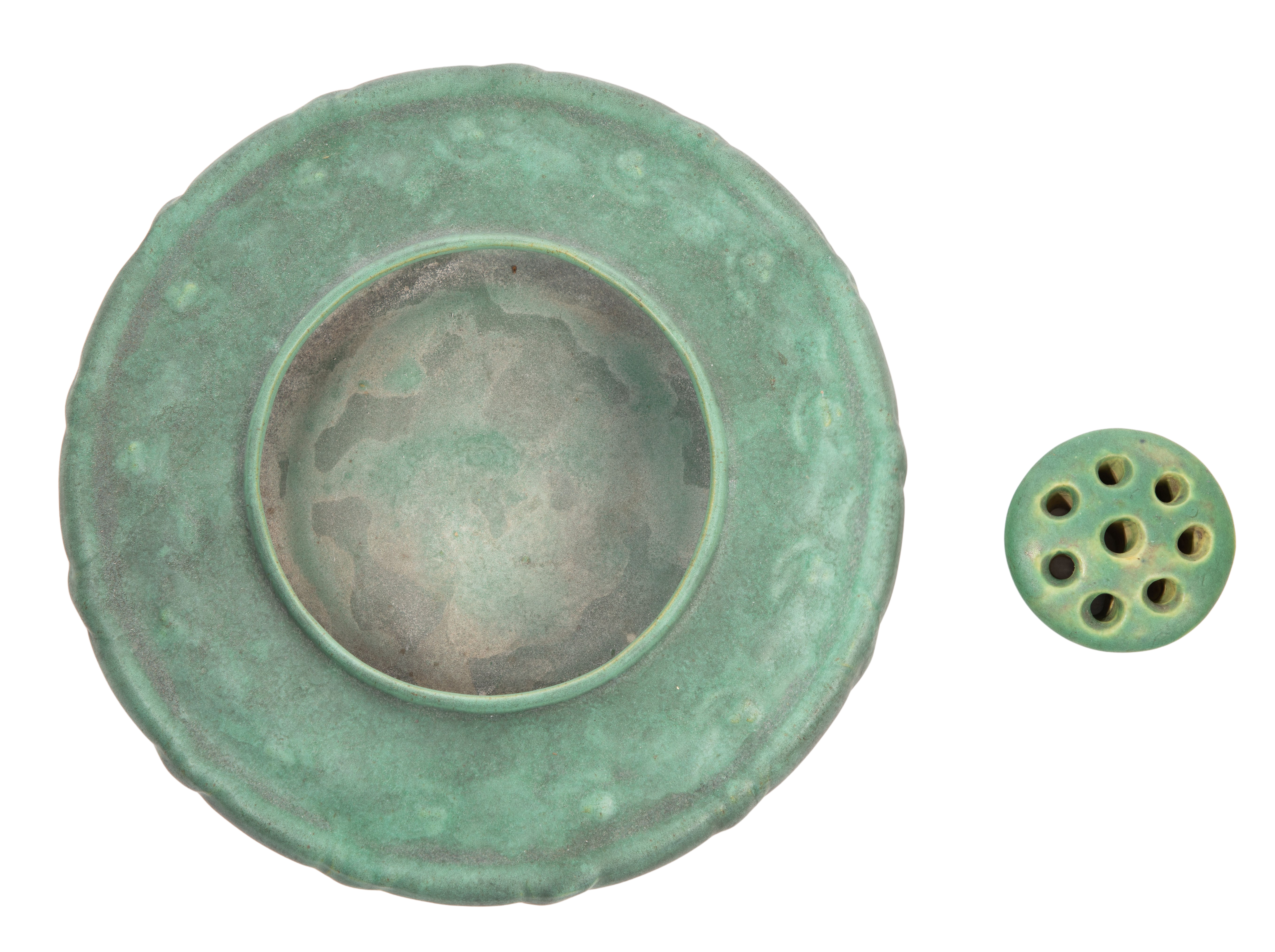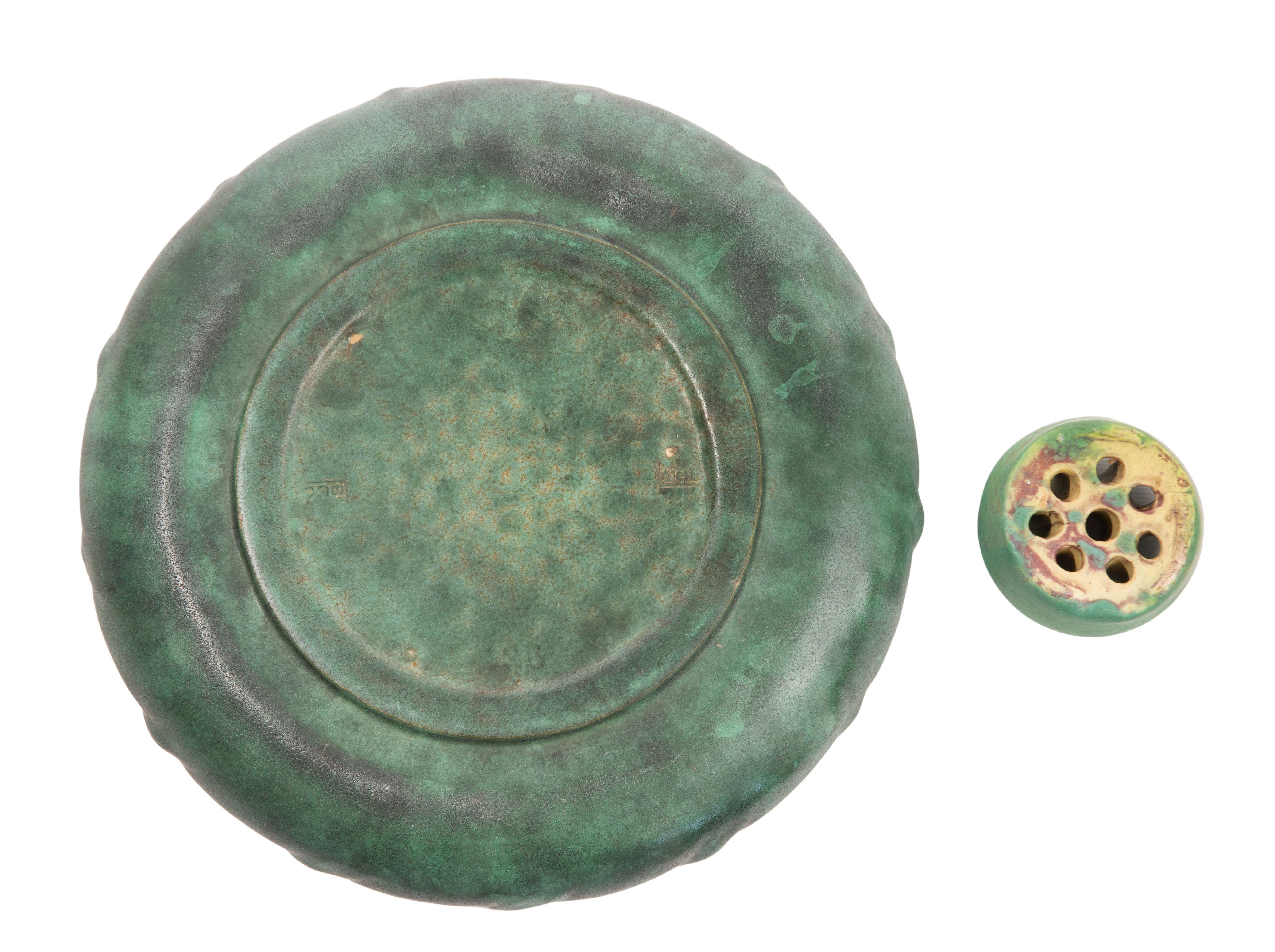 (2) total items including a bowl having a wide gently sloped shoulder, a low rolled rim, molded holly leaves and berries decoration, matte green glaze, impressed maker mark and firing stilt scars underside; together with an unmarked flower frog having a compatible matte green glaze