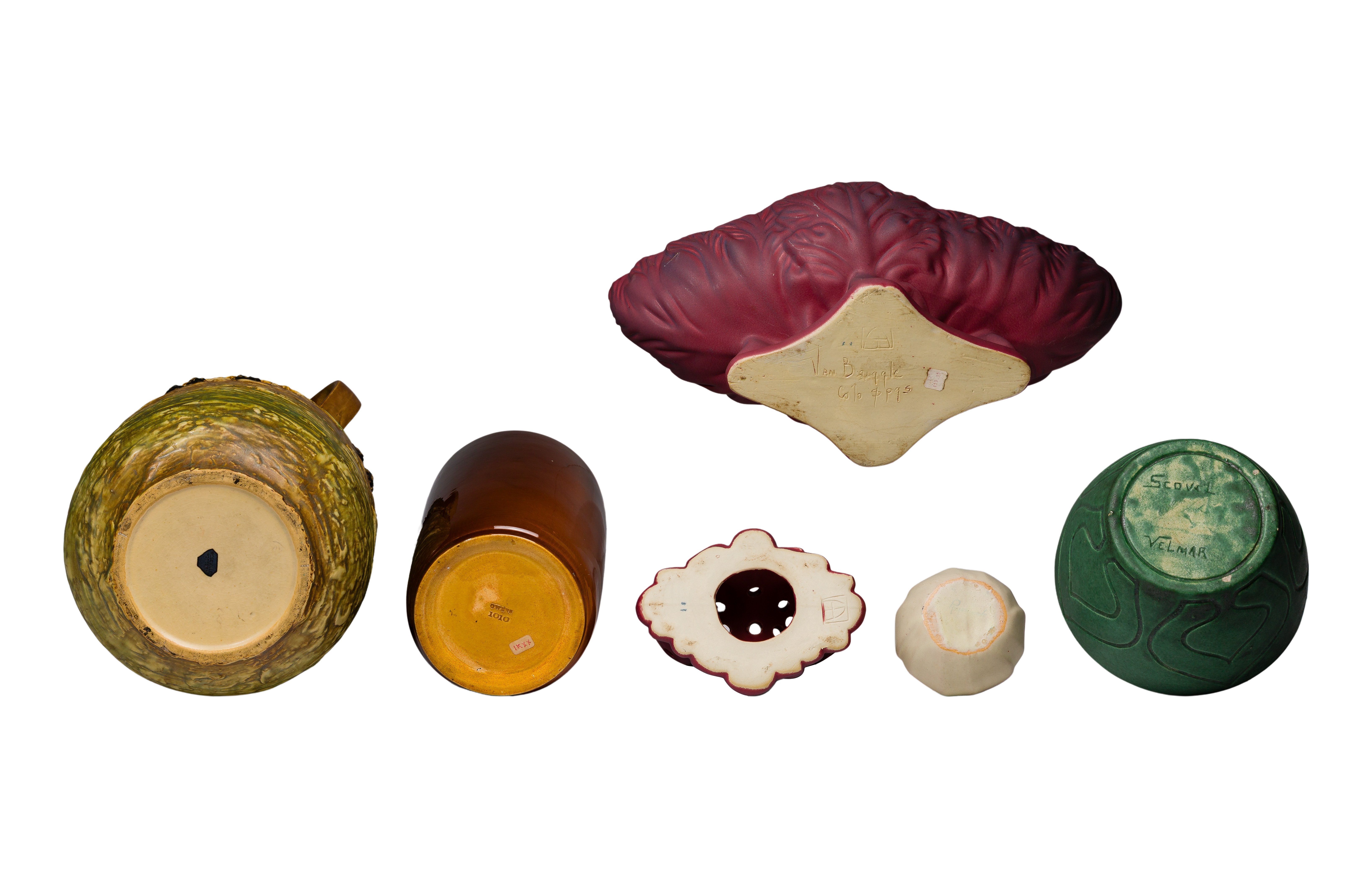 overall light wear consistent with normal use, Van Briggle bowl having a few surface scratches, Owens having crazing overall