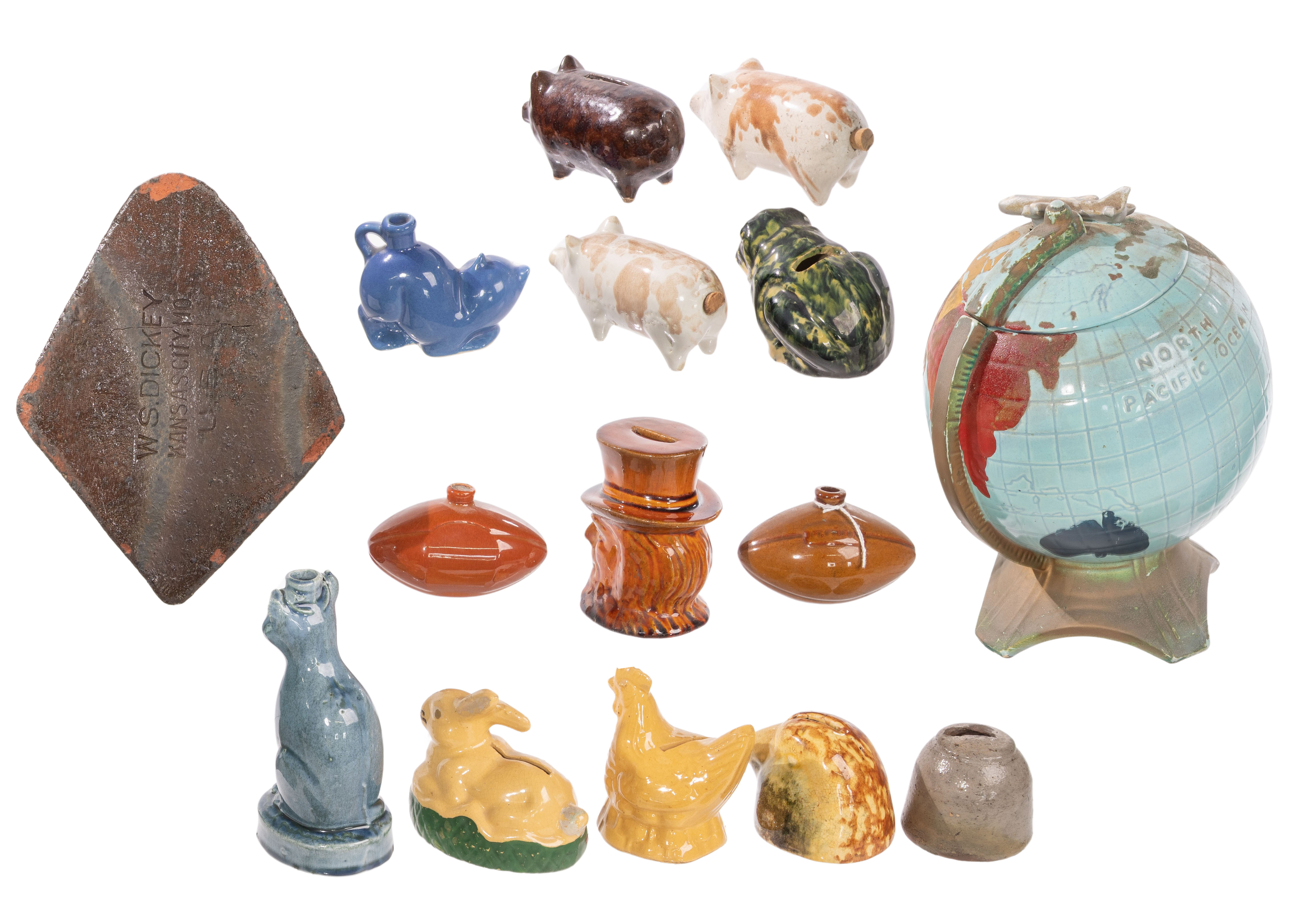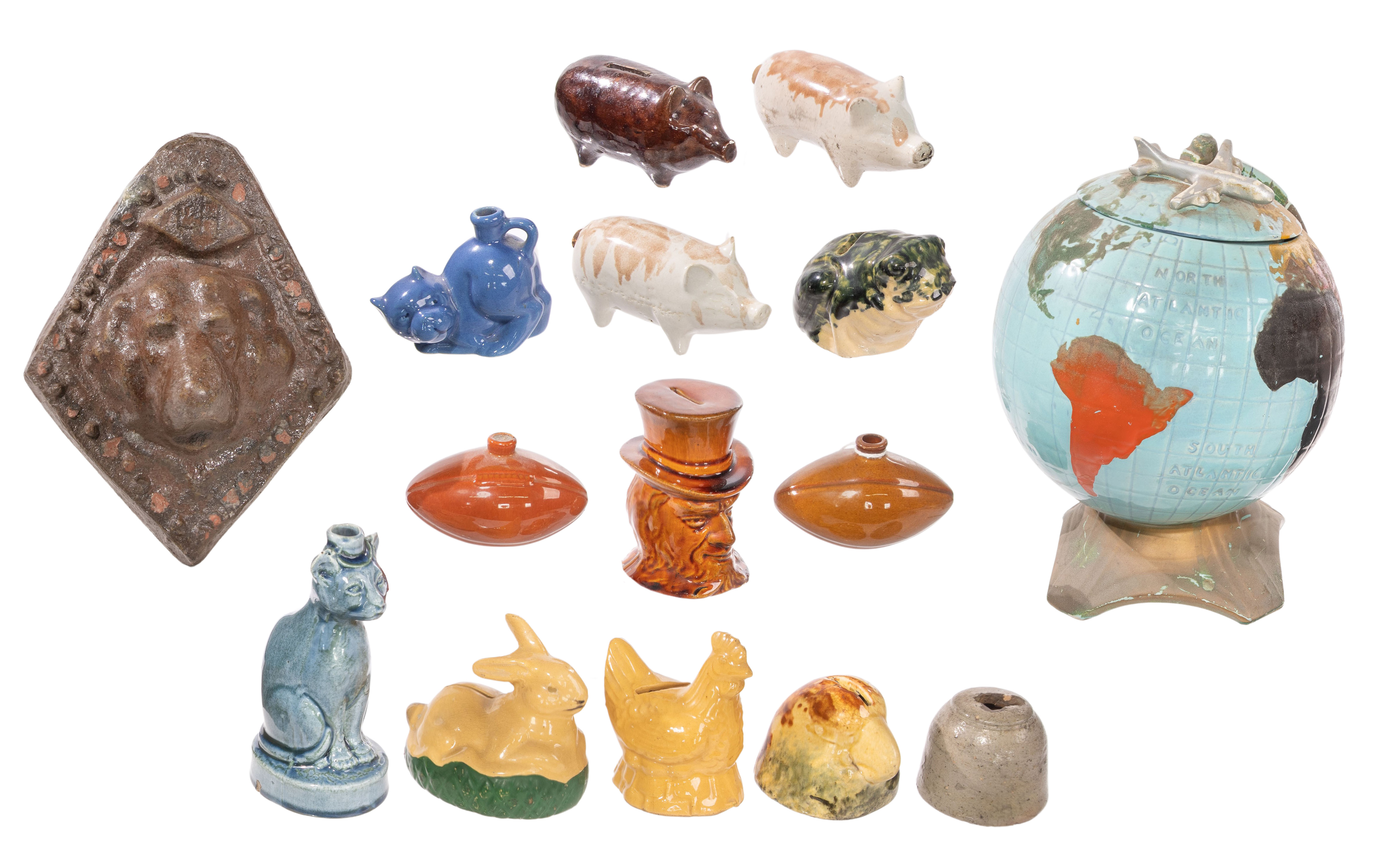 (15) items including a globe cookie jar marked ‘McCoy’, a dog relief tile marked ‘W. S. Dickey’, (7) banks and (6) miniature bottles
