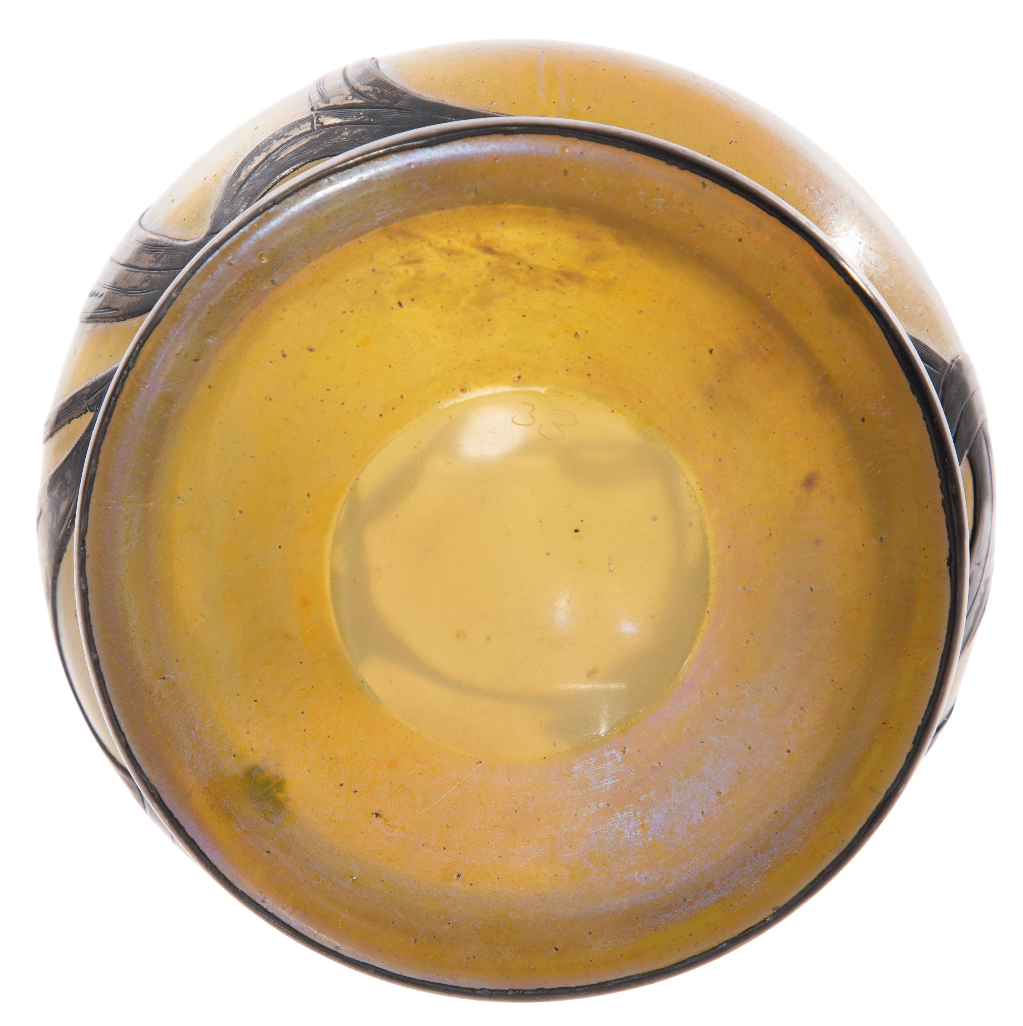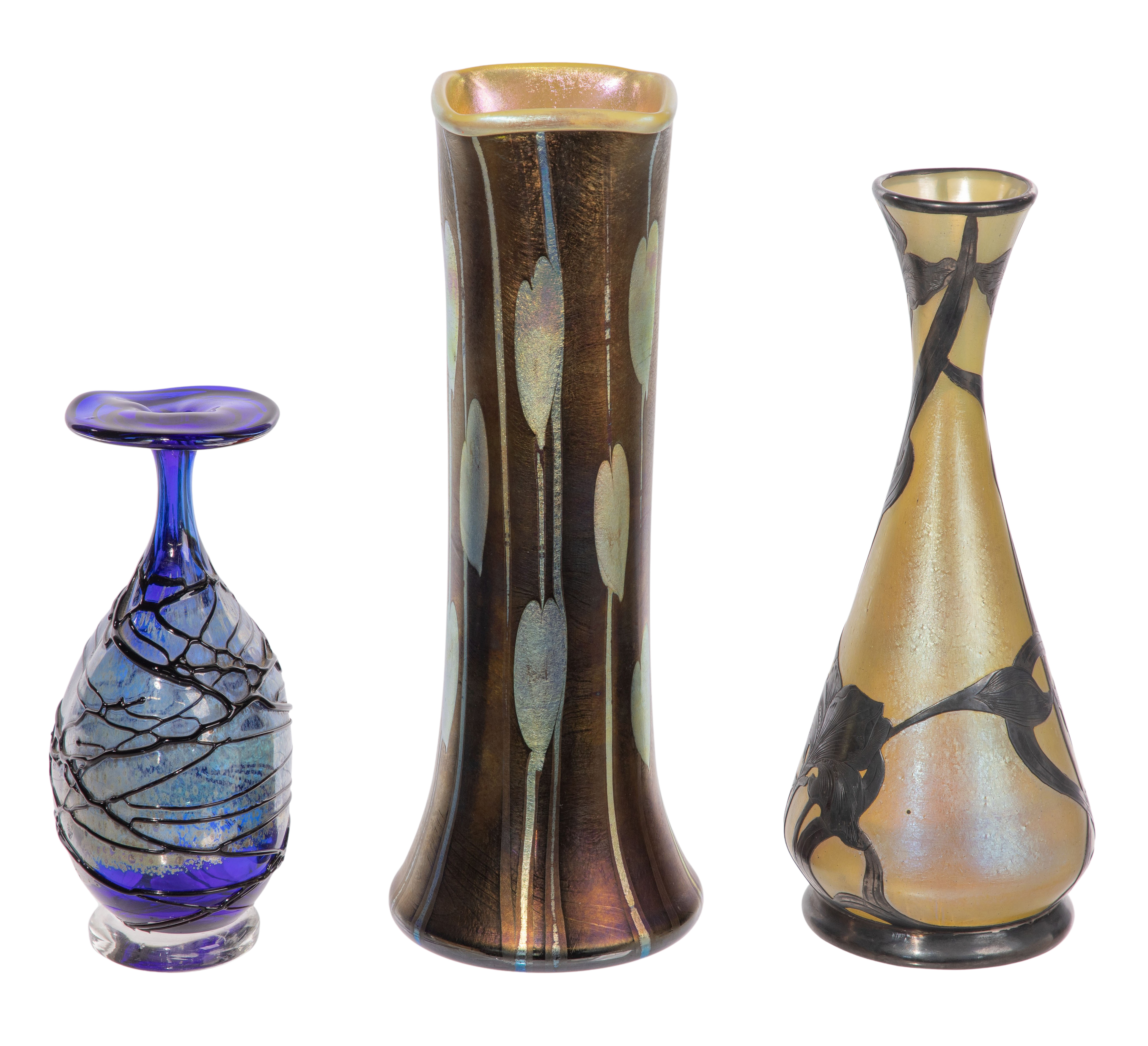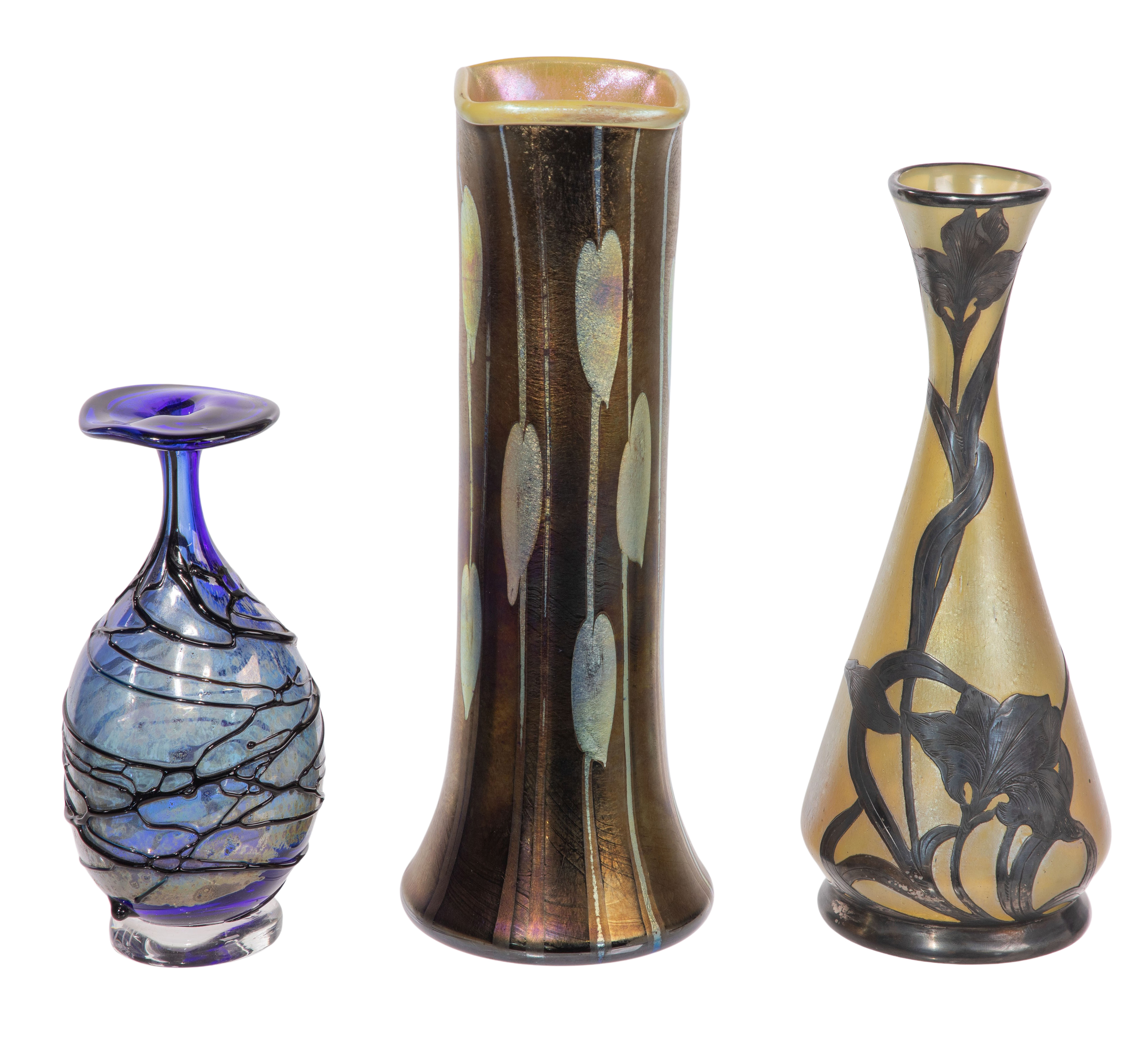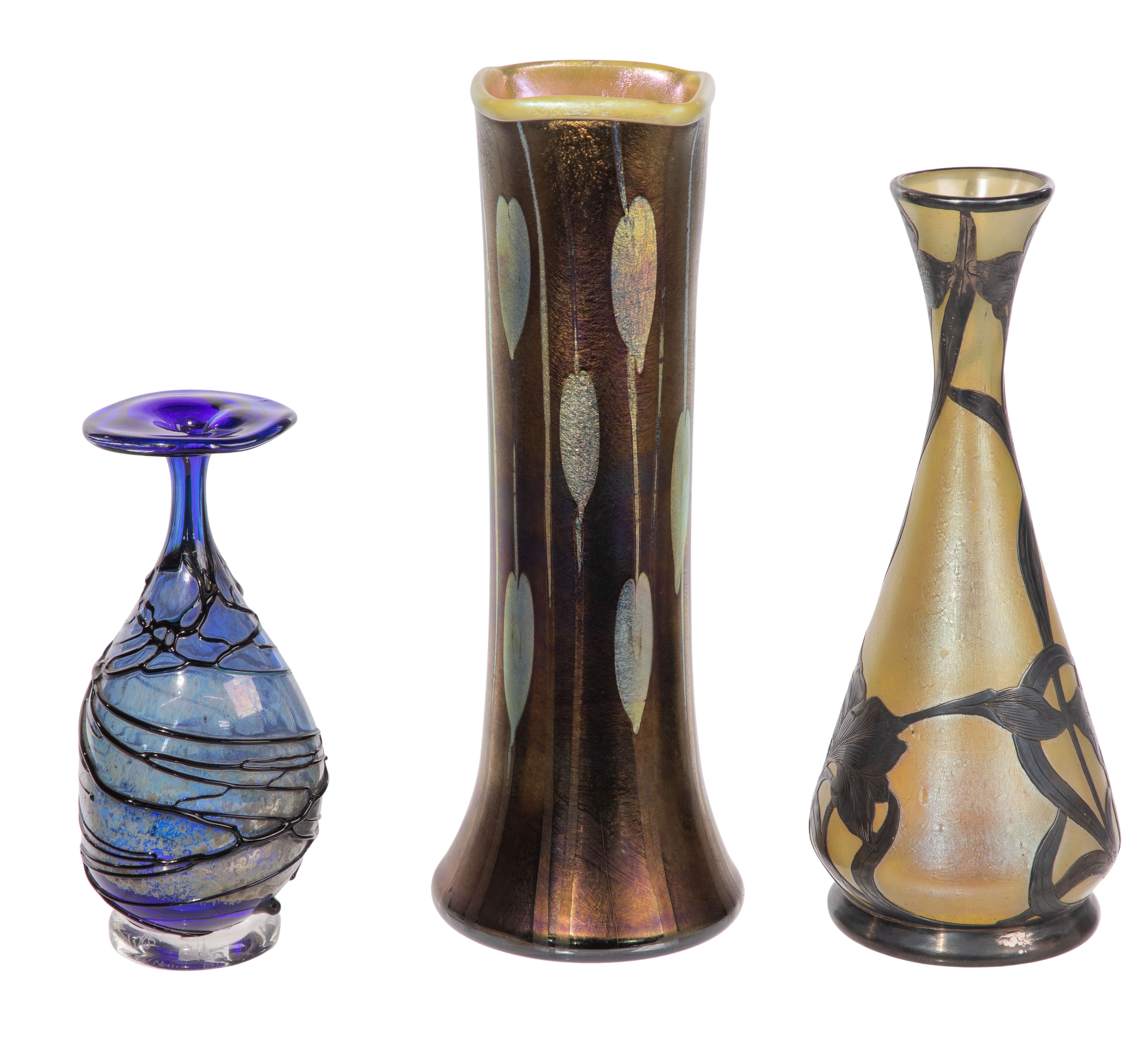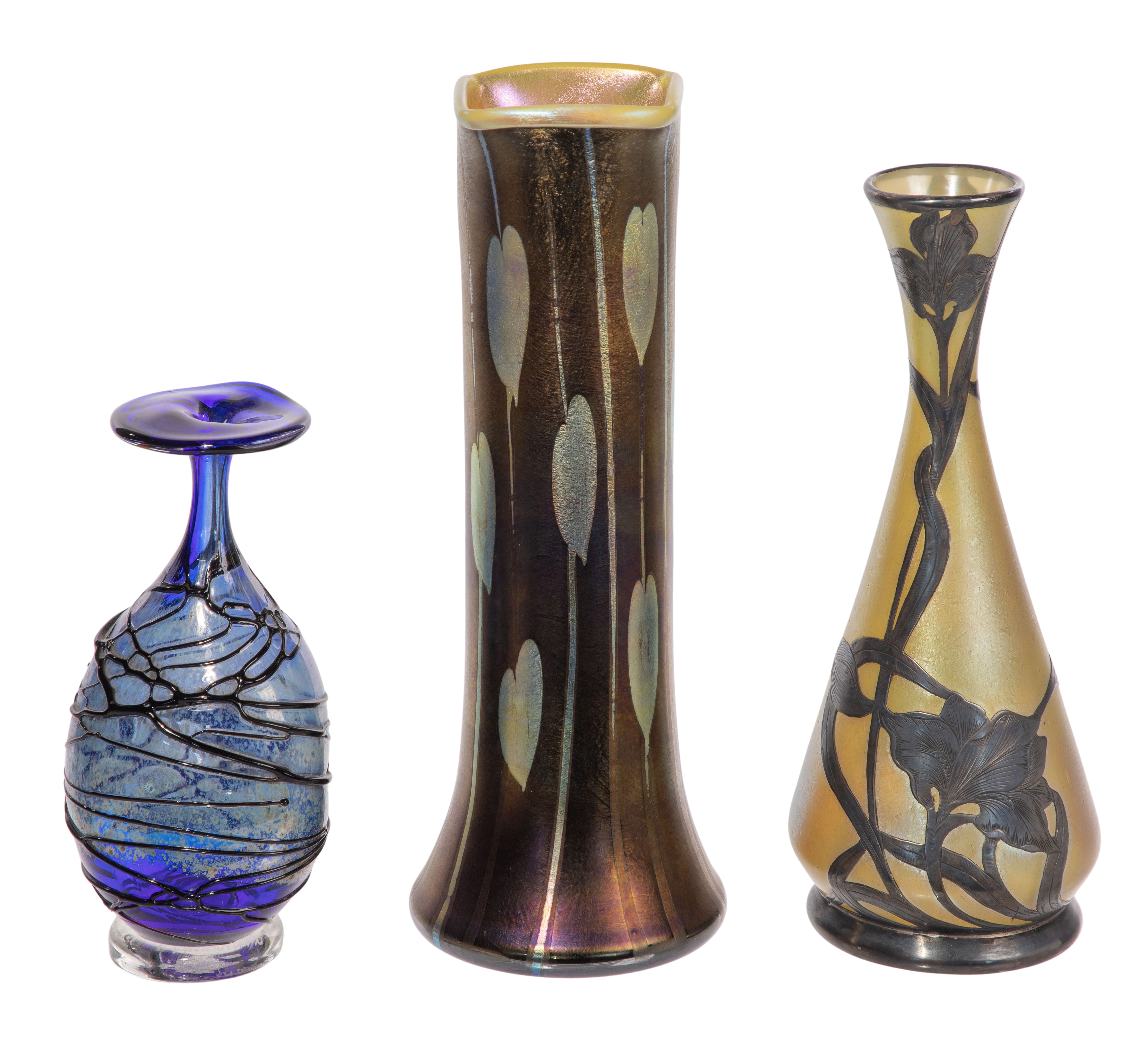 (3) items, all unsigned, including a cobalt blue having flat rim and trailing decoration, a cased glass vase having iridescent gold foliate motif and pearlescent yellow interior and a bottle vase having iris motif silver overlay on iridescent yellow