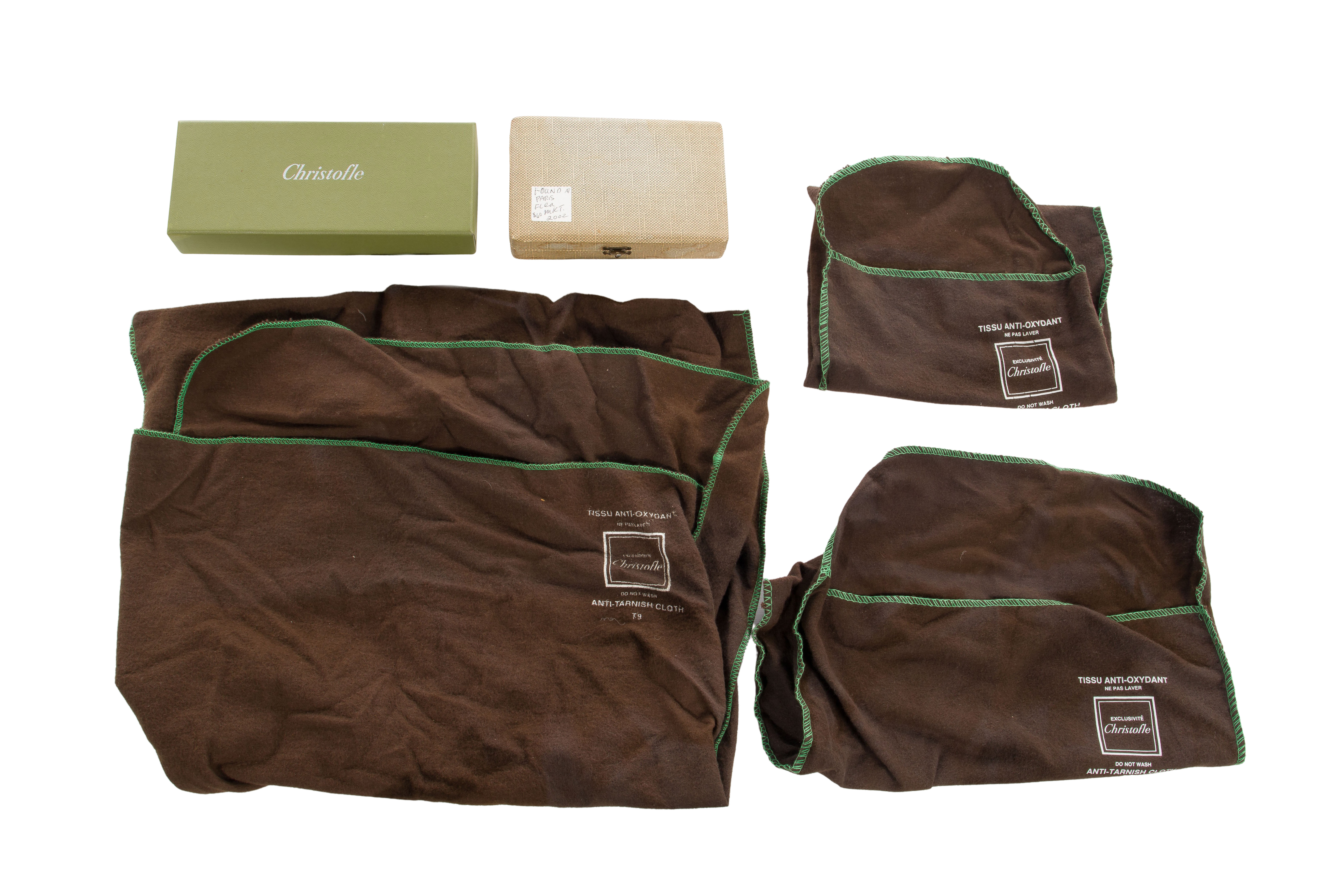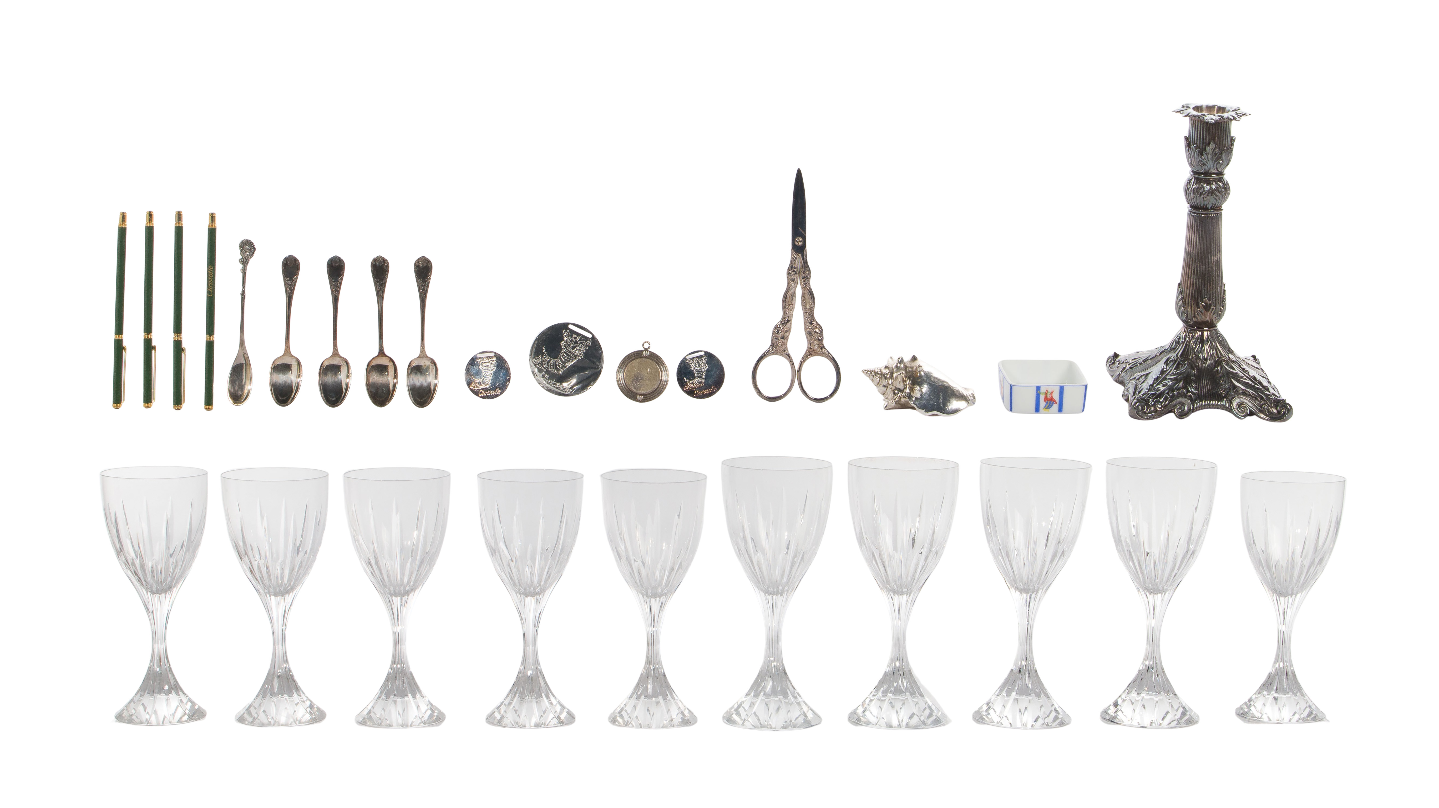 (24) items including (8) Basilique wine glasses, a silverplate candlestick in a column with foliage motif, a set of (6) boxed demitasse spoons, a pair of scissors in original box, (4) marked thin pens, (4) discs, a seashell paperweight and a porcelain trinket box, all marked