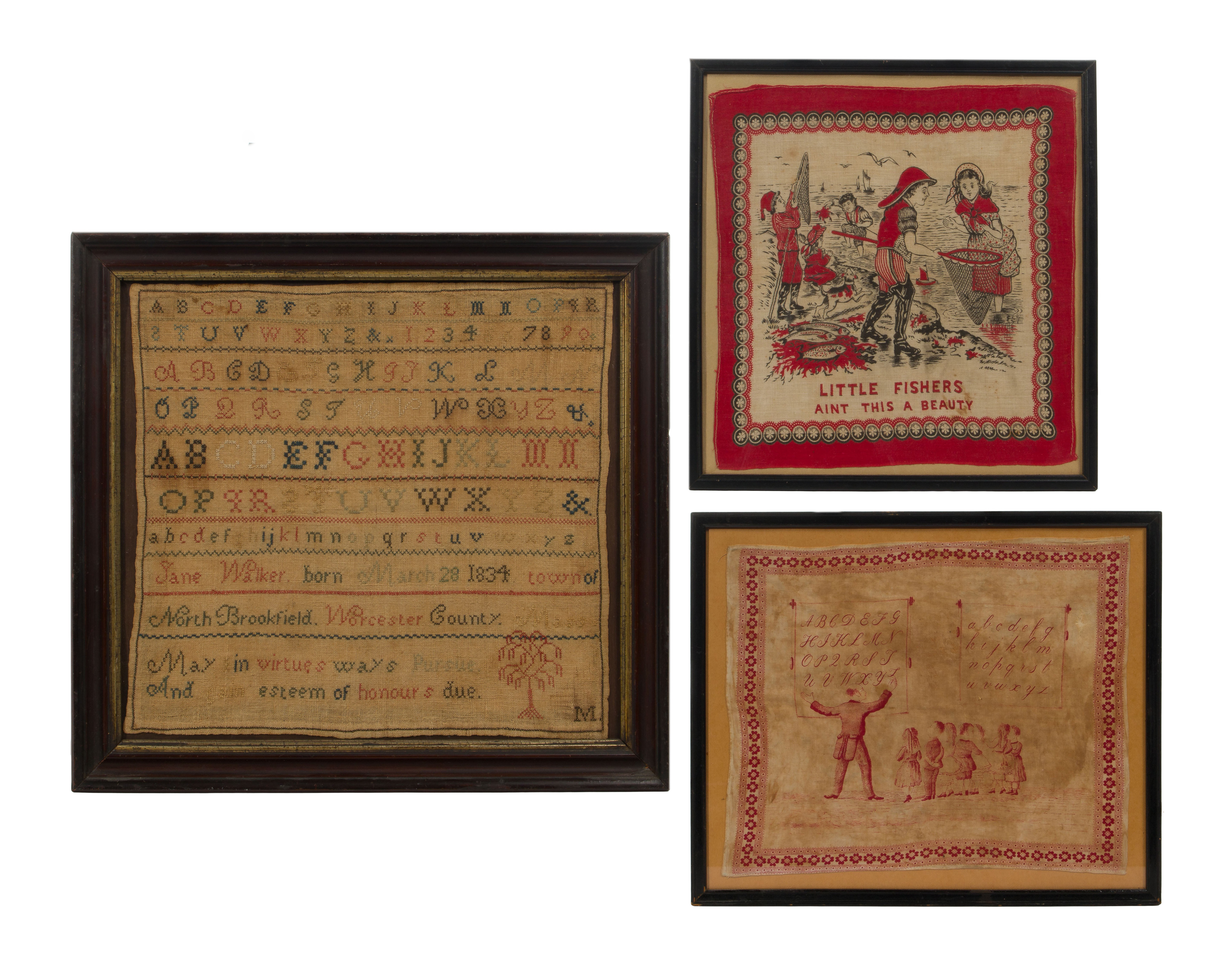 (3) total items including a c.1850, North Brookfield, Worcester County sampler; together with a Little Fishers textile and an alphabet textile with children, all framed behind glass