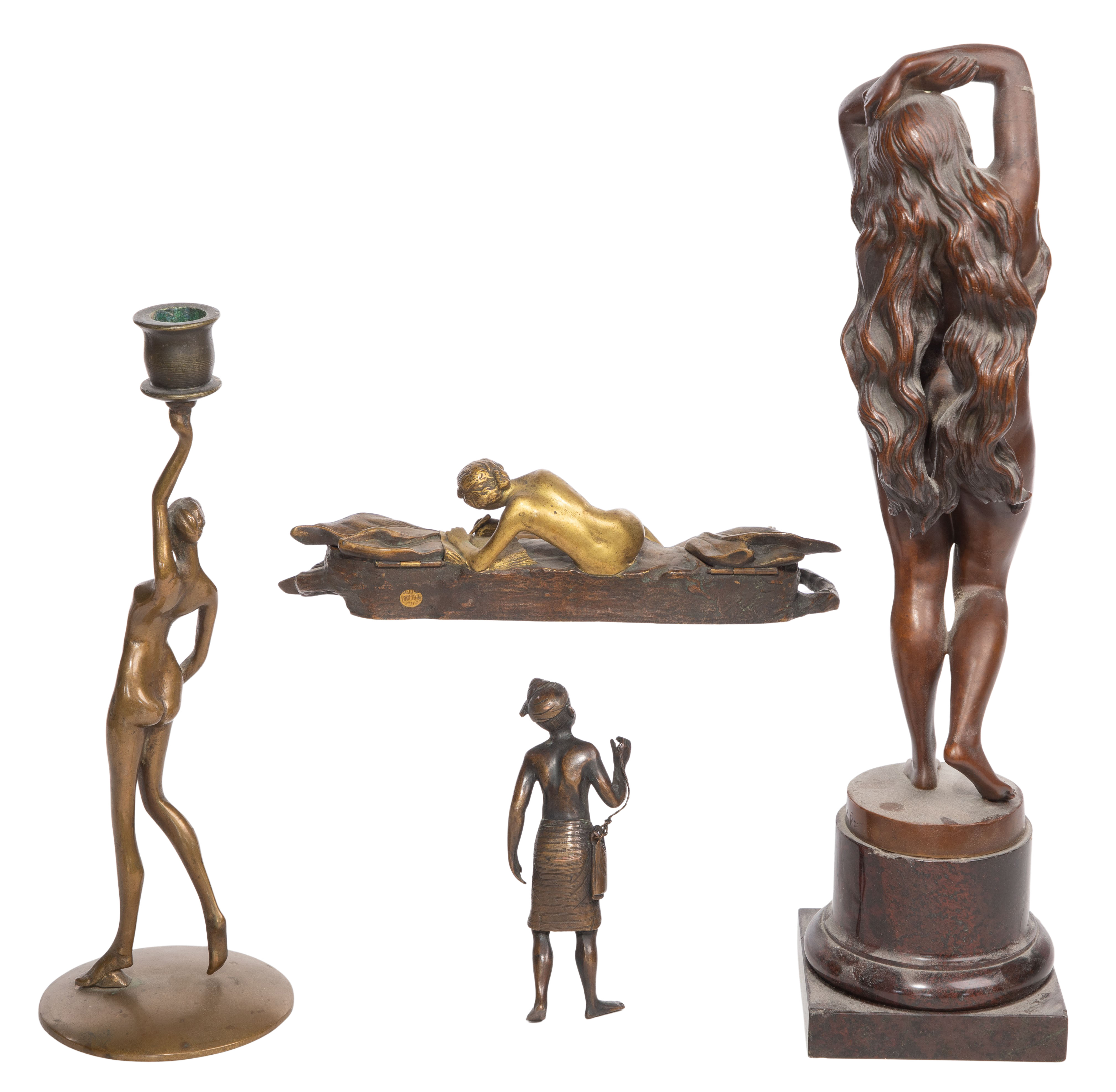 (4) items including a parcel-gilt bronze inkstand having a writing female flanked by a pair of leaf-shaped hinged lids, a larger leaf pen tray with foundry ‘Louchet’ mark, a bronze figure titled ‘EVA’ on front and signed Rudolf Schweinitz near stone base, a female Art Deco candlestick impressed signed ‘Thew’ on the underside and an unmarked tribal style bronze figurine