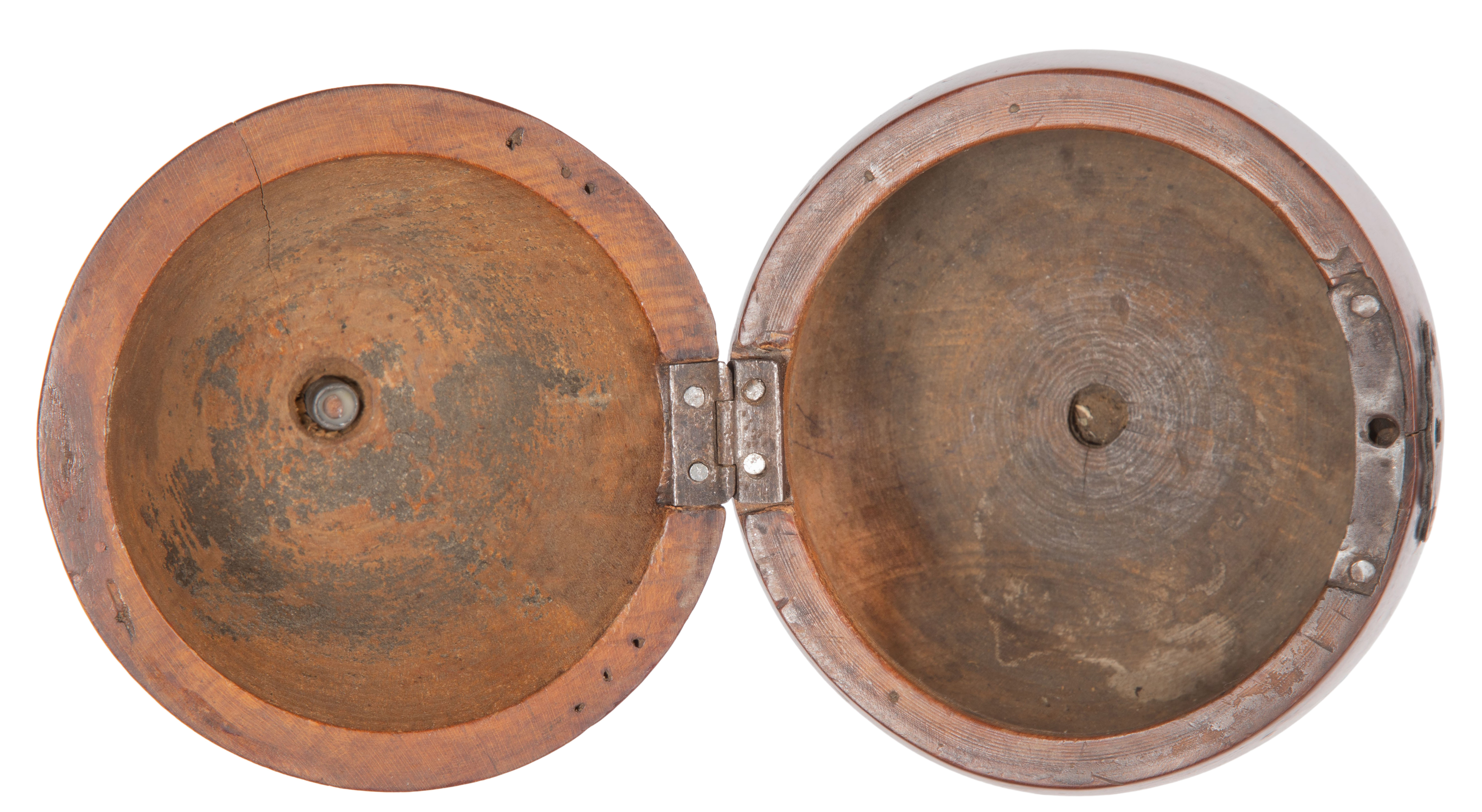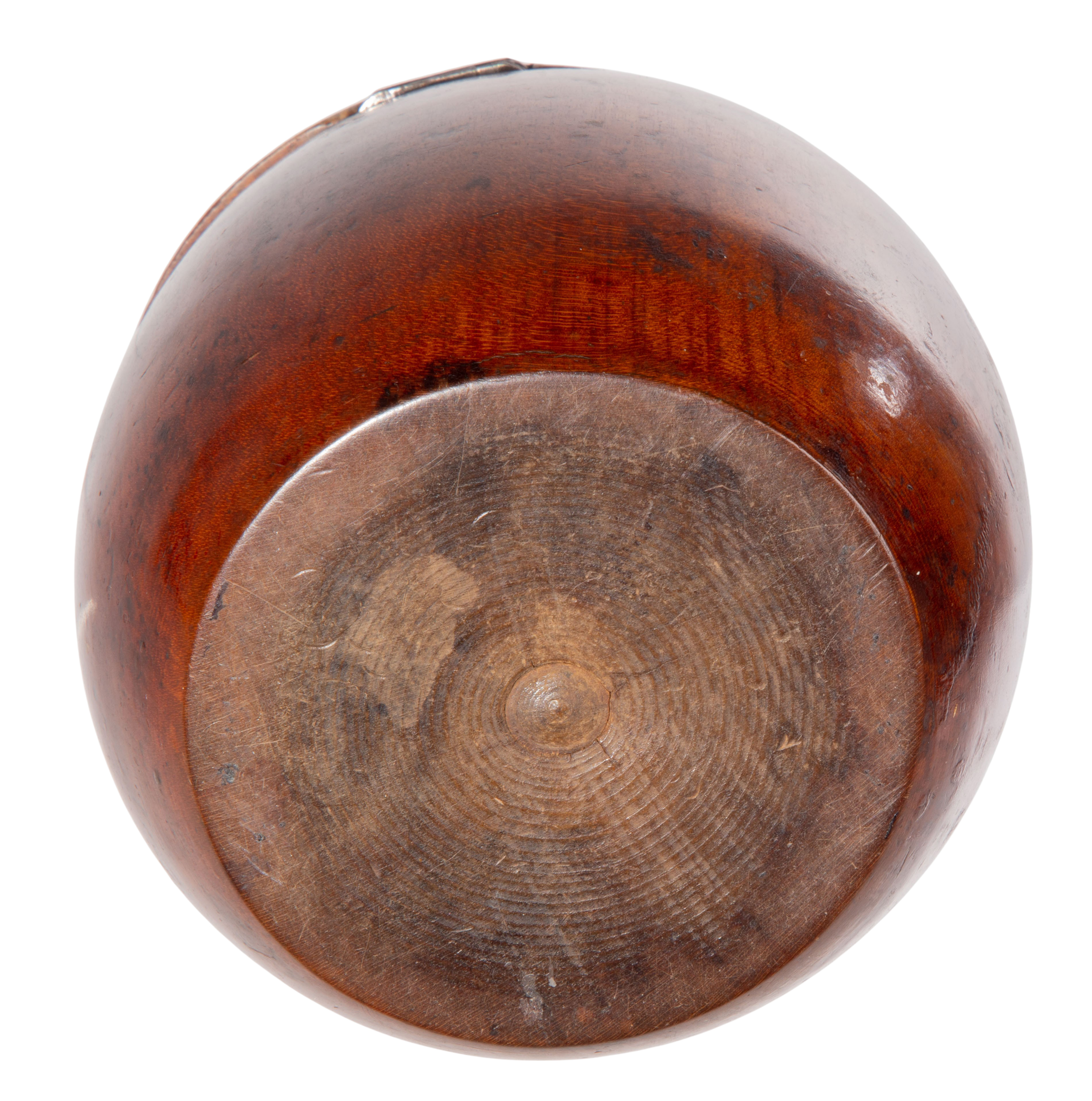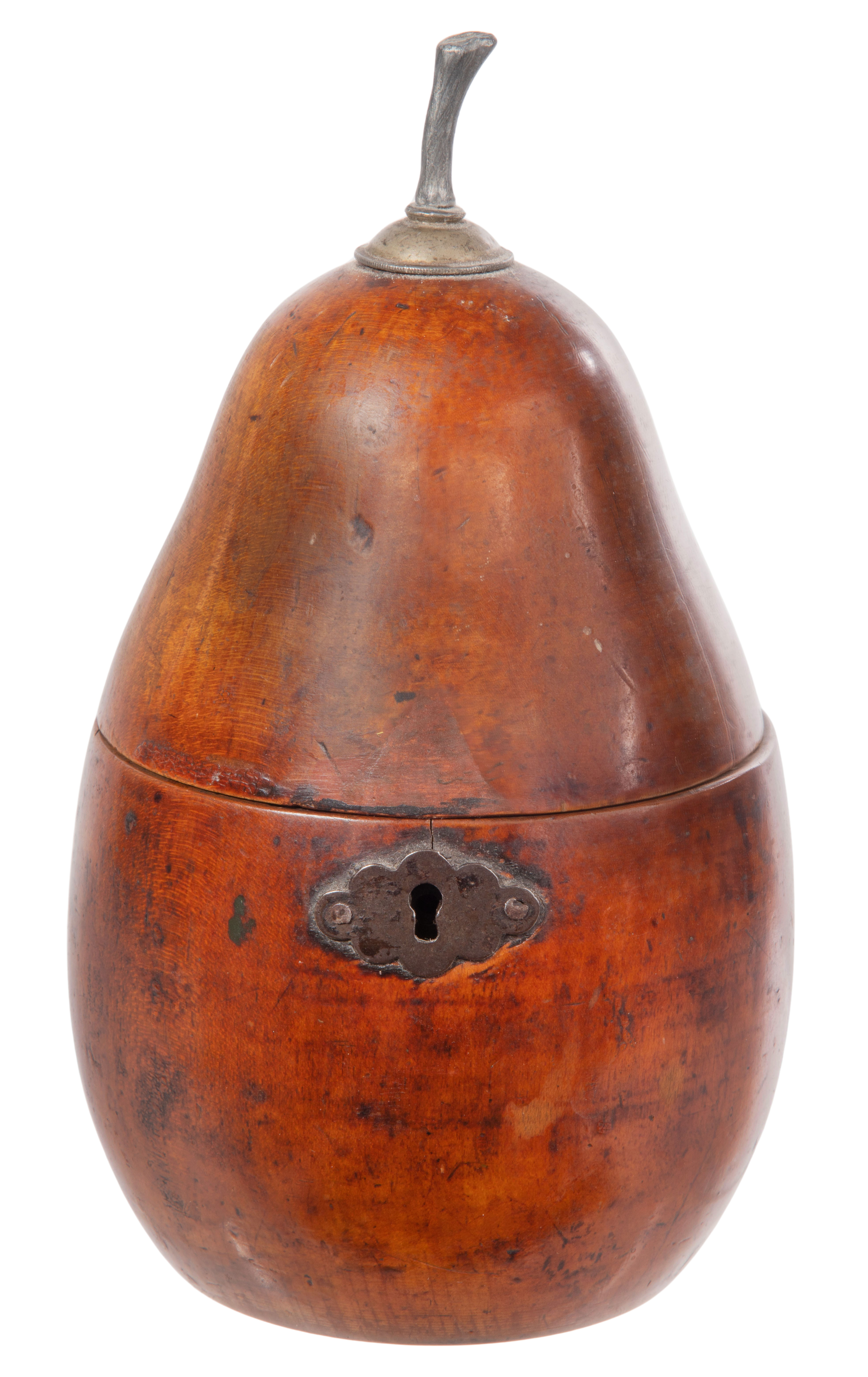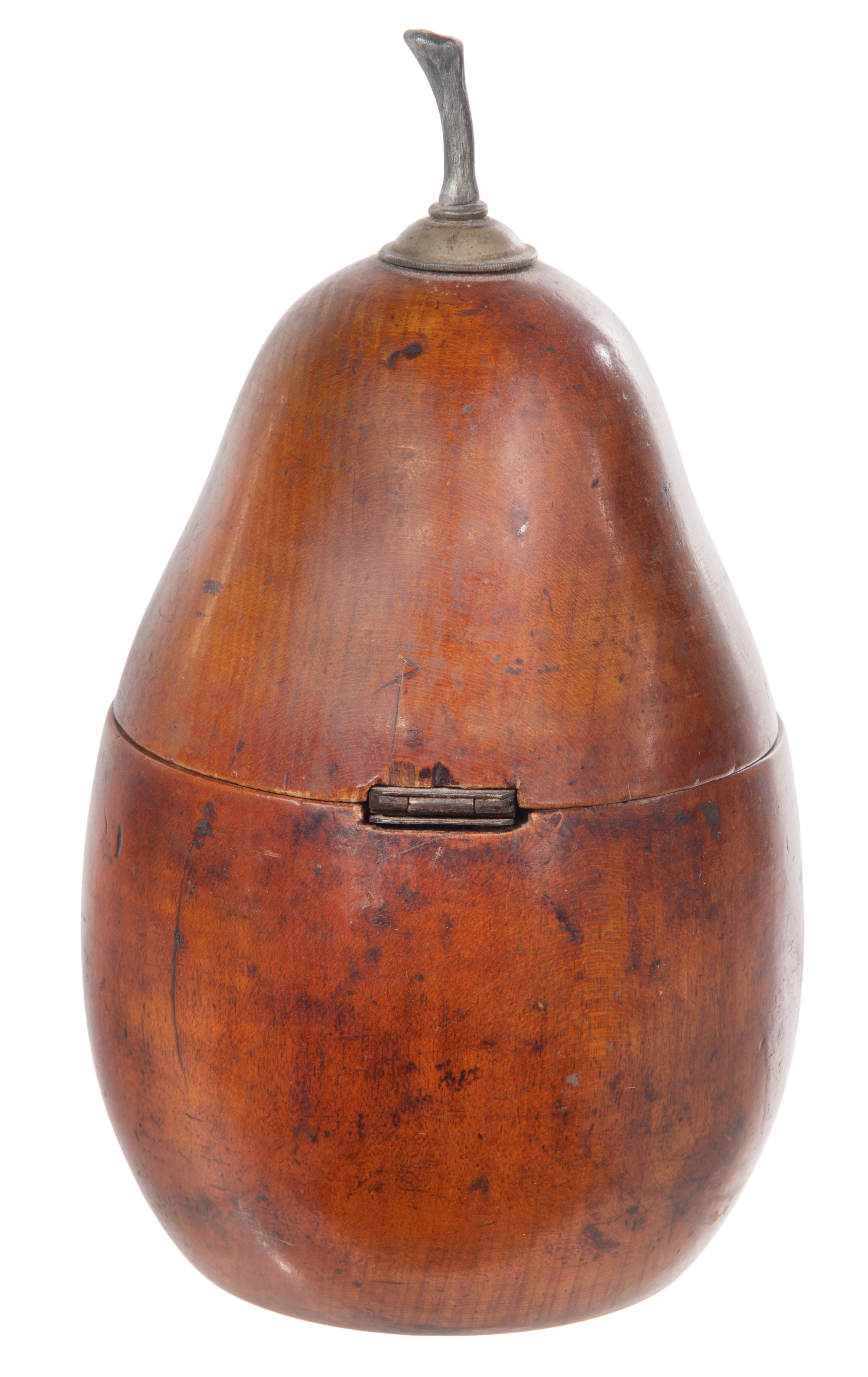 (7) items including an English fruitwood pear-shaped tea caddy, Peaseware including a hand turned sugar container, a half pint pewter tankard having an illegible hallmark and a shot glass, a round pantry box, a Gold Medal Flour recipe box and a tole painted bowl