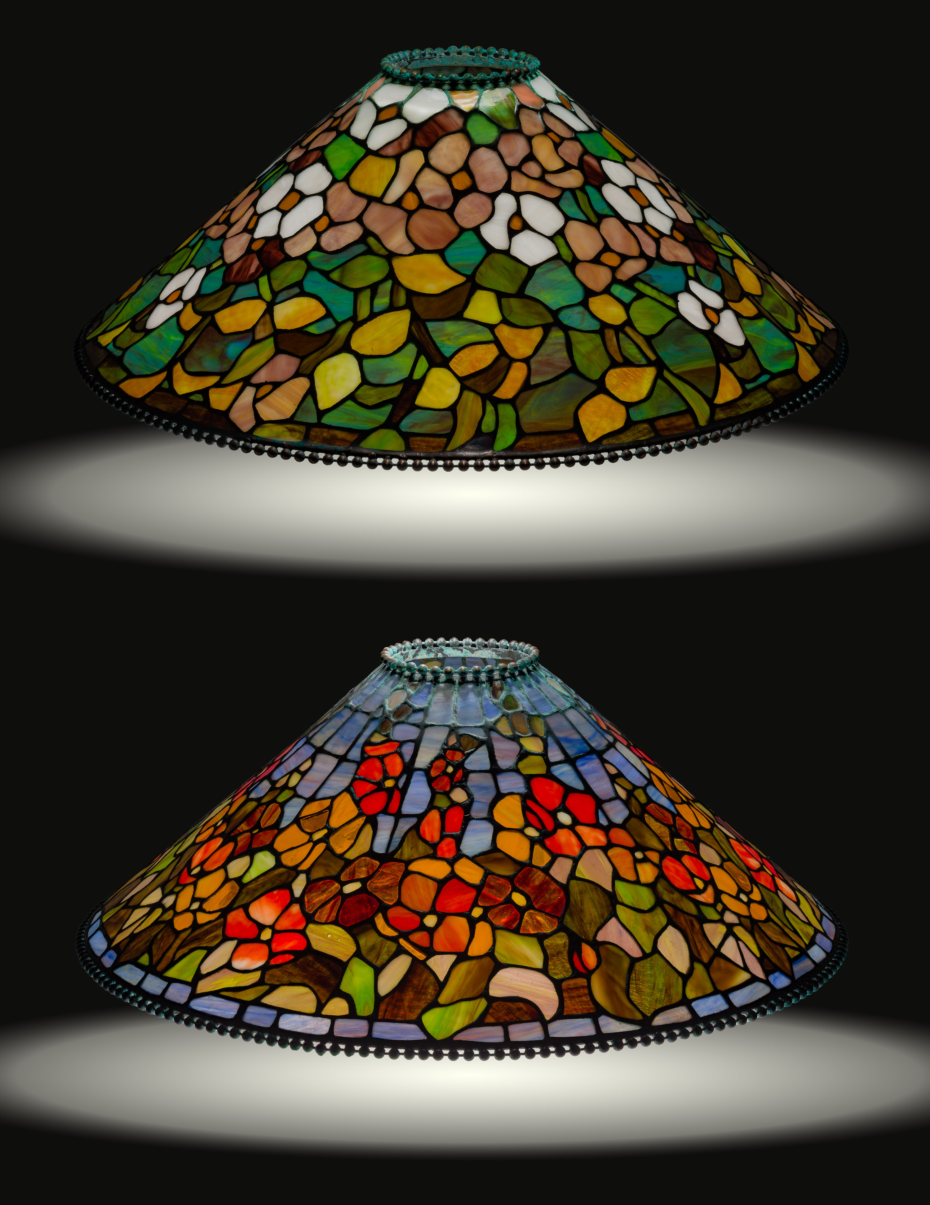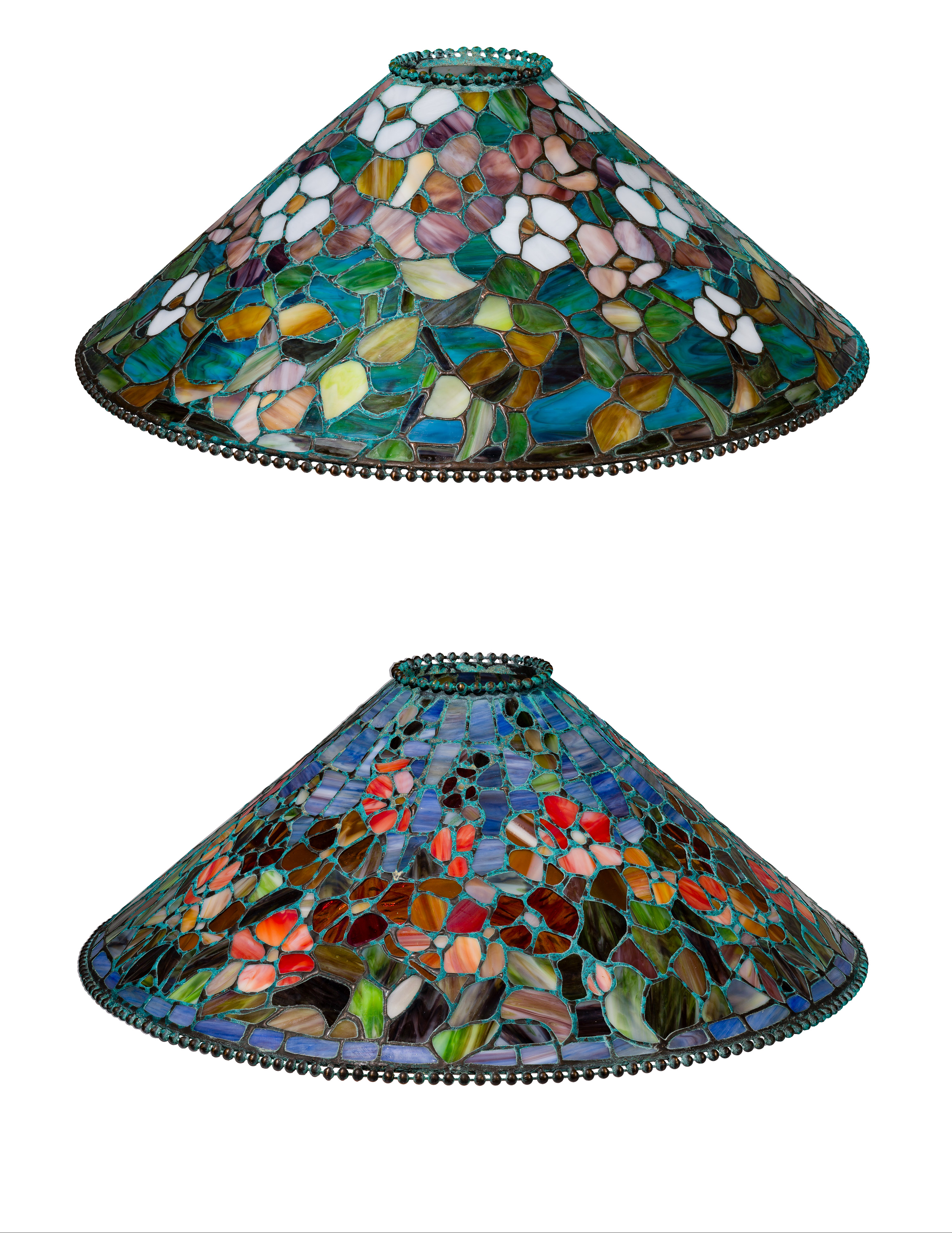 (2) items of conical shape, patinated metal rims having brass labels attached to lower rim, both marked on bottom edge