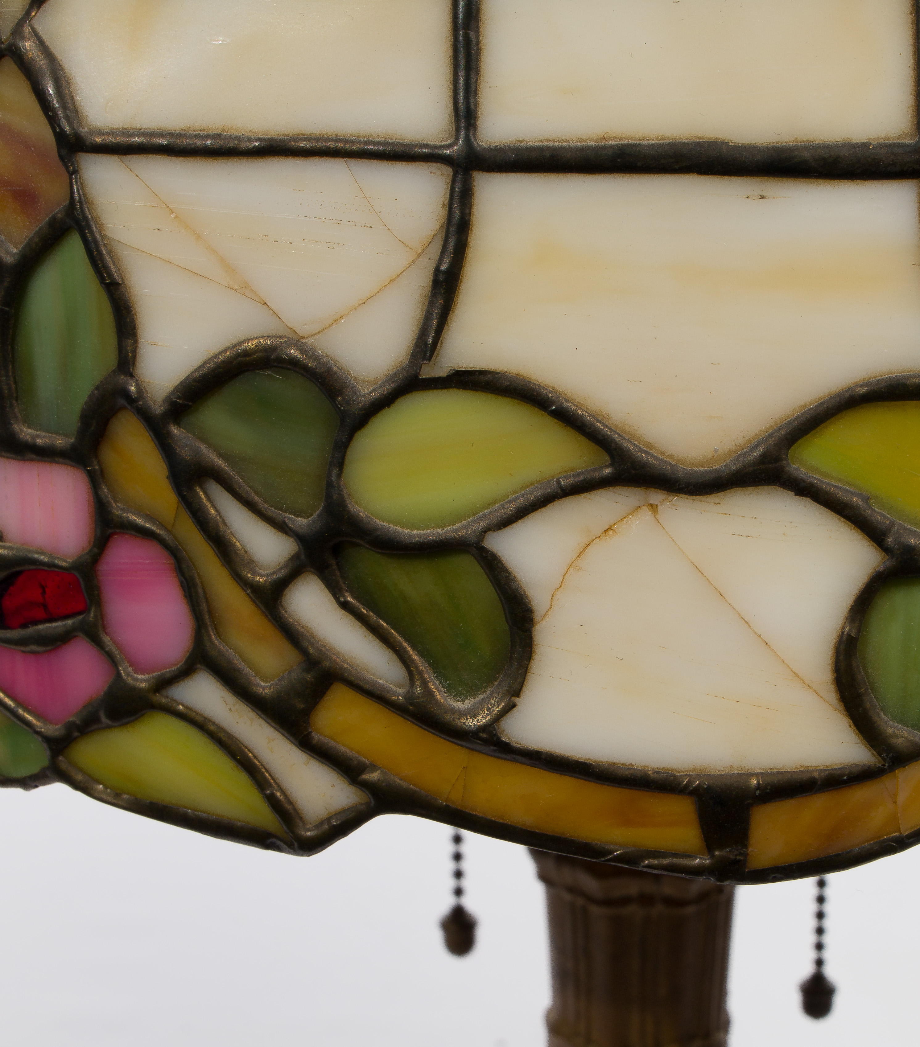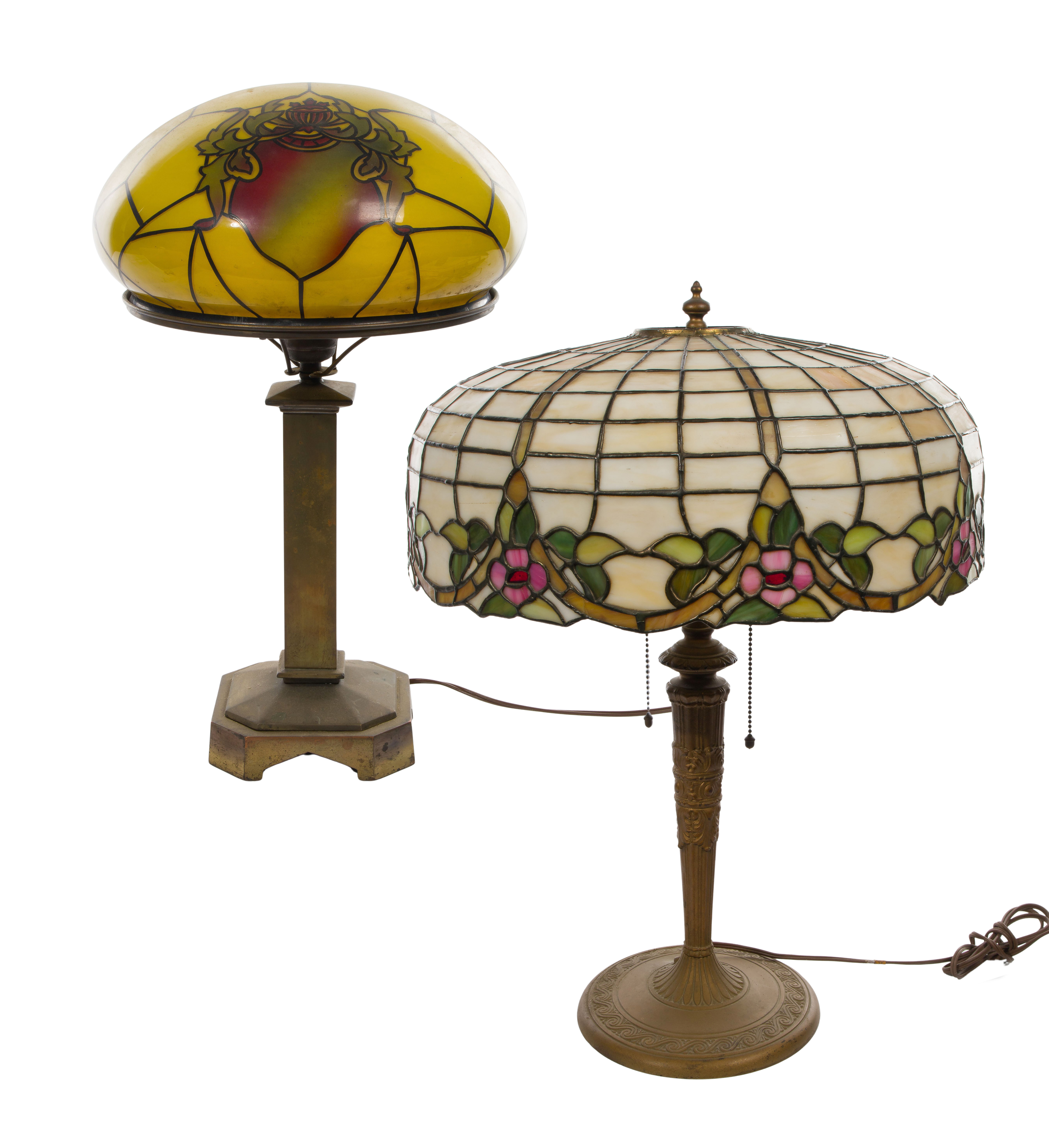 (2) total items including a green floral dome shade on a brass base; together with a cast iron gold-tone and gold-tone patina lamp base having a slag glass floral shade attributed to Lamb Brothers and Greene of Napanee, Indiana