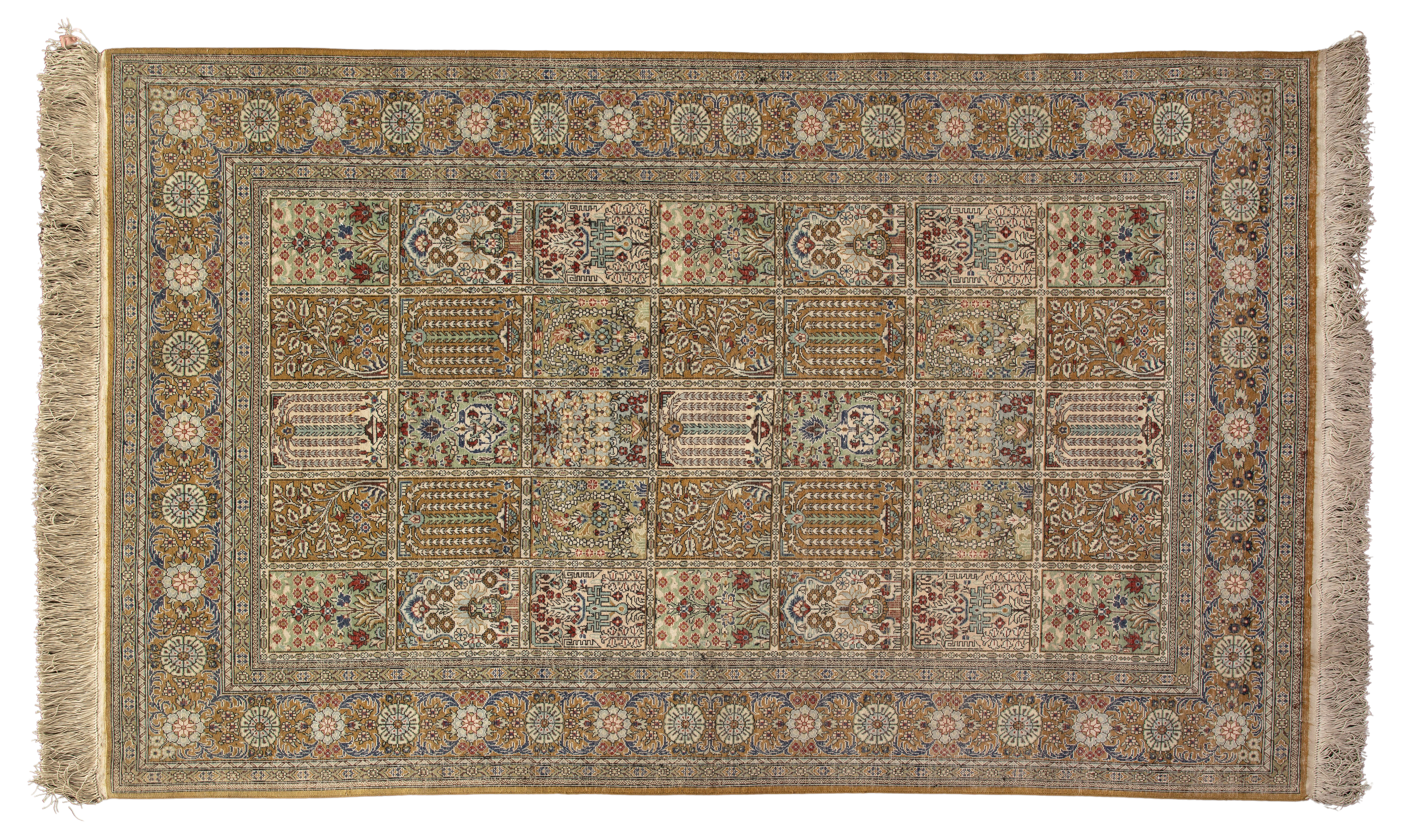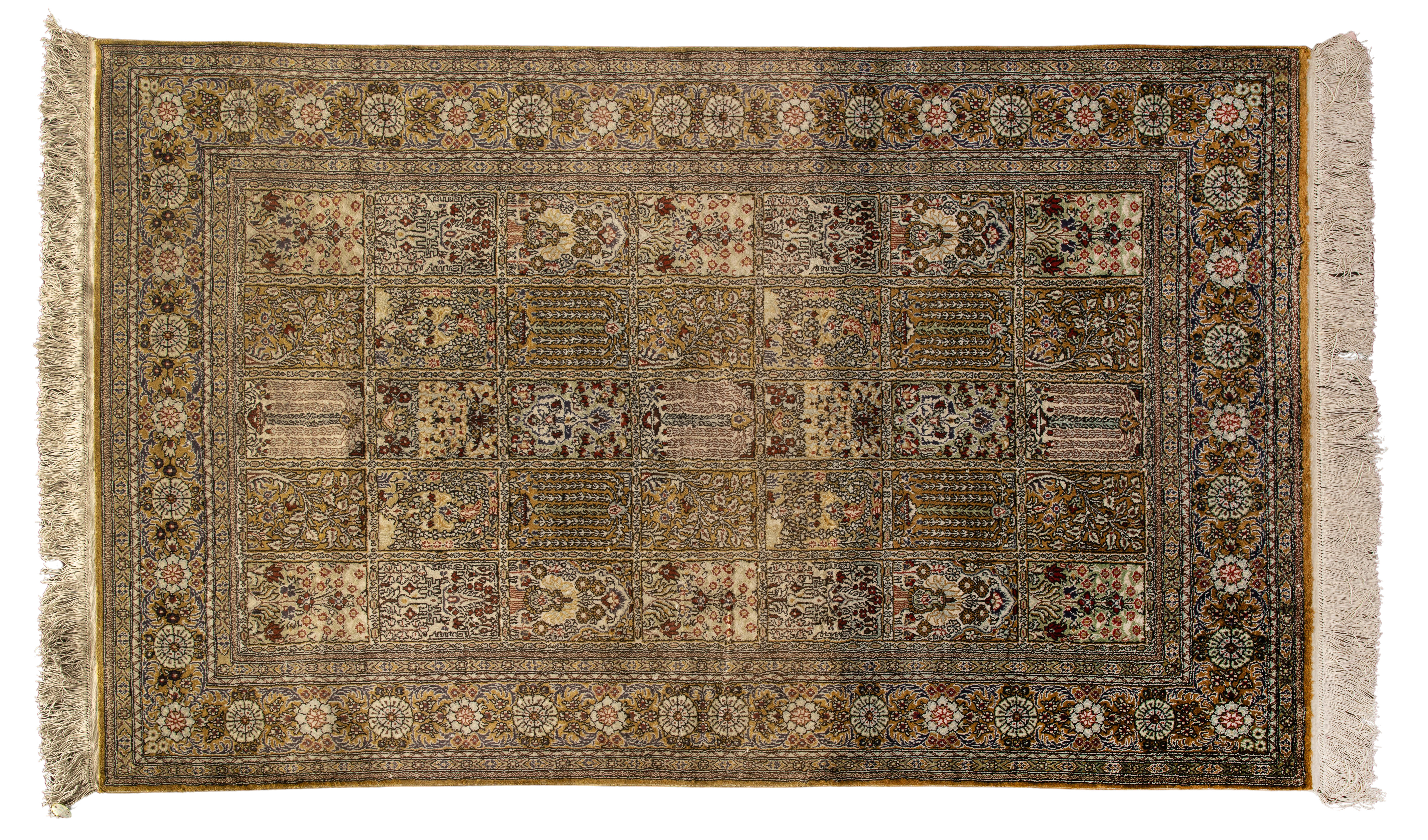 Hand knotted having a garden design in hues of green, ivory, blue, red, brown, gold, rust and mauve on a tan field, tag attached to fringe