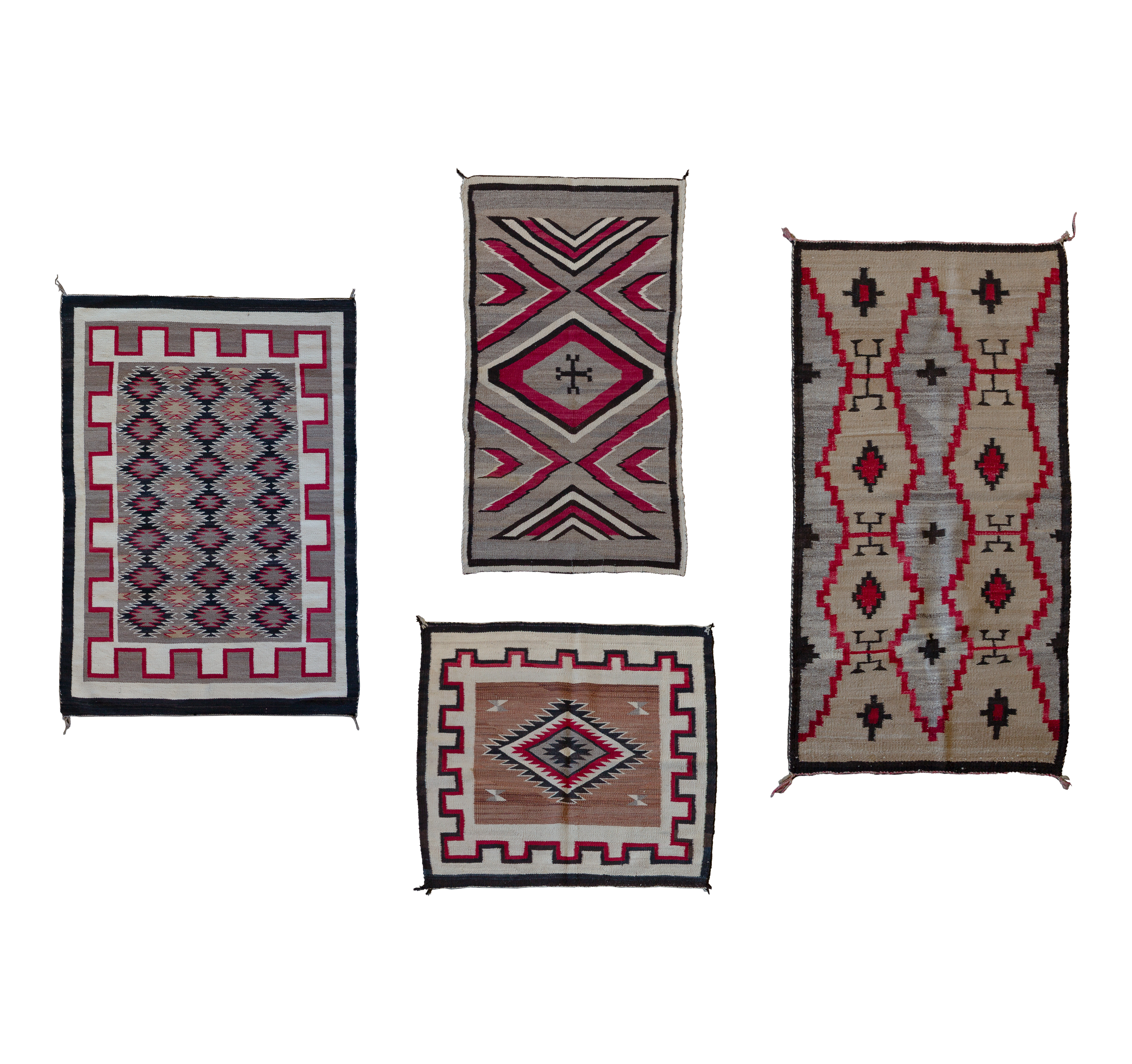 (4) items, all hand woven including an abstract geometric design in hues of red, oatmeal, cream and black, a geometric abstract in hues of cream, black and red on a gray field (4 ft. 3 in, x 3 ft.), an abstract geometric in hues of gray, black and cream on a brown field (3 ft. x 2 ft. 8 in.) and an eye dazzler in hues of cream, black and red on an oatmeal field (3 ft. 10 in. x 3 ft. 4 in.)