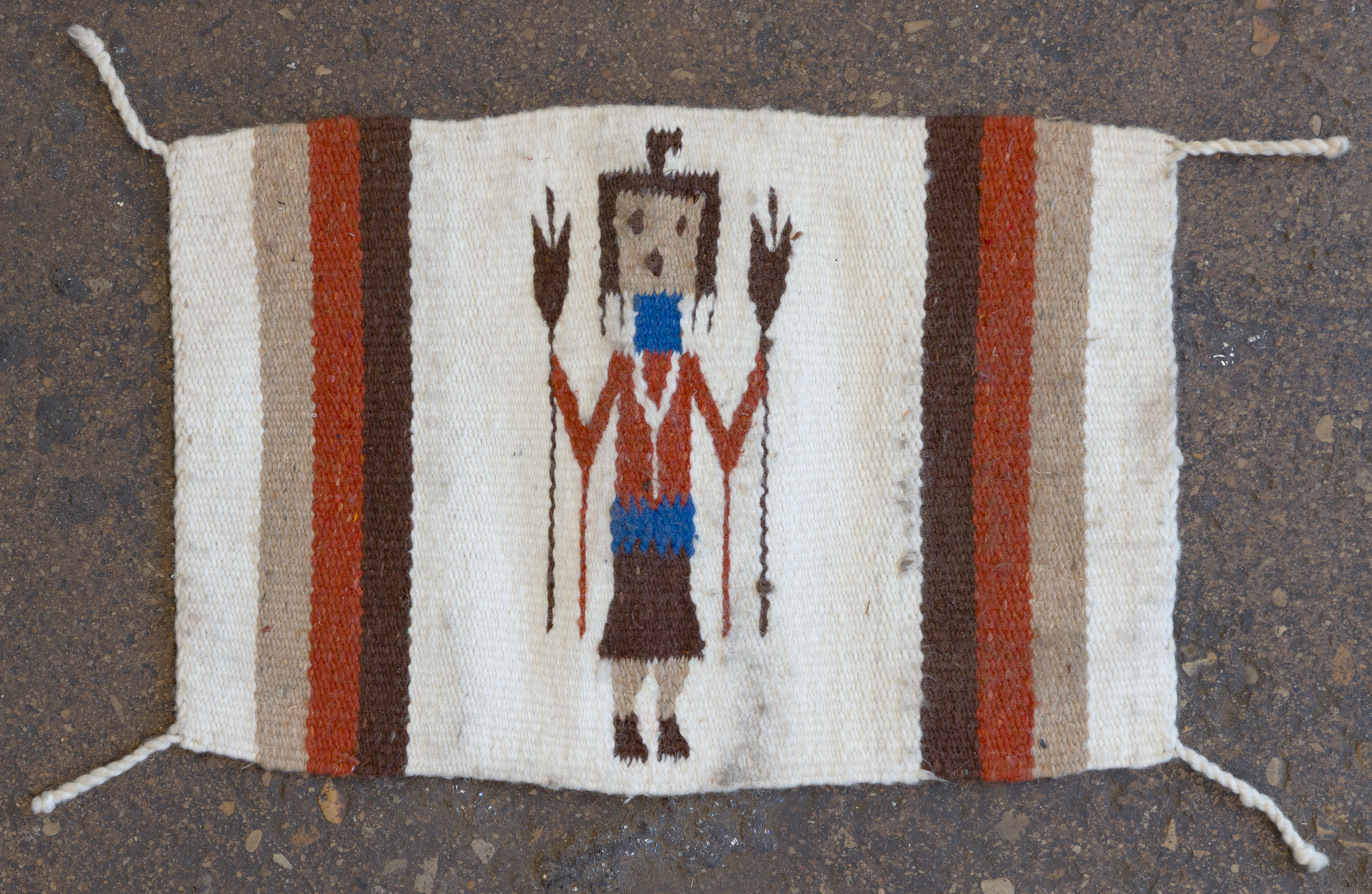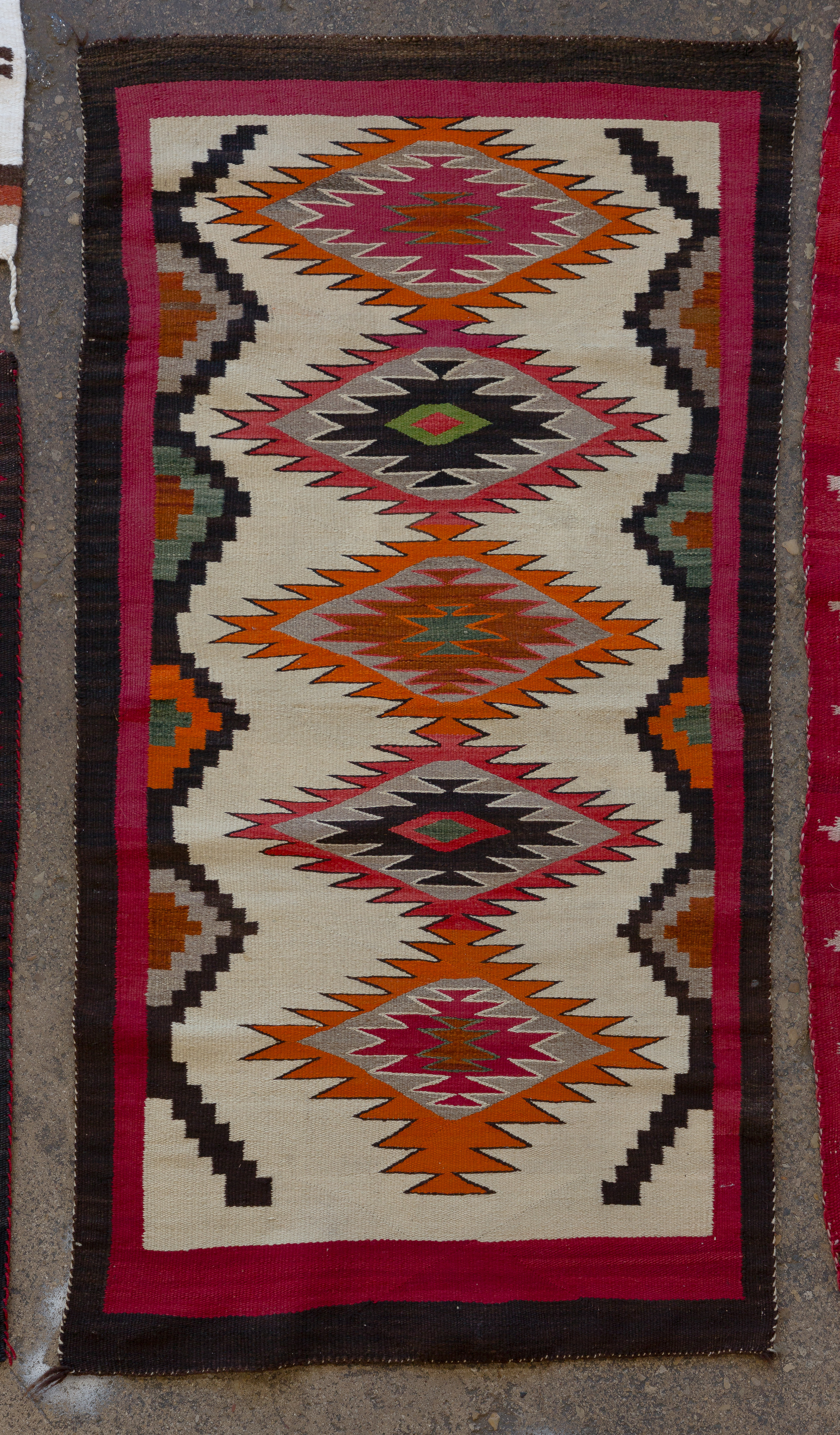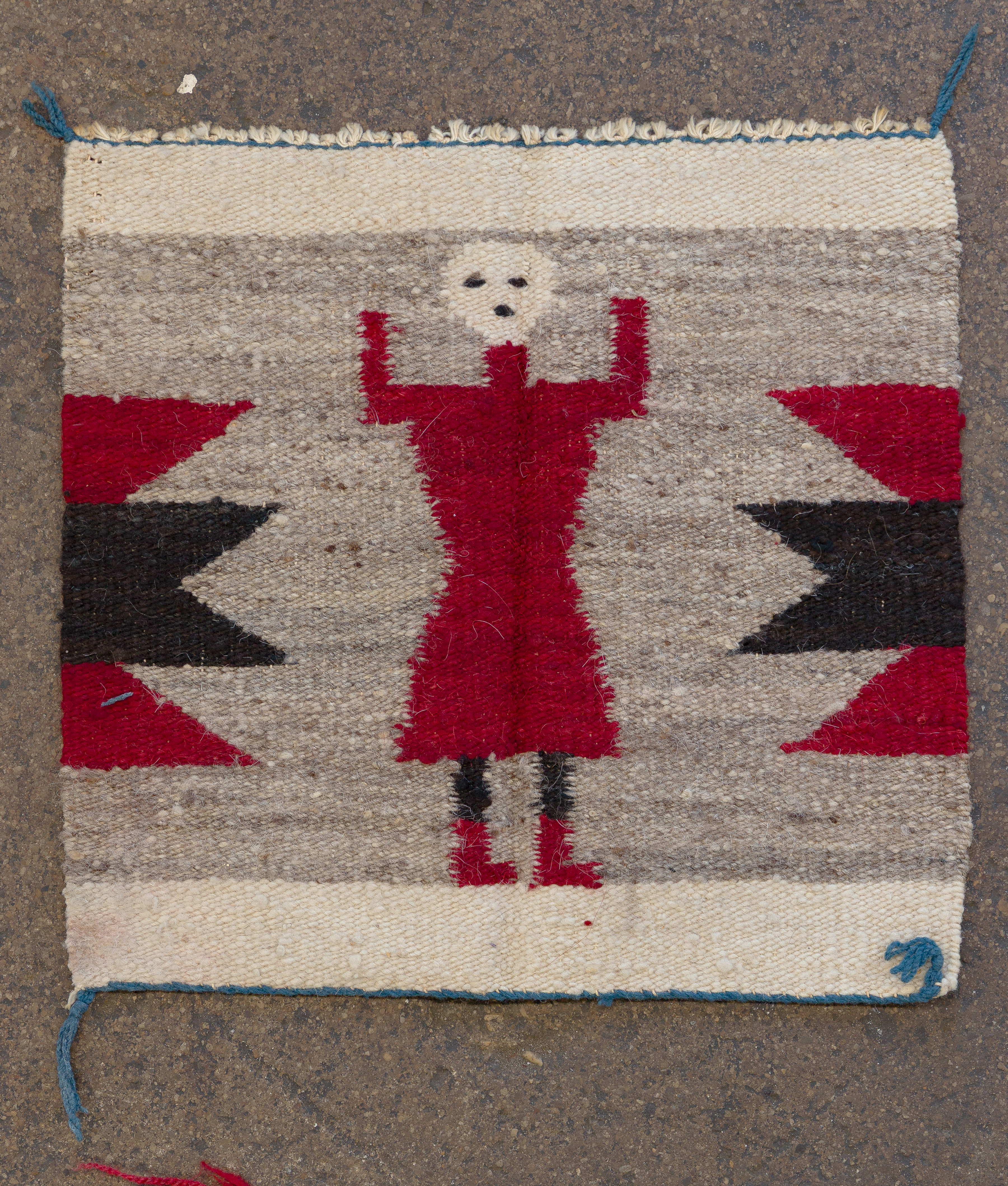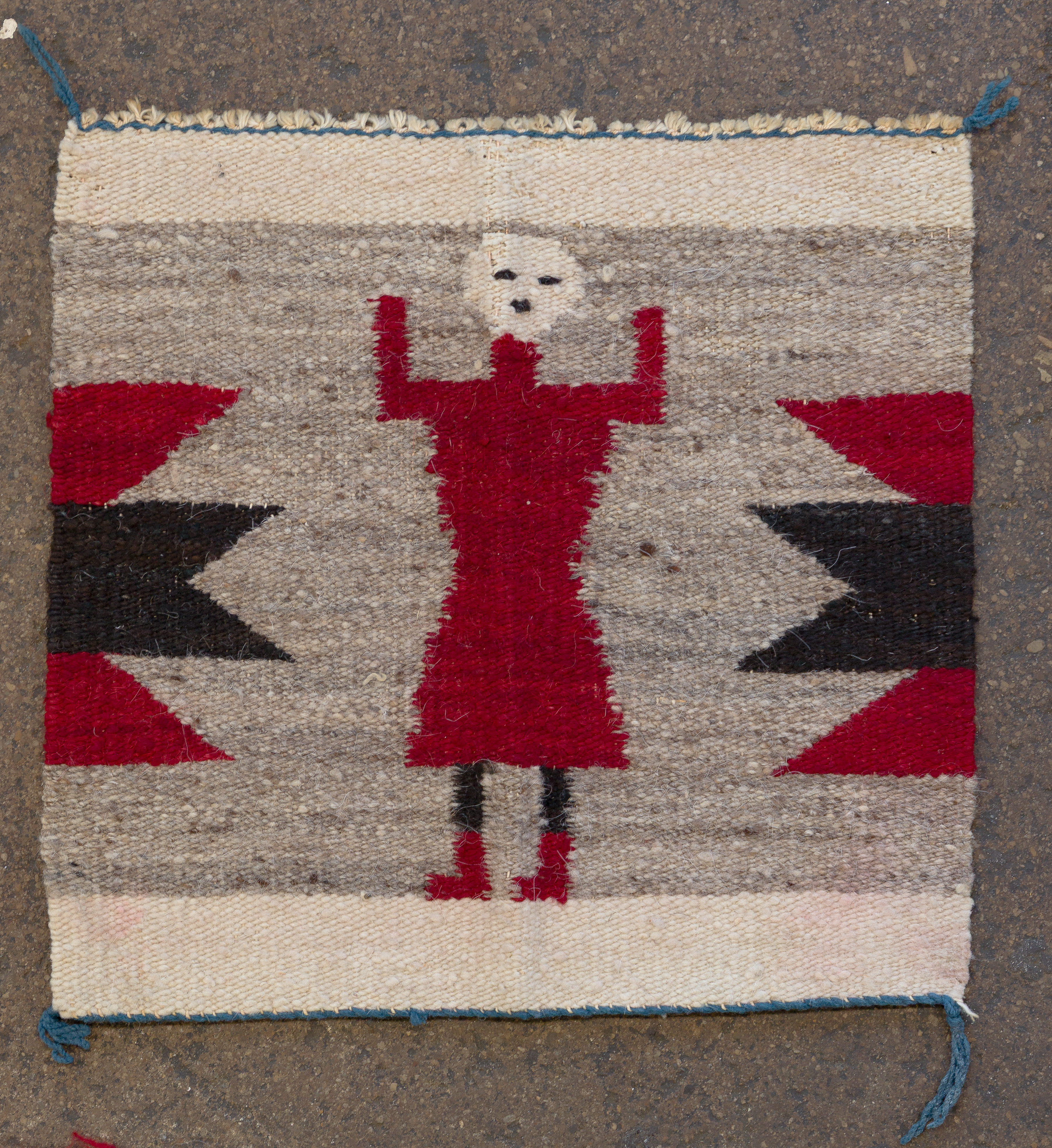 (5) total items with Eye Dazzler style hand woven Navajo rugs including a geometric design in hues of red, black and mustard, on a grey / taupe field, an abstract geometric in hues of black and red on a grey / taupe field (3 ft. 11 in. x 2 ft. 6.25 in) and an abstract geometric in hues of green, grey, orange, red and black on a cream field (5 ft. 3 in. x 3 ft. 3 in.), all having spirit lines; together with (2) Yei wall hangings including corn god (1 ft. 6 in. x 1 ft.) and lady Yei ( 1 ft. x 3 in. x 1 ft. 4 in.)