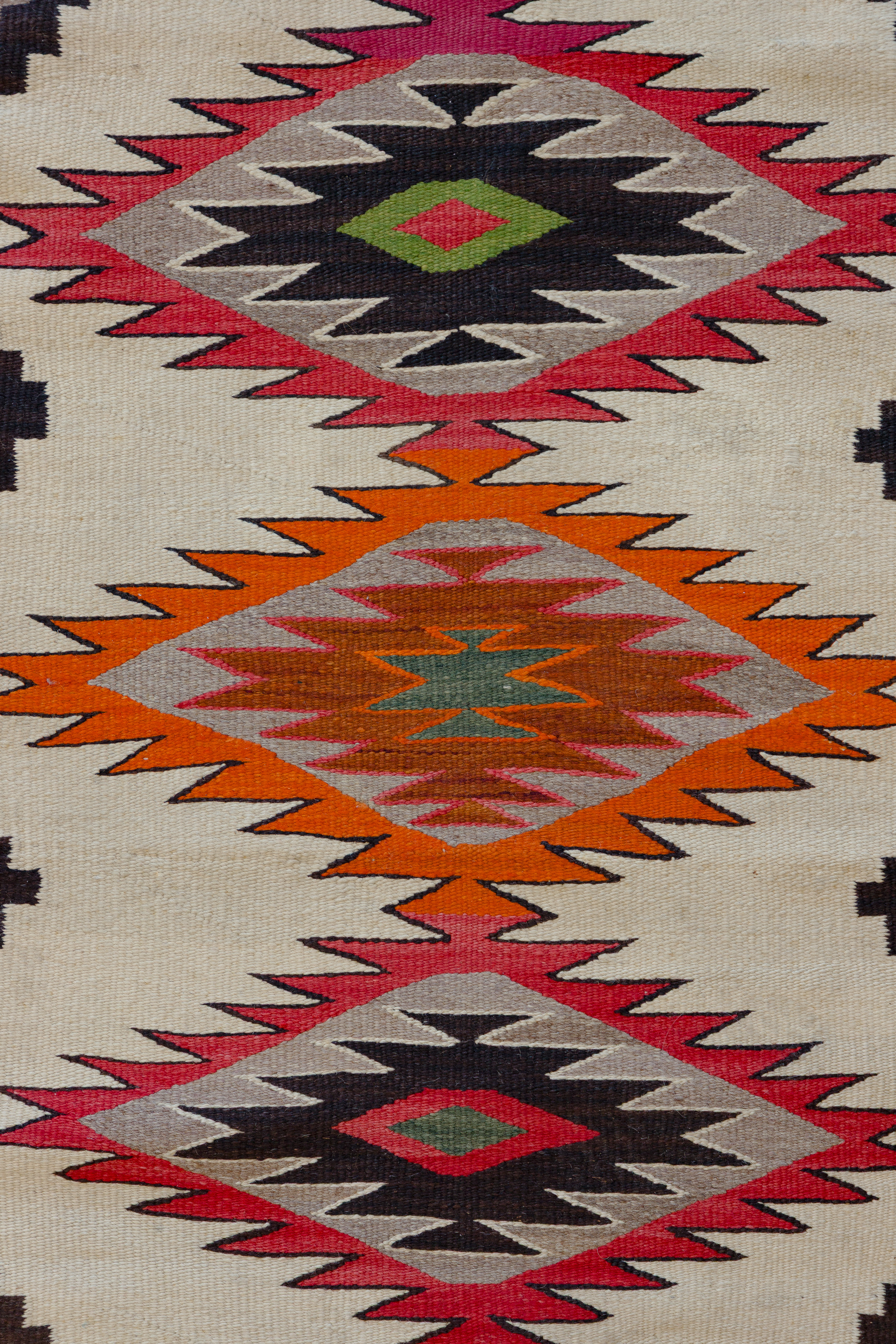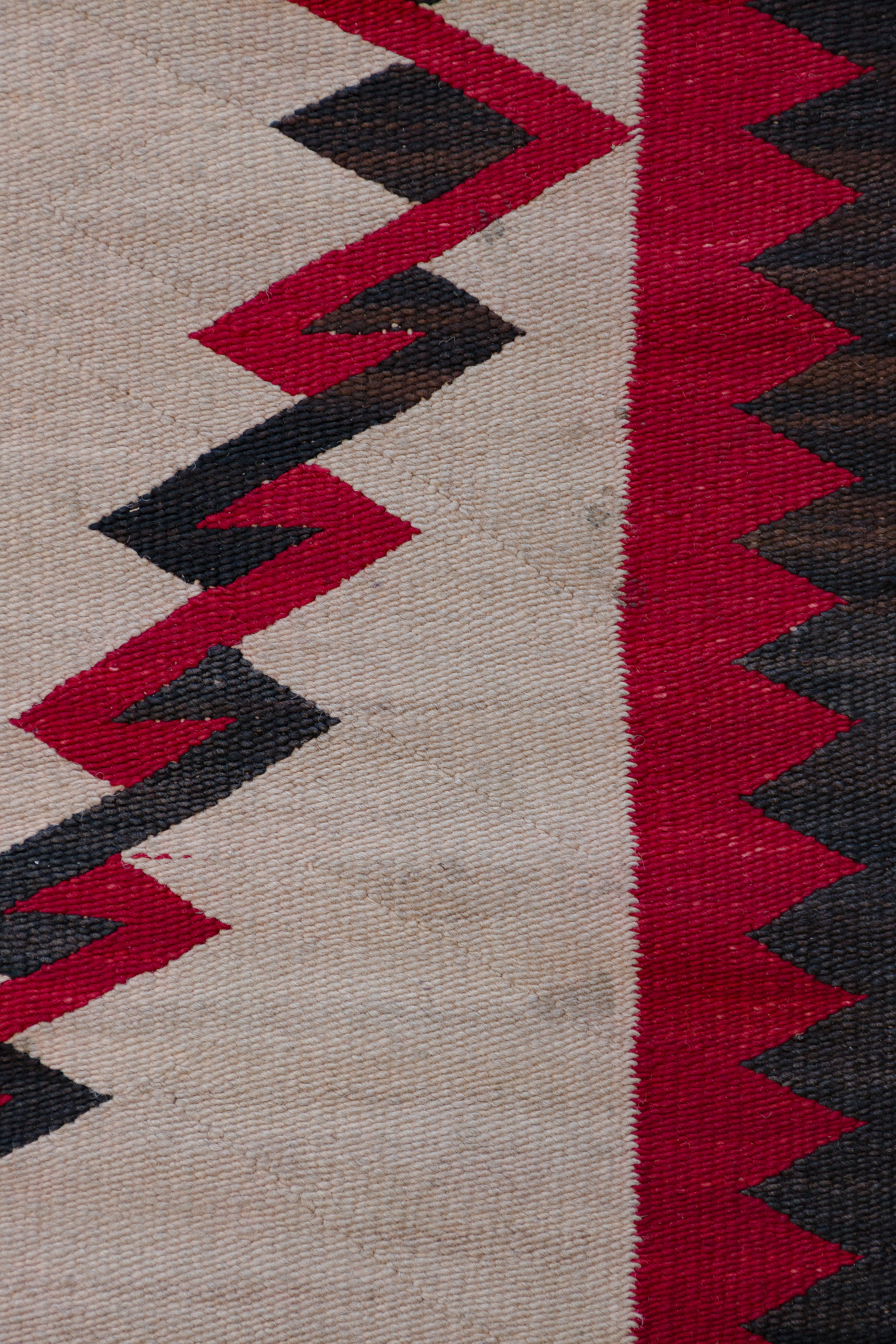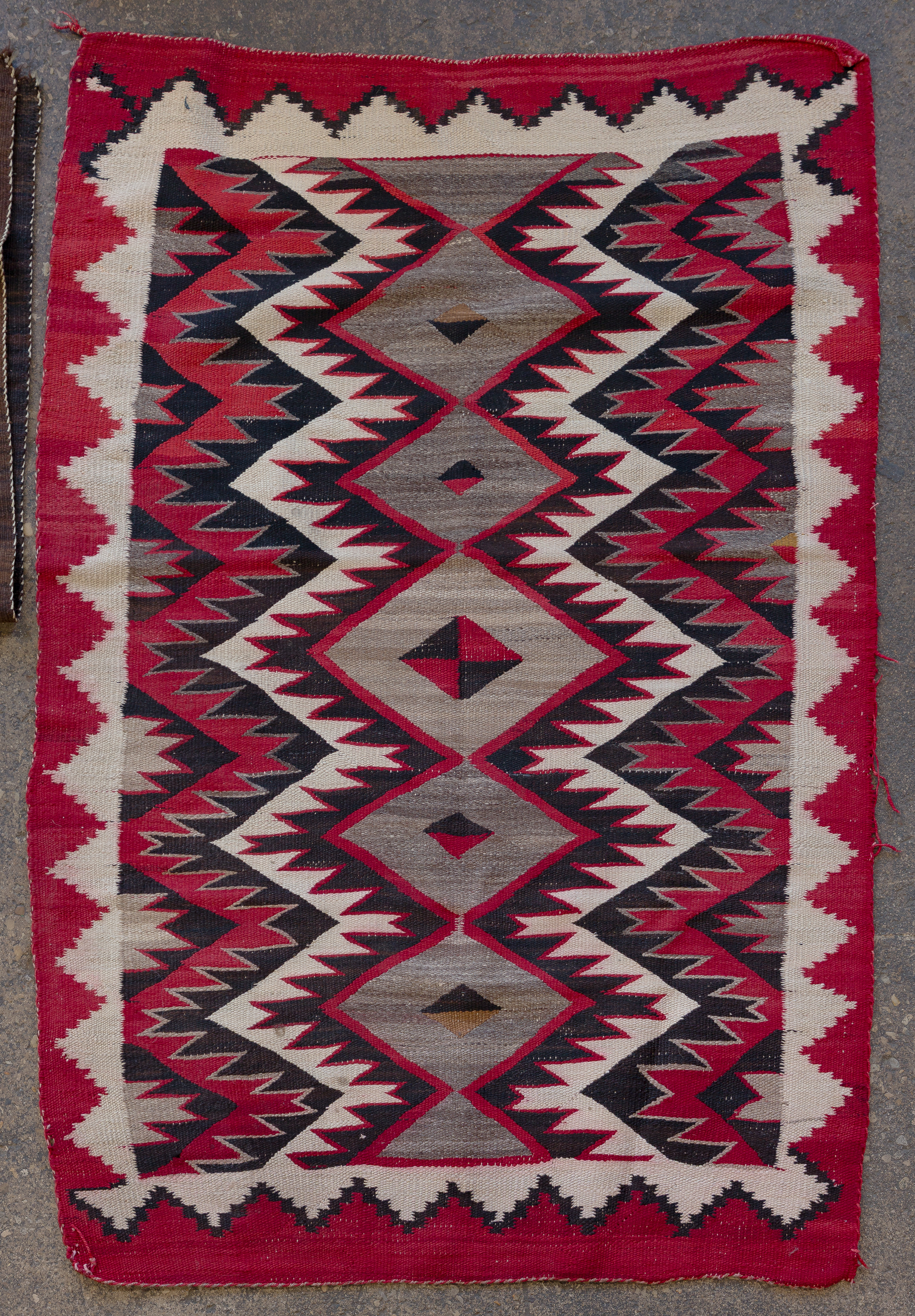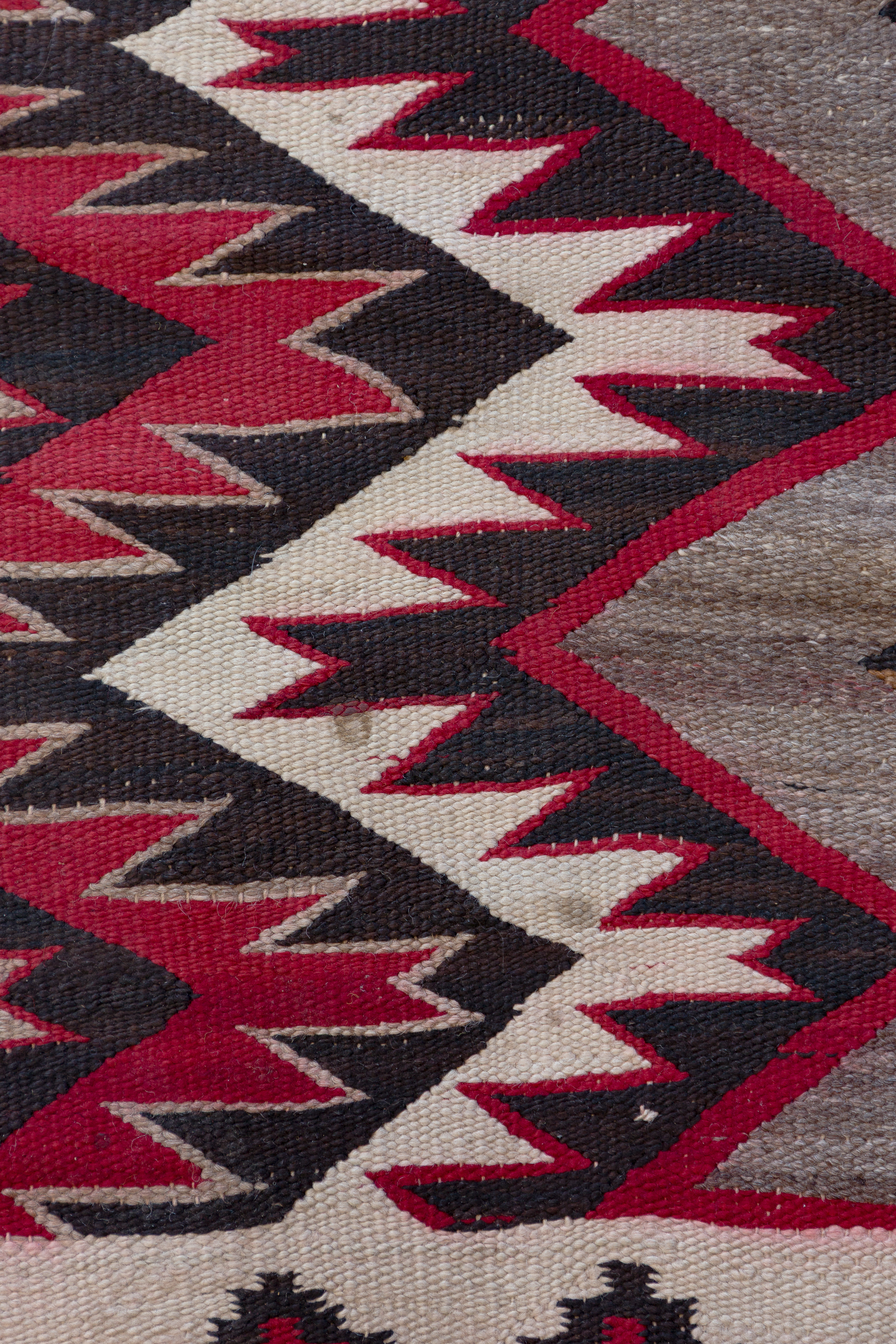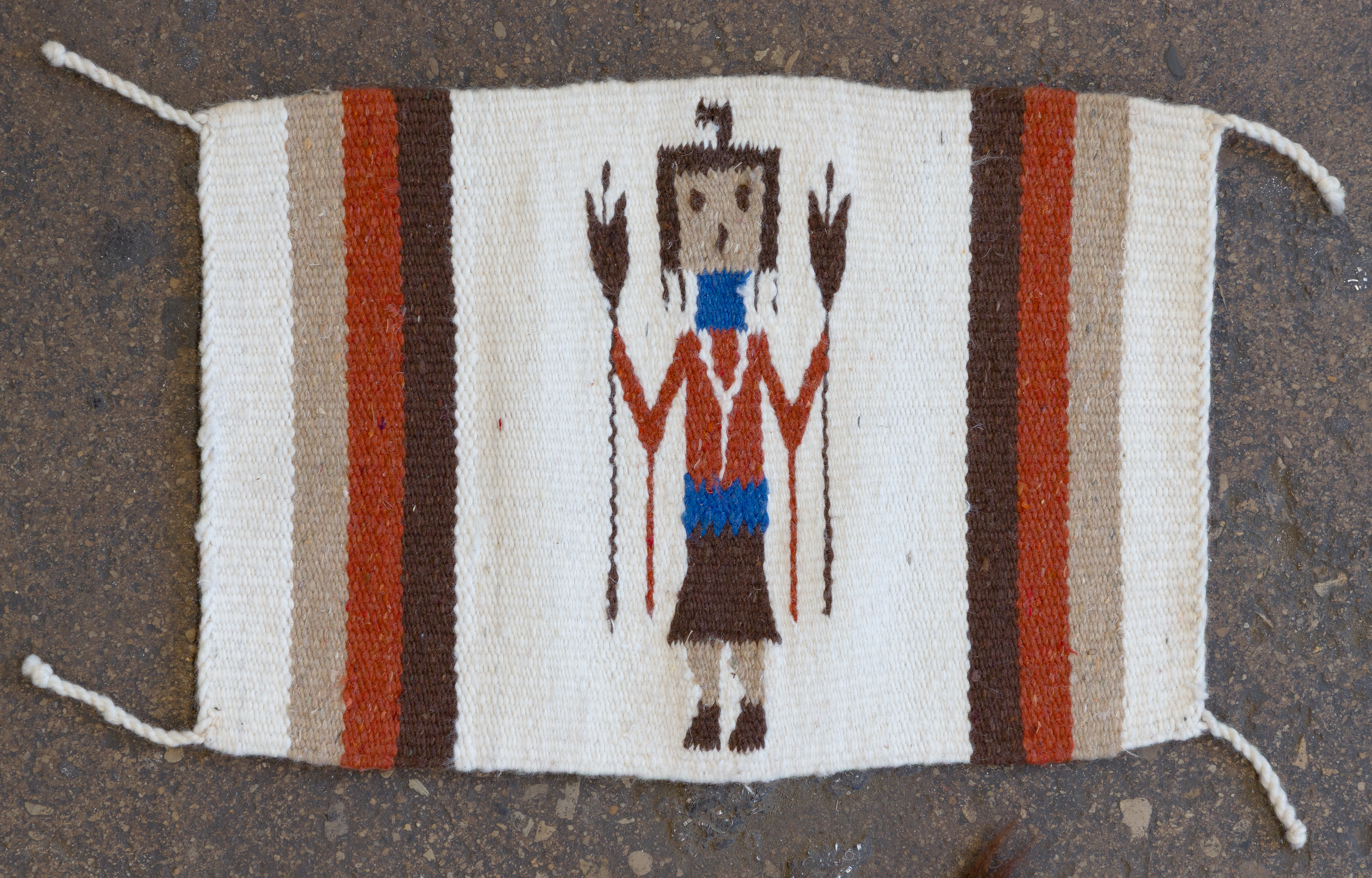 (5) total items with Eye Dazzler style hand woven Navajo rugs including a geometric design in hues of red, black and mustard, on a grey / taupe field, an abstract geometric in hues of black and red on a grey / taupe field (3 ft. 11 in. x 2 ft. 6.25 in) and an abstract geometric in hues of green, grey, orange, red and black on a cream field (5 ft. 3 in. x 3 ft. 3 in.), all having spirit lines; together with (2) Yei wall hangings including corn god (1 ft. 6 in. x 1 ft.) and lady Yei ( 1 ft. x 3 in. x 1 ft. 4 in.)