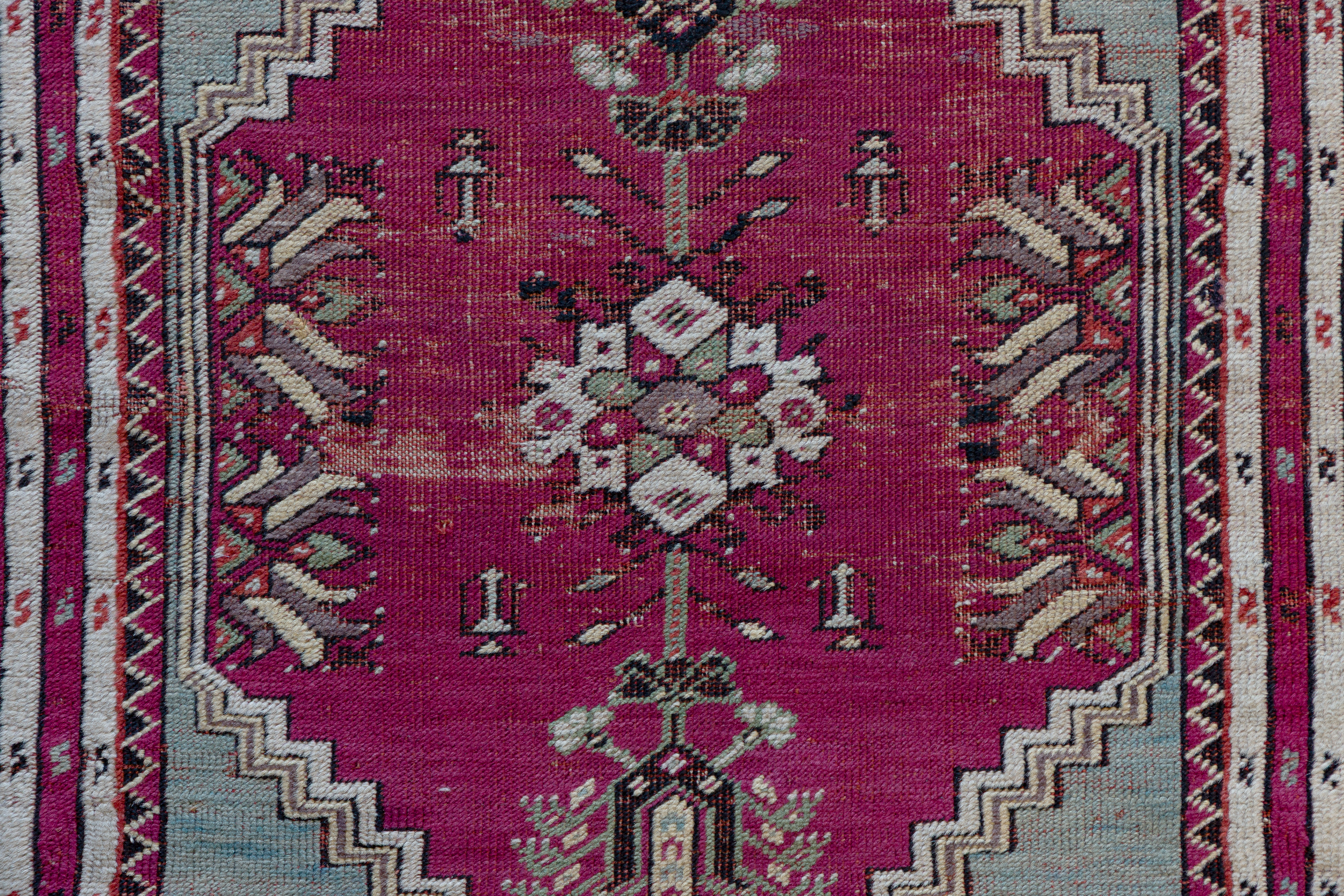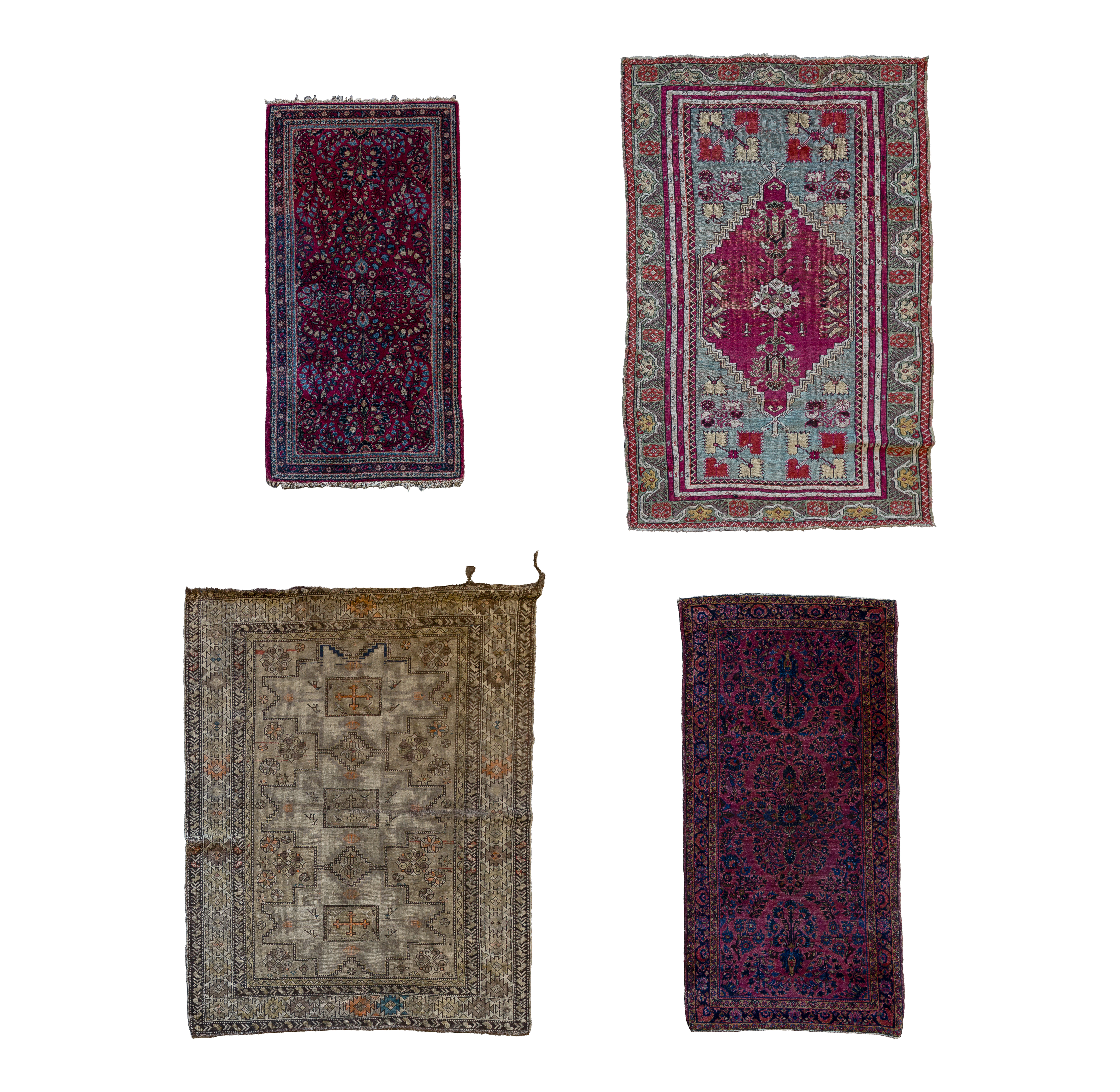 (4) items, Kazak style kilim rugs including a muted tone abstract floral design in hues of green, red, cream, black and blue on a purple field and an abstract geometric in hues of black blue, orange and taupe on a tan field (4 ft. 11.5 in. x 3 ft. 10.5 in.) as well as Sarouk style including an abstract floral in hues of blue, pink, brown and tan on a purple field (4 ft. 11 in. x 2 ft. 6 in.) and an abstract floral in hues of blue, cream and teal on a wine field (4 ft. 2 in. x 2 ft 2.5 in.)