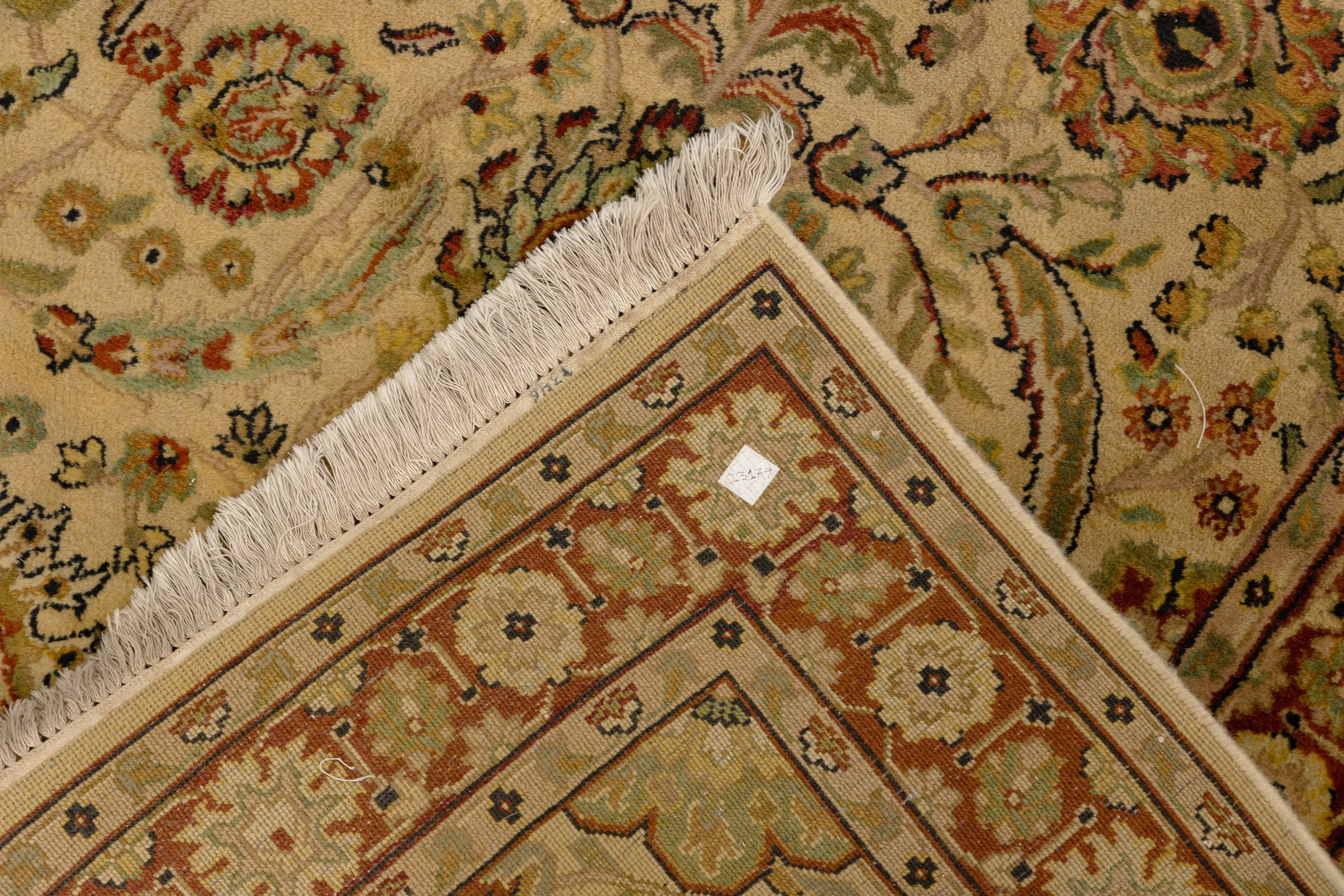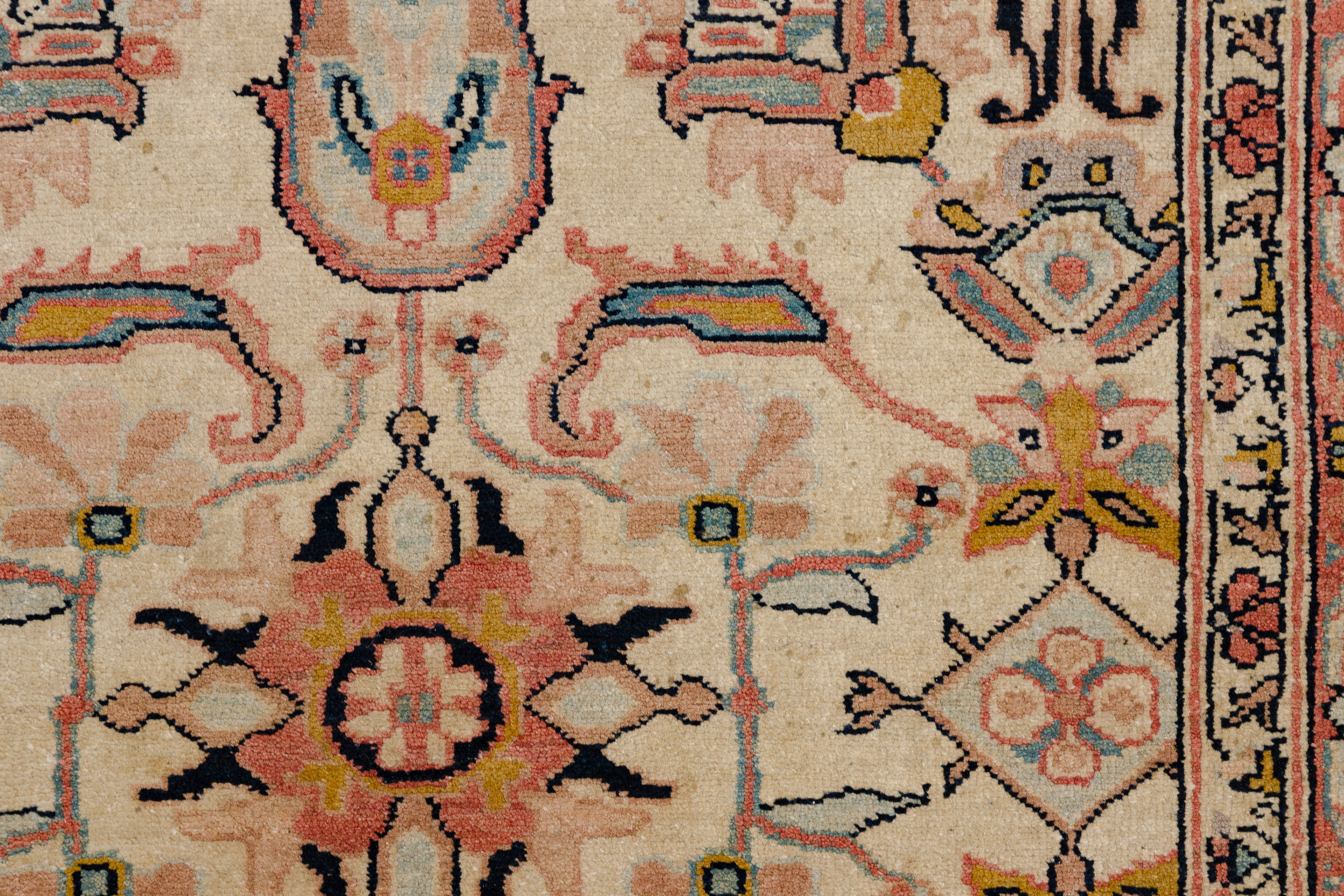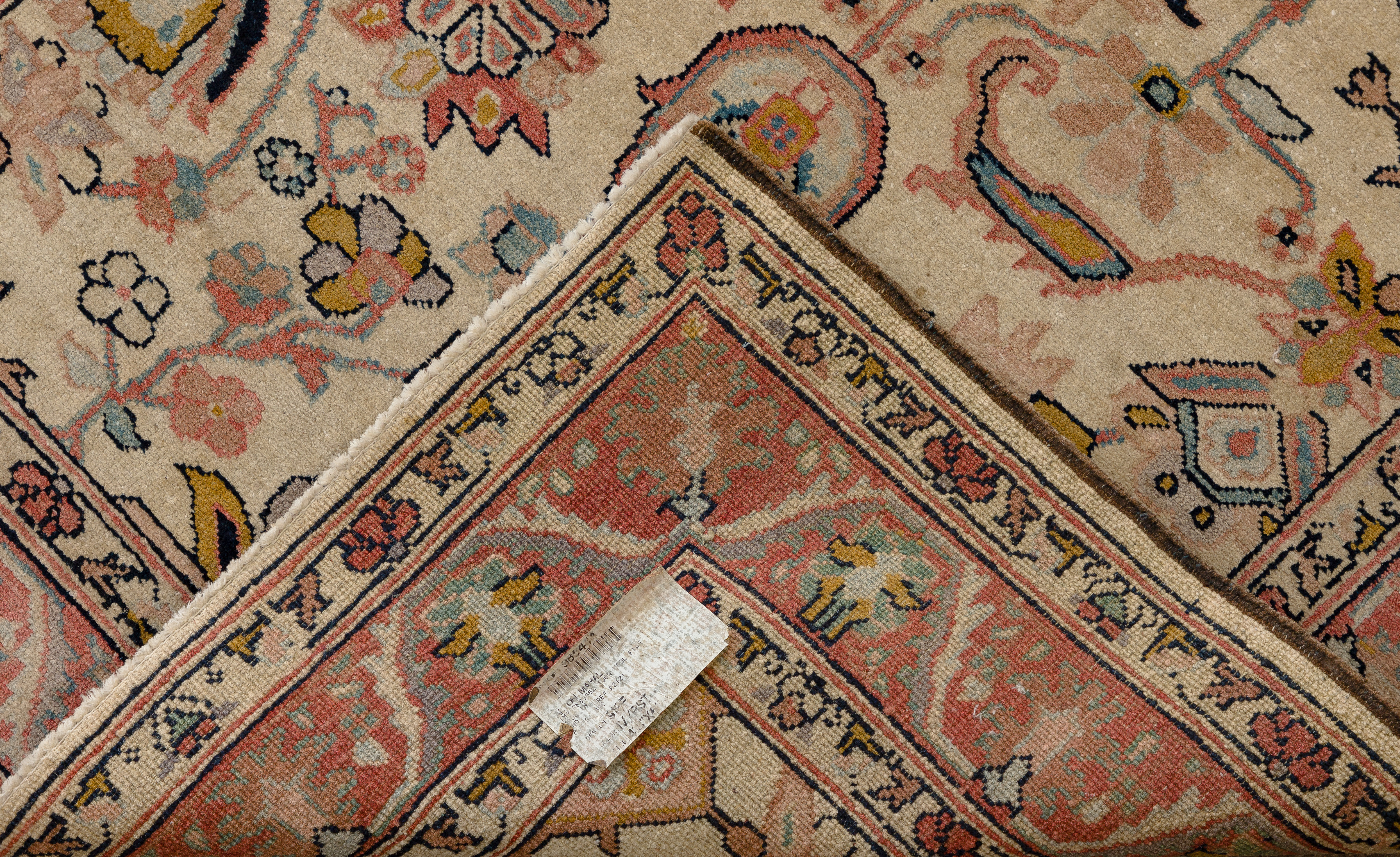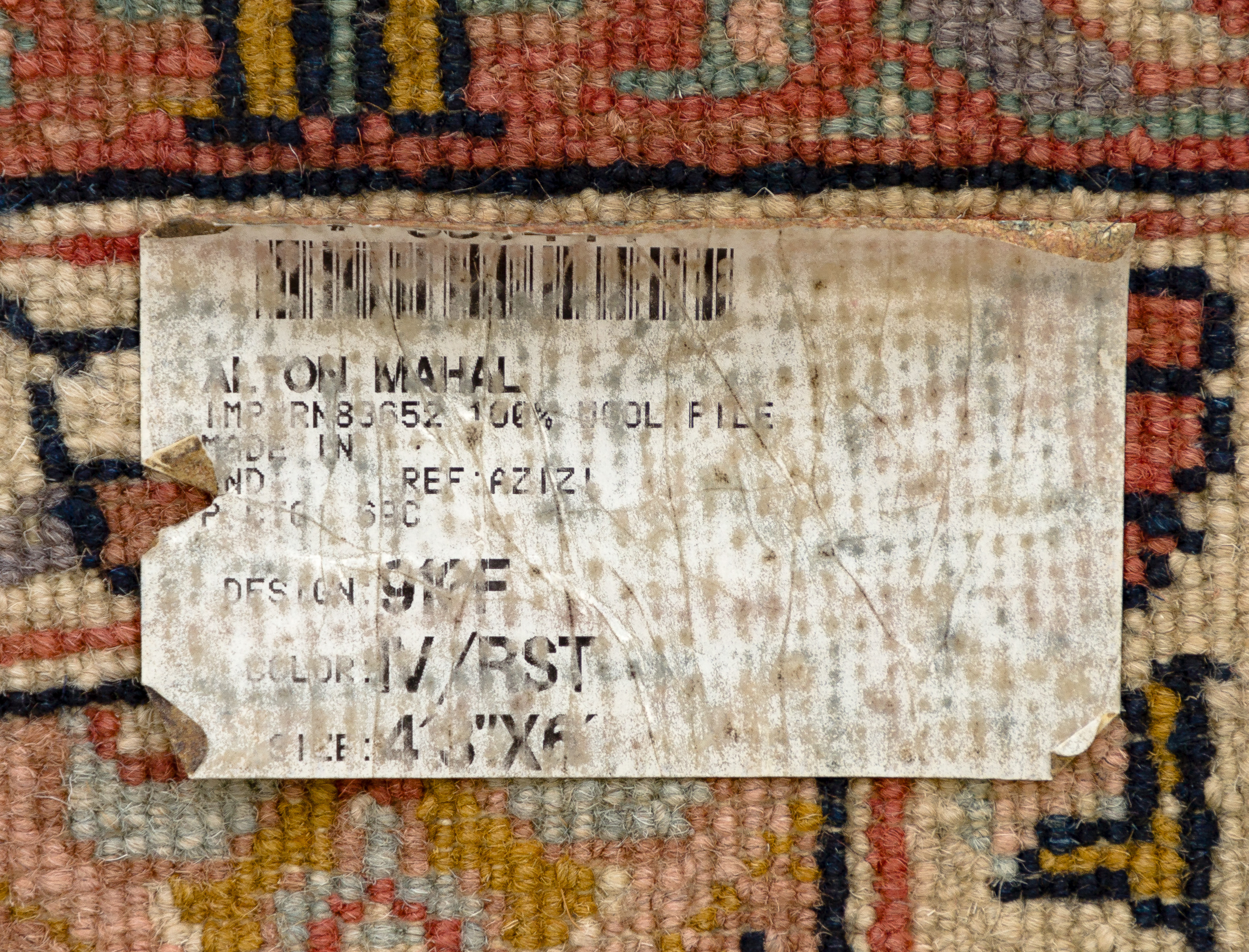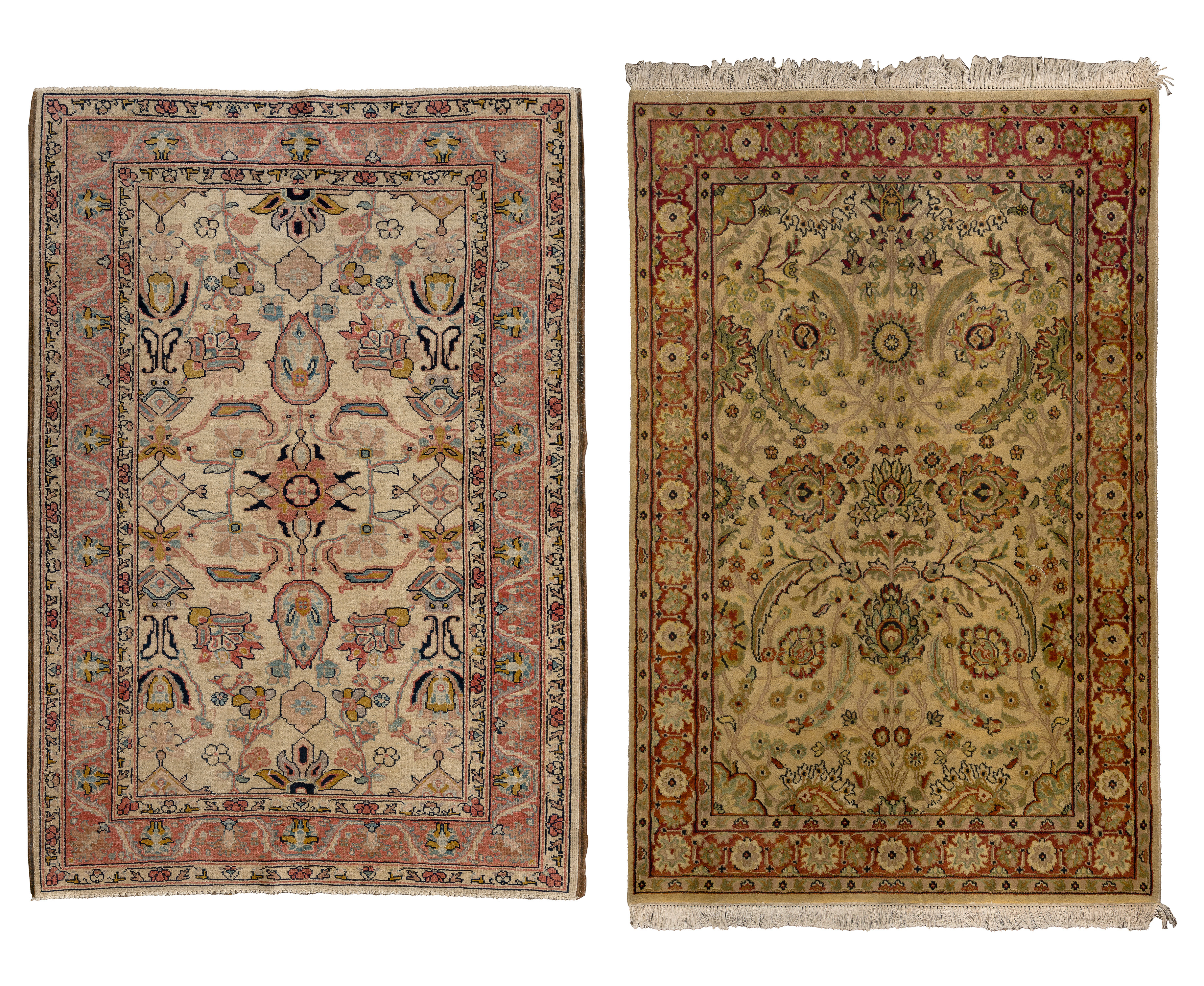(2) items including an abstract floral in hue of green, wine, tan and black on a cream field and an abstract floral in hues of pink, gold, blue and black on a cream field, retaining label, (6 ft. x 4ft. 2 in.)