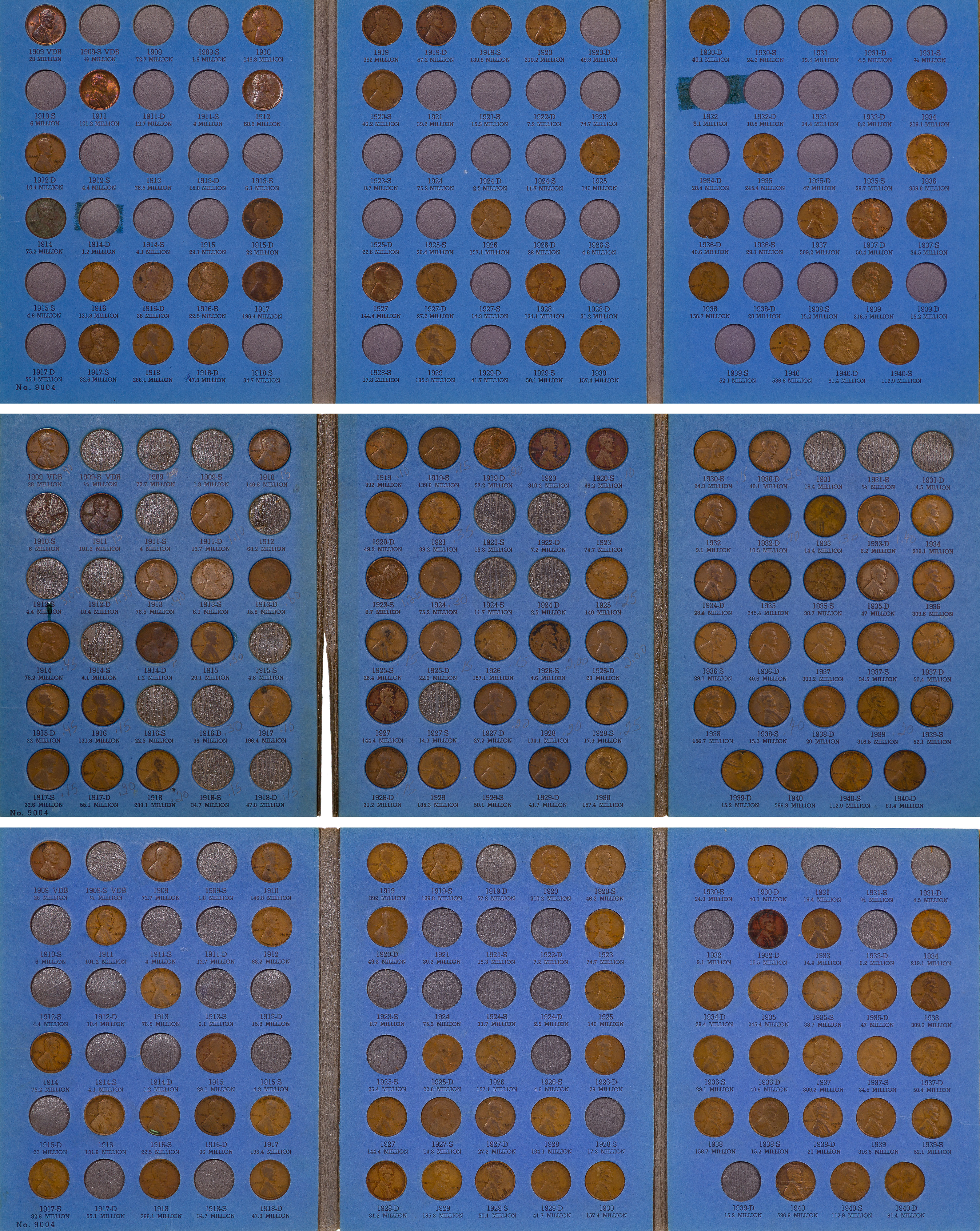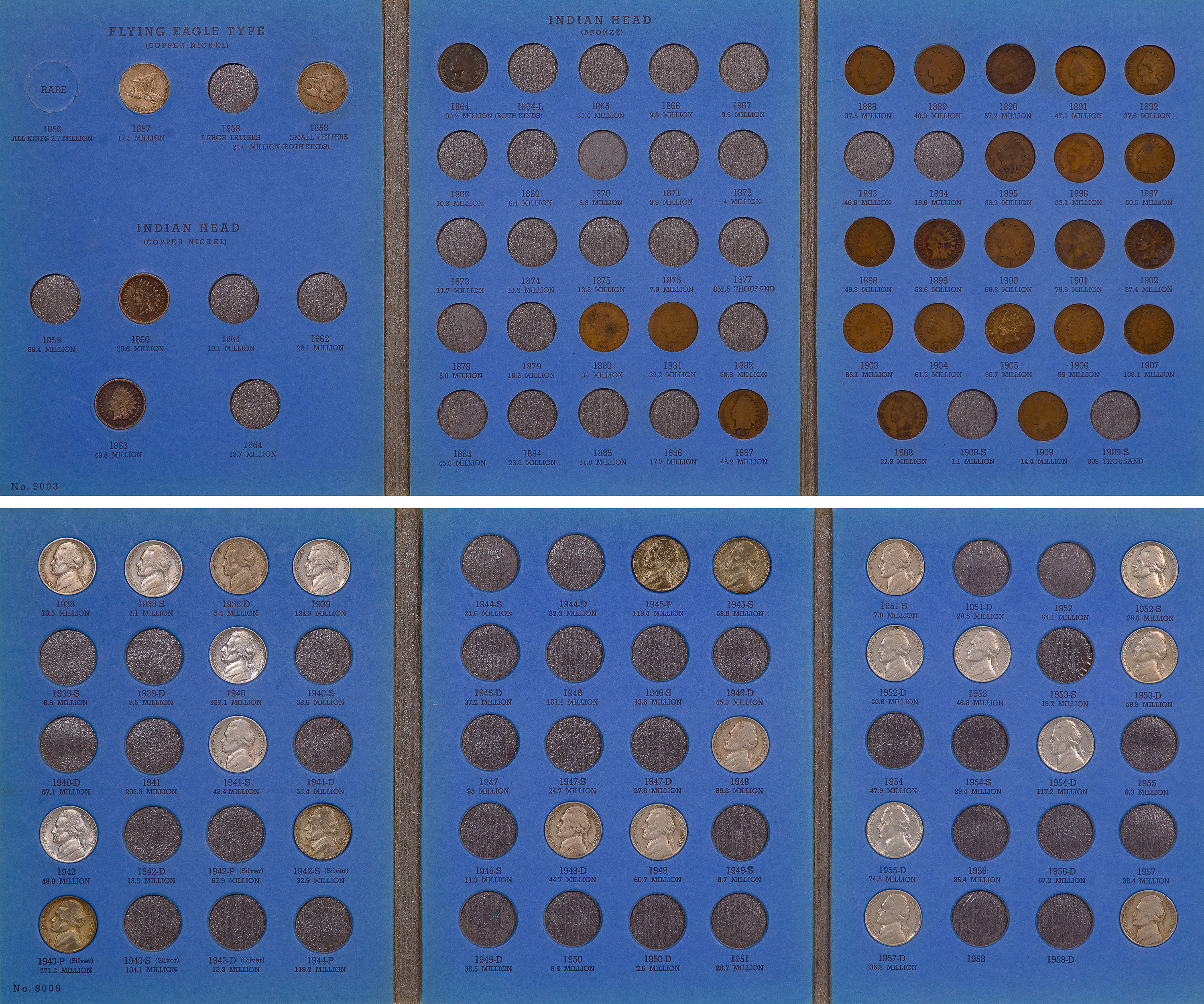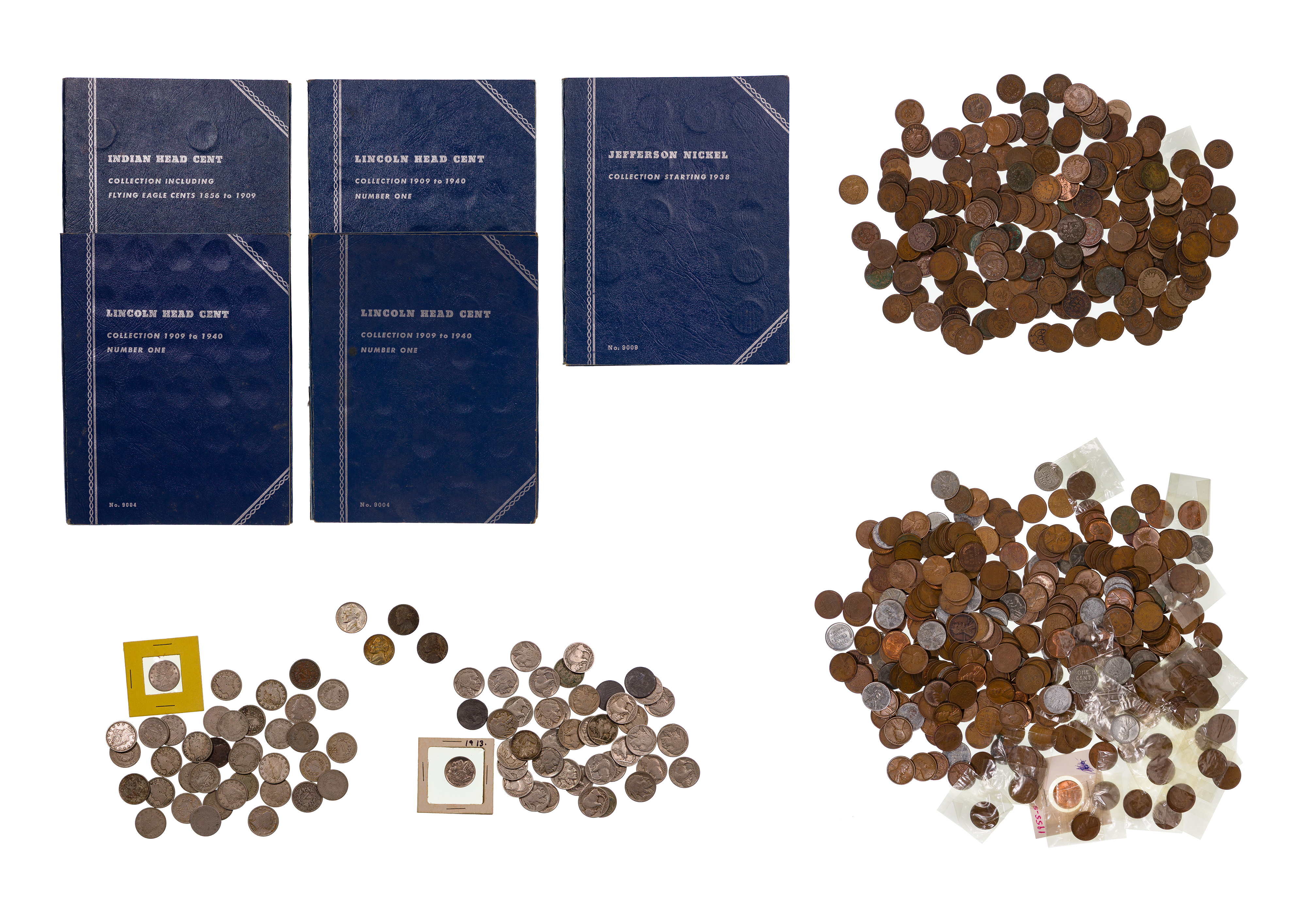 Including (215) Indian 1c, approximately (200) Wheat 1c, (37) Liberty 5c, (43) Buffalo 5c, (4) War Nickels and (5) partial set Whitman albums including Indian 1c, Wheat 1c and Jefferson 5c