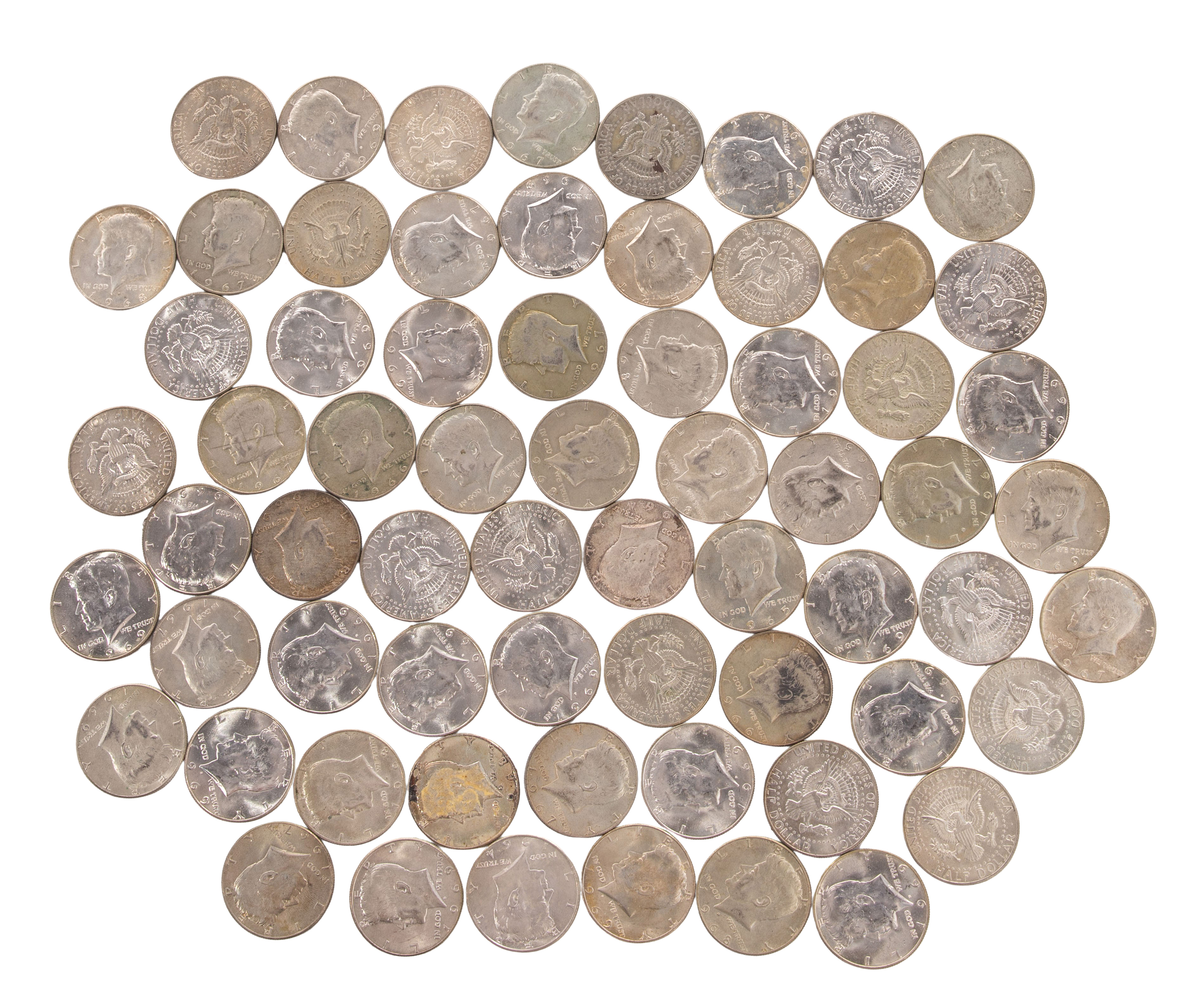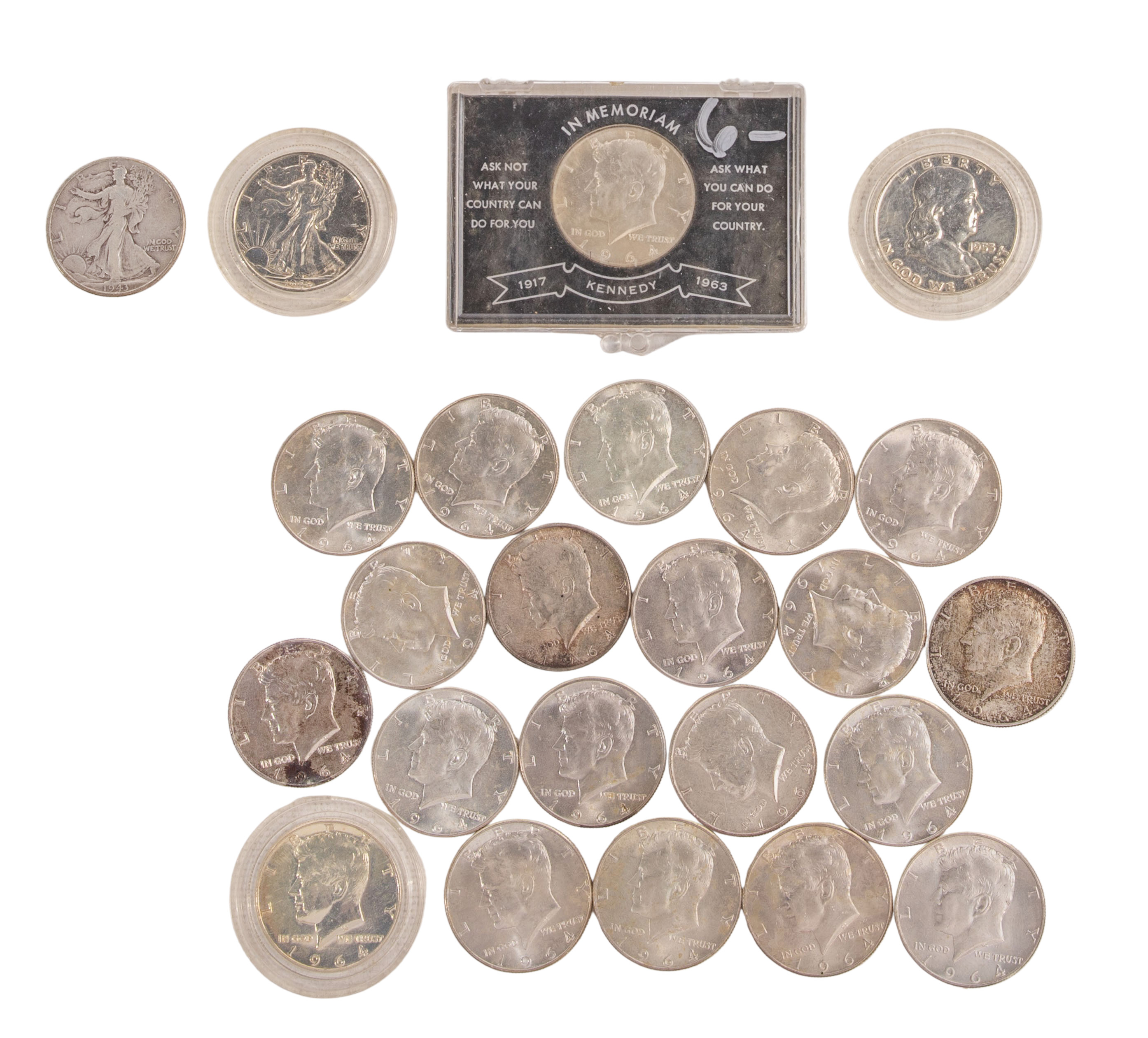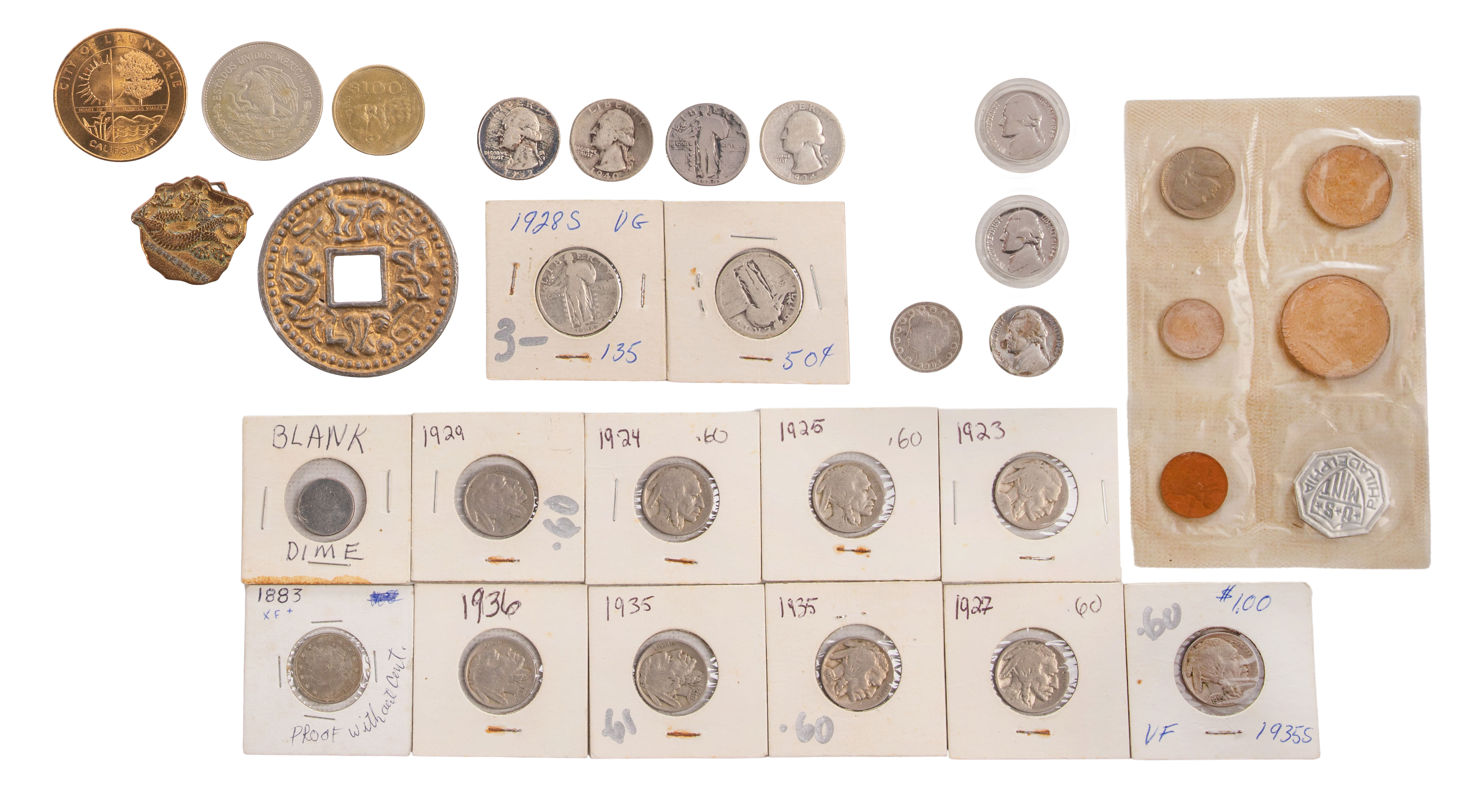$67.20 face value US 90% silver including (6) Morgan $1, (4) Peace $1, (2) Walking Liberty 50c, a Franklin 50c, (21) 1964 Kennedy 50c, (3) Standing Liberty 25c, (3) Washington 25c, a Barber 10c, (40) Mercury 10c and (381) Roosevelt 10c, $33.00 face value US 40% silver Kennedy 50c, a 1961 US mint set, (7) Buffalo 5c, (2) Liberty 5c, (3) war nickels, approximately (60) wheat 1c, (5) US 0.999 silver 1 oz. rounds, a 1972 0.999 1oz. silver Universario world trade coin; together with assorted foreign coins and tokens