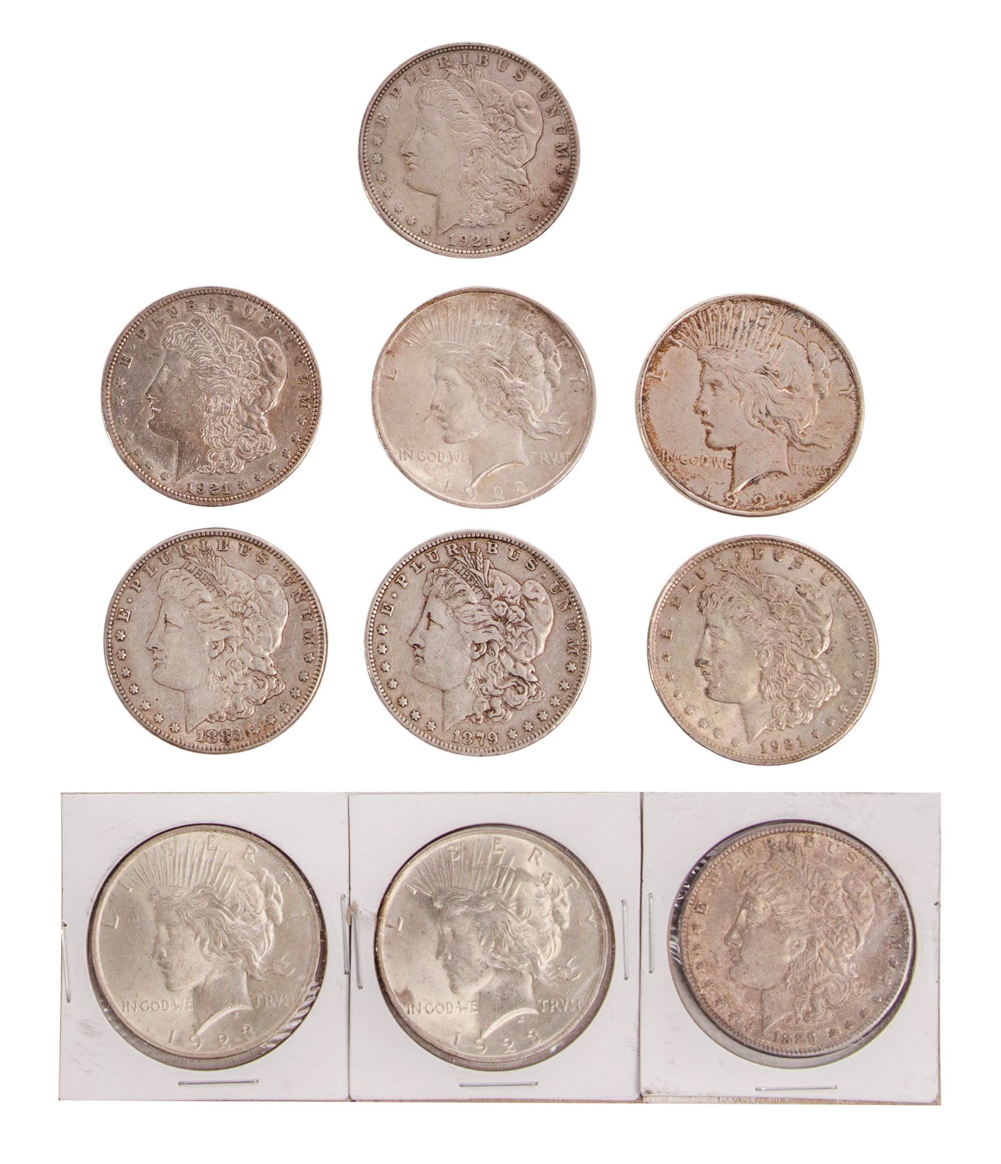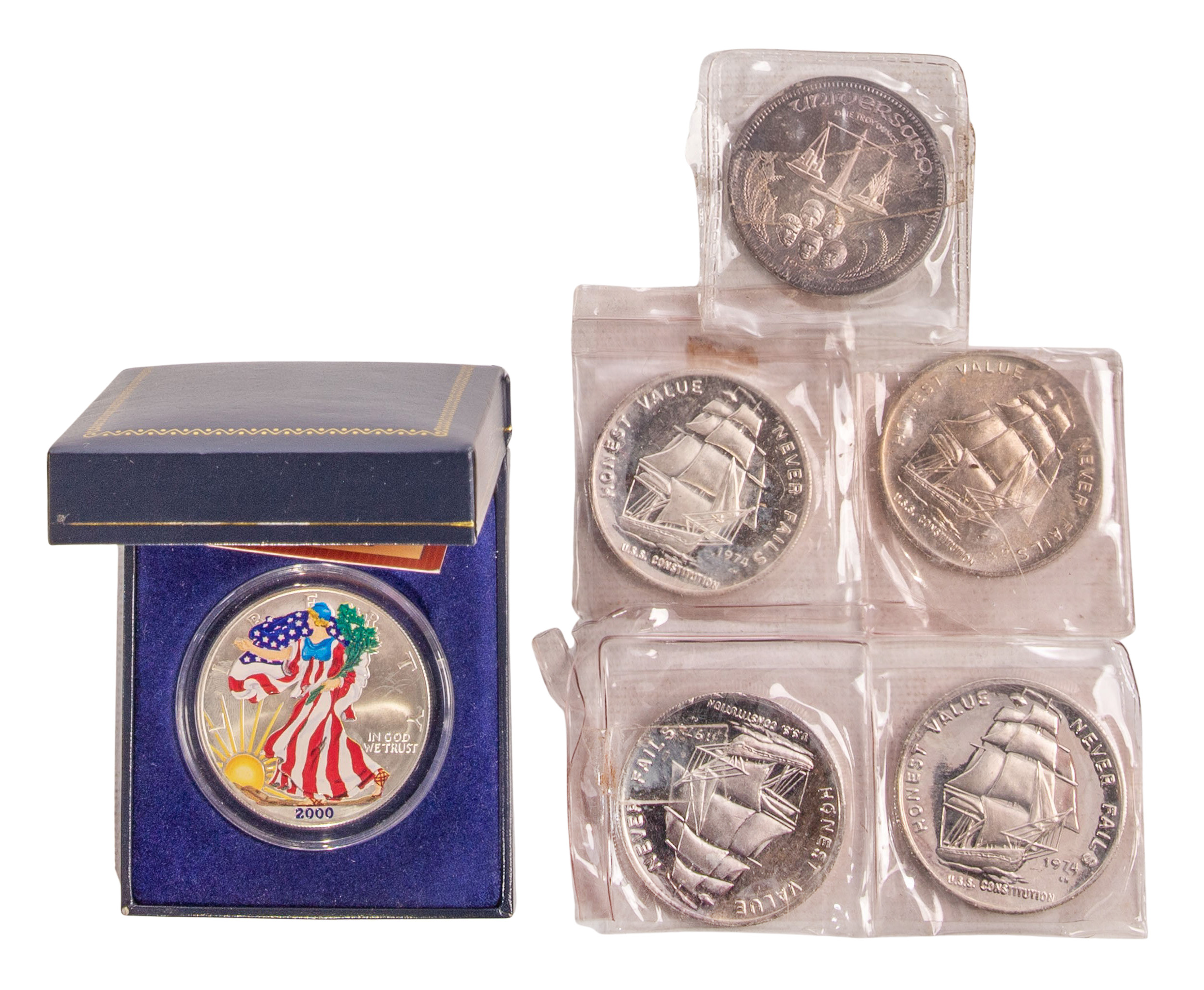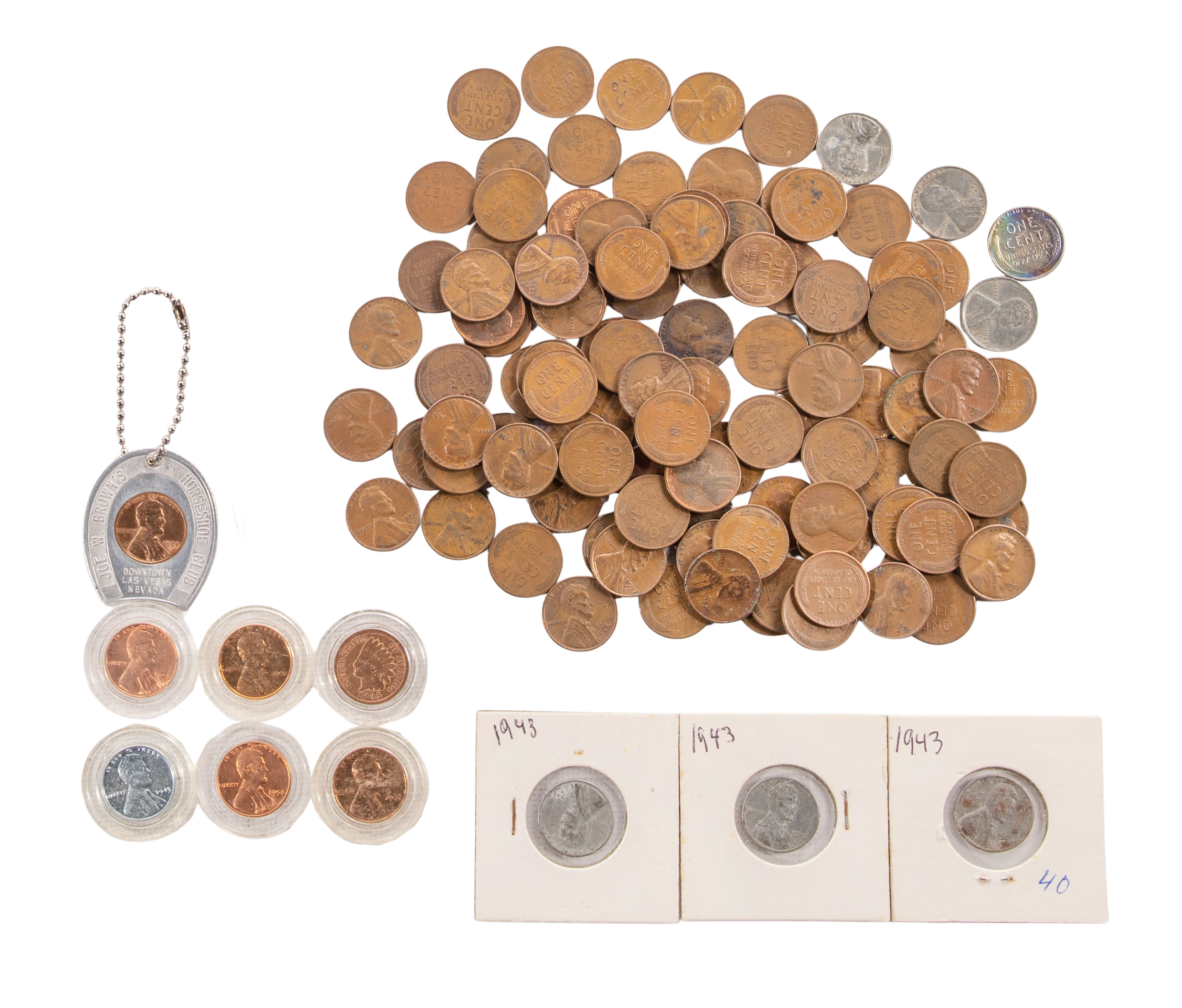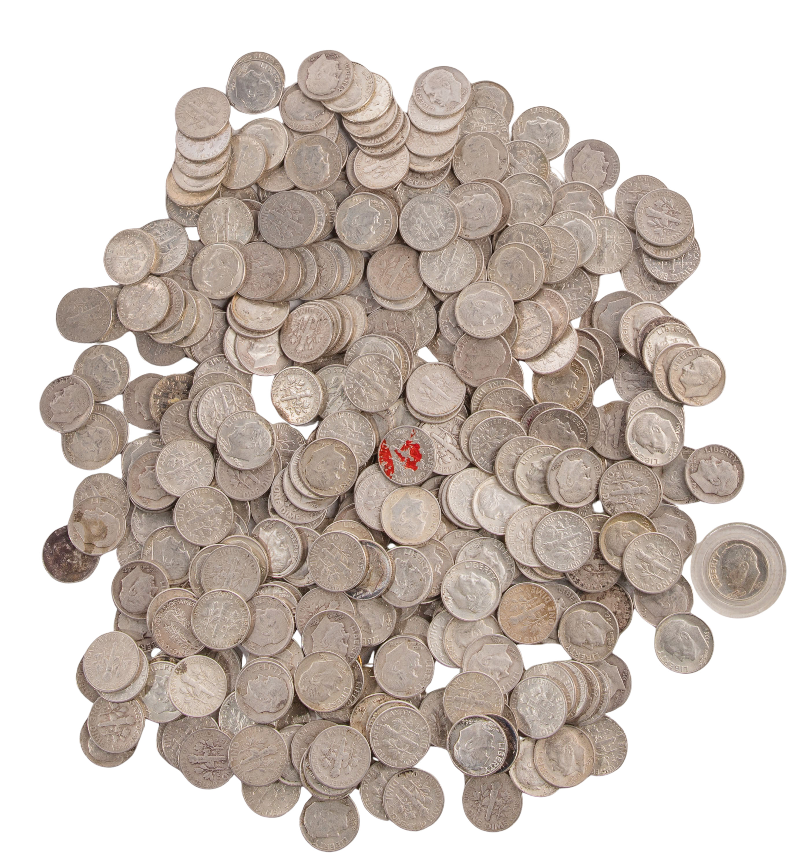 $67.20 face value US 90% silver including (6) Morgan $1, (4) Peace $1, (2) Walking Liberty 50c, a Franklin 50c, (21) 1964 Kennedy 50c, (3) Standing Liberty 25c, (3) Washington 25c, a Barber 10c, (40) Mercury 10c and (381) Roosevelt 10c, $33.00 face value US 40% silver Kennedy 50c, a 1961 US mint set, (7) Buffalo 5c, (2) Liberty 5c, (3) war nickels, approximately (60) wheat 1c, (5) US 0.999 silver 1 oz. rounds, a 1972 0.999 1oz. silver Universario world trade coin; together with assorted foreign coins and tokens