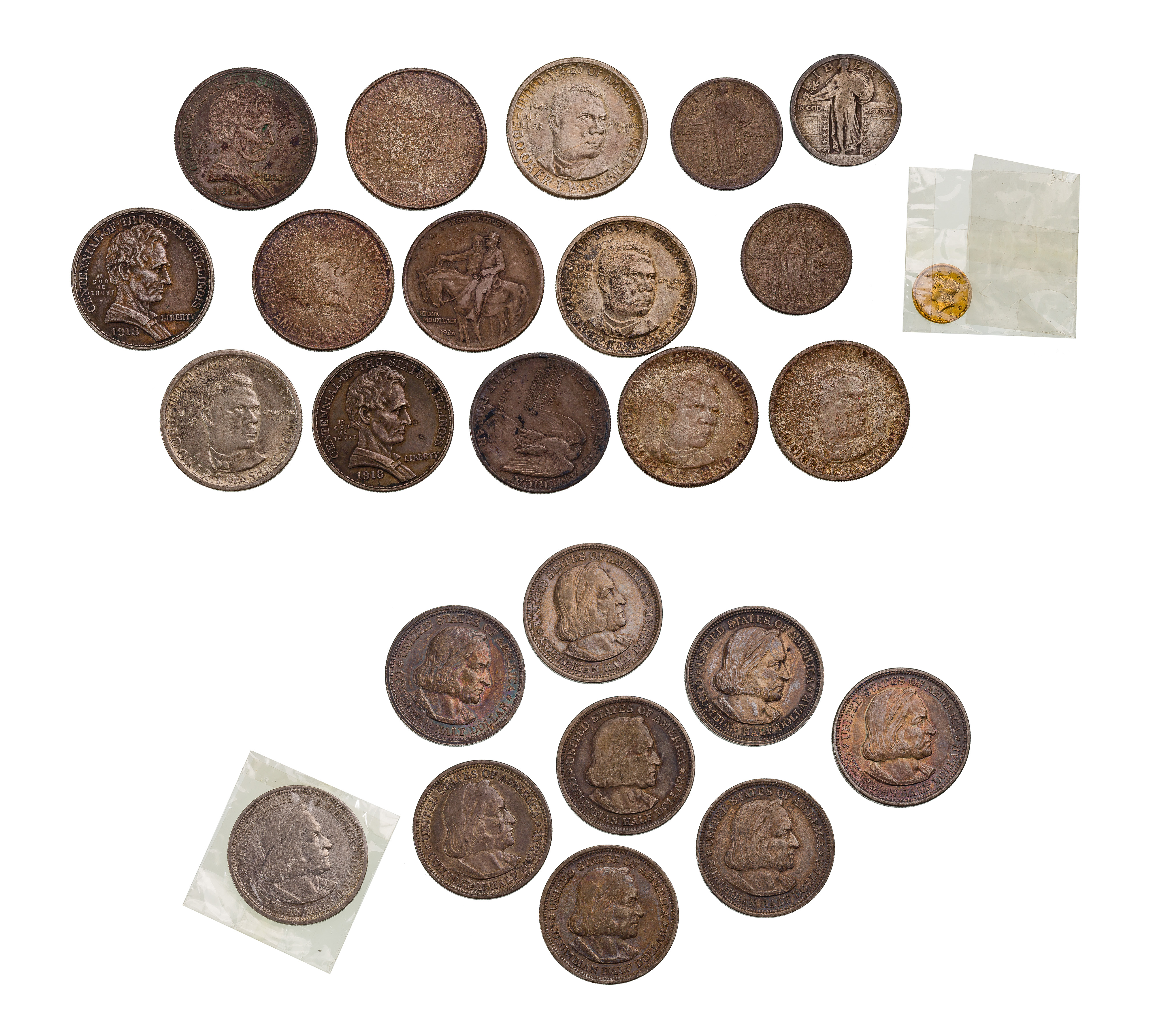 Including (9) 50c from 1893 Columbian Exposition, (3) 1918 Lincoln, (2) 1925 Stone Mountain, (5) 1946 Booker T. Washington and (2) 1952 Carver / Washington; together with a $1 gold ex-jewelry (no date) and (3) 1917 Standing Liberty 25c