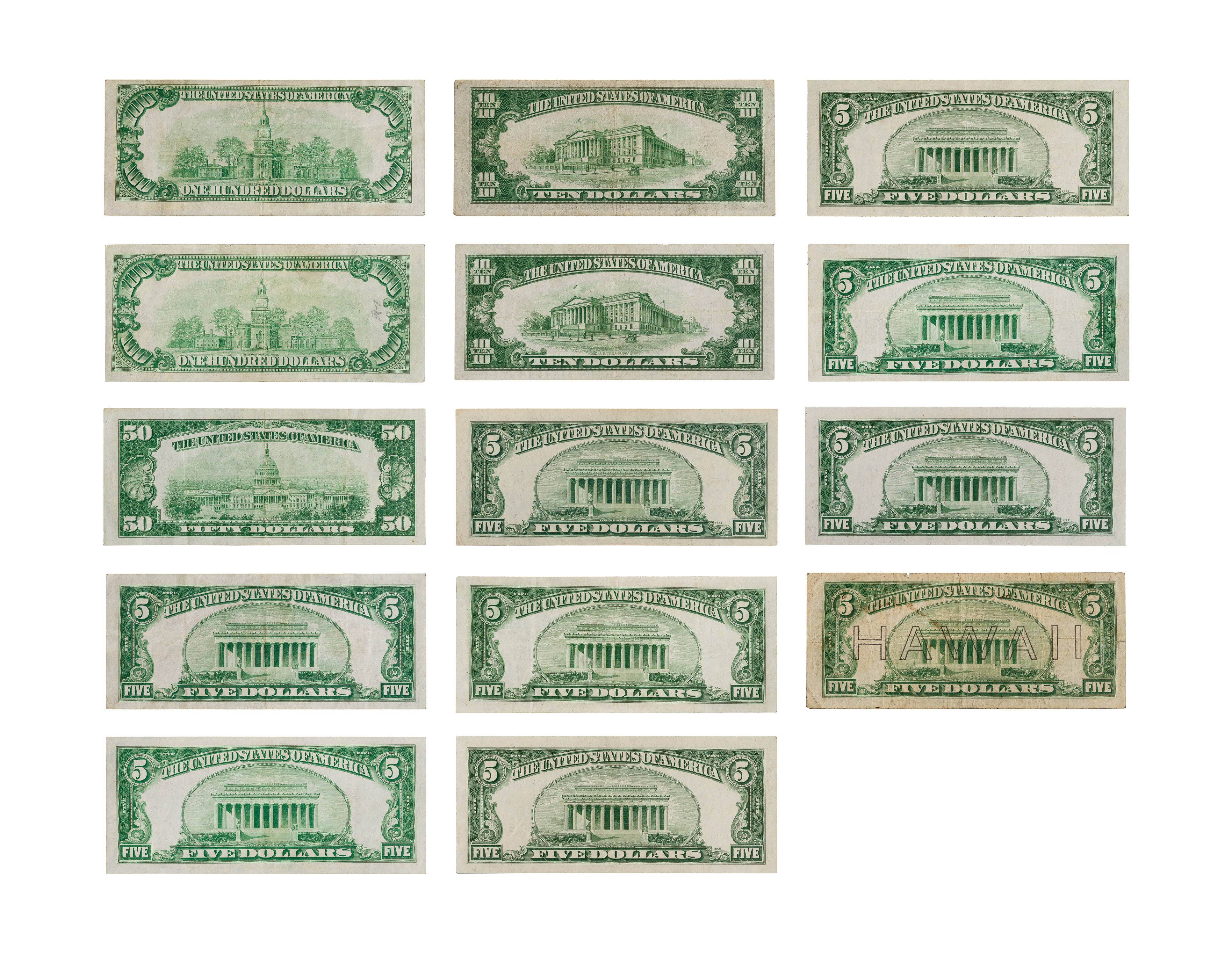 Including a 1929 $100 Chicago national, a 1928-A $100, a 1928-A $50, (2) 1934-A North Africa $10, (5) 1928-A $5, (2) 1934-D $5 and a 1934-D Hawaii $5