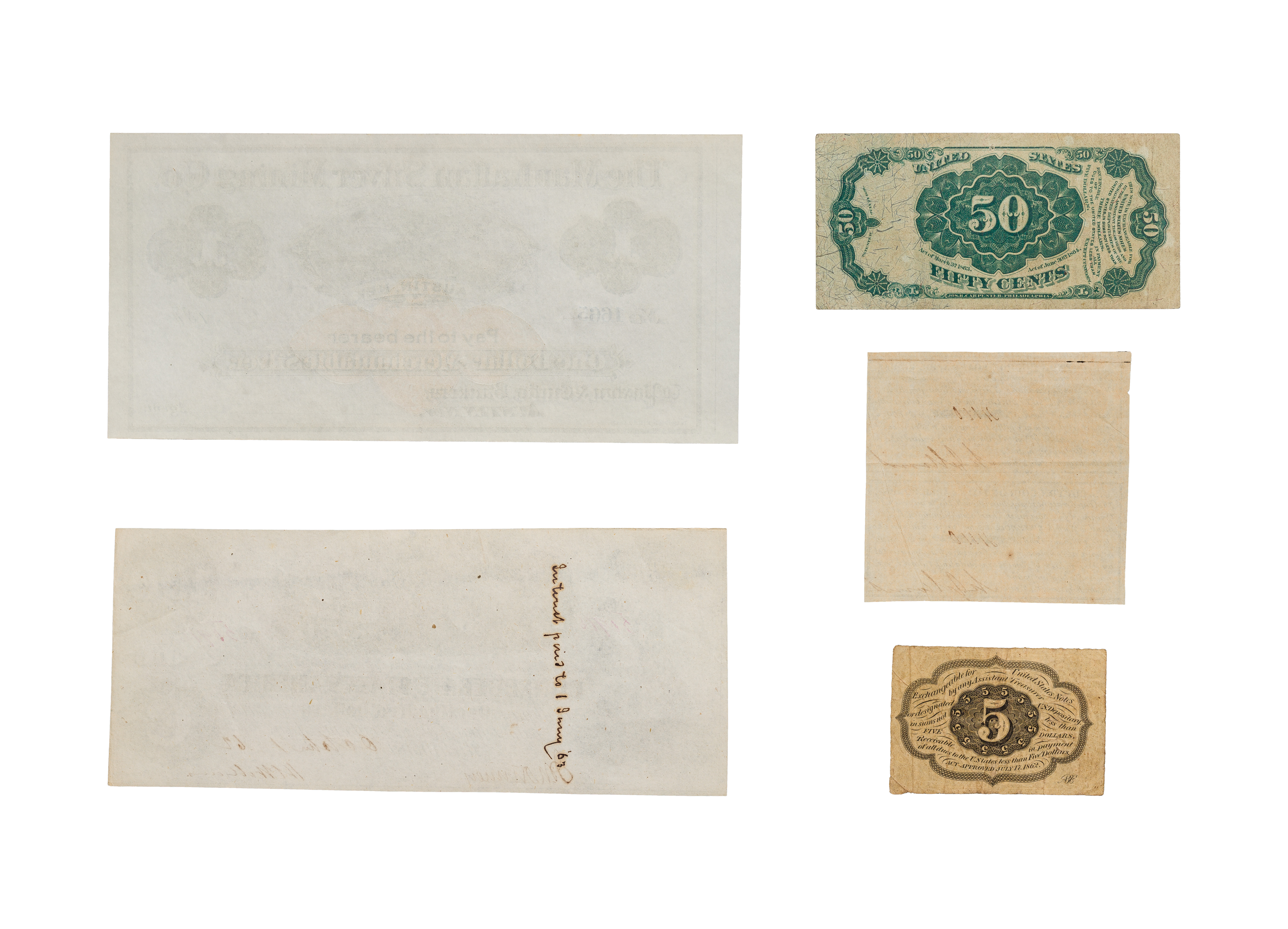Including an 1875 50c, a 5c postage, an 1862 C.S.A. $100, (2) 1863 C.S. Cotton Loan uncut coupons and an non-issued circa 1870s ‘The Manhattan Silver Mining Co’ Austin, Nevada remainder bearer note